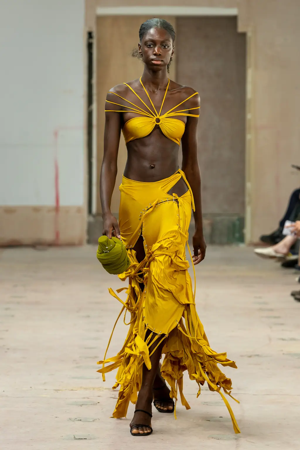 Showing under the British Fashion Council’s Newgen umbrella, Feben’s SS23 collection certainly played well to the room – her quick bow at the end met with much hooting and hollering. The Central Saint Martins graduate had layered her work with hidden meaning – a post-show press release imploring you to “take a moment to read” the prints echoing specific tarot cards and passages of Georges Bataille’s very sexy Story of the Eye (it’s French). For the short sighted, however, there was still much to take away: from the designer’s signature twists to the bums poking out from beaded fringe dresses. Sacré bleu.