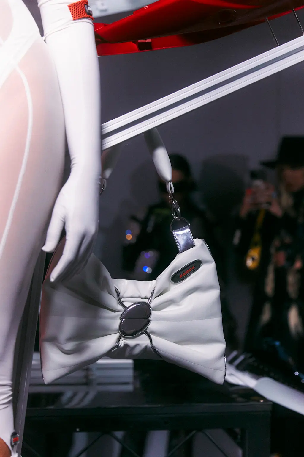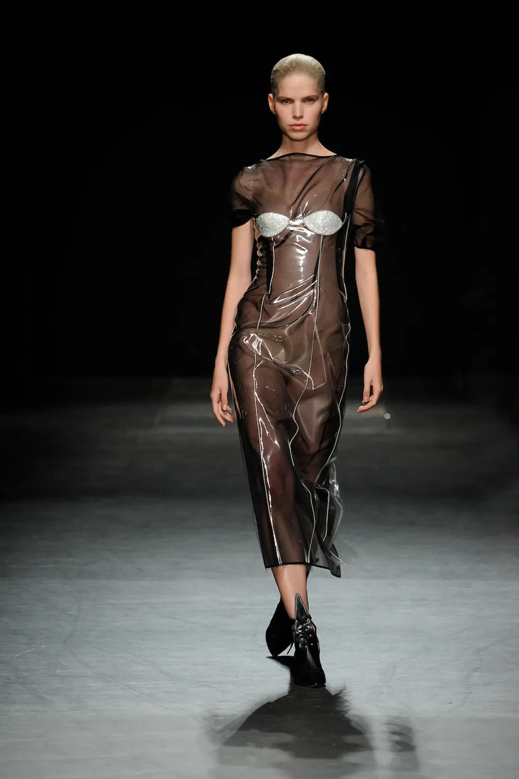 The details were practical and impractical – yet another beautiful oxymoron that permeates Kane’s work – from the magnitude of clear vinyl buckle-up straps and silk pieces pieces detailed with oversized metal trigger clips, to a series of long dresses with their trains held at hip height by way of a metal handle and shoes with blade-like points. BM