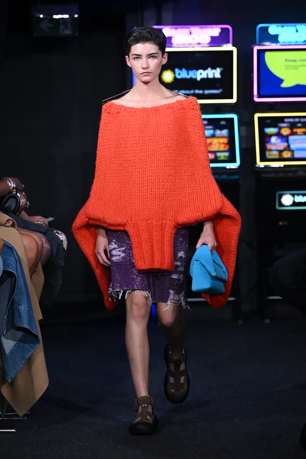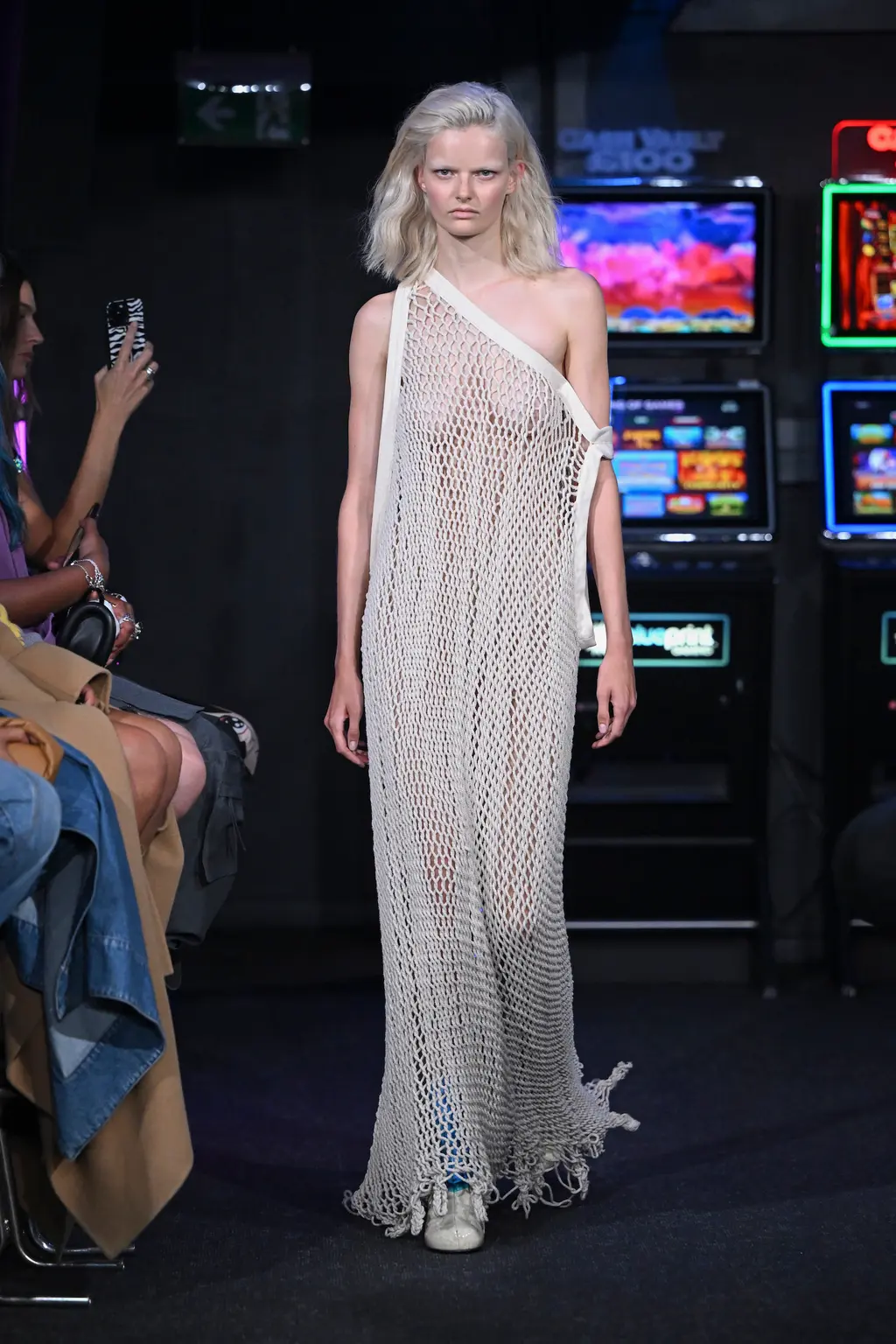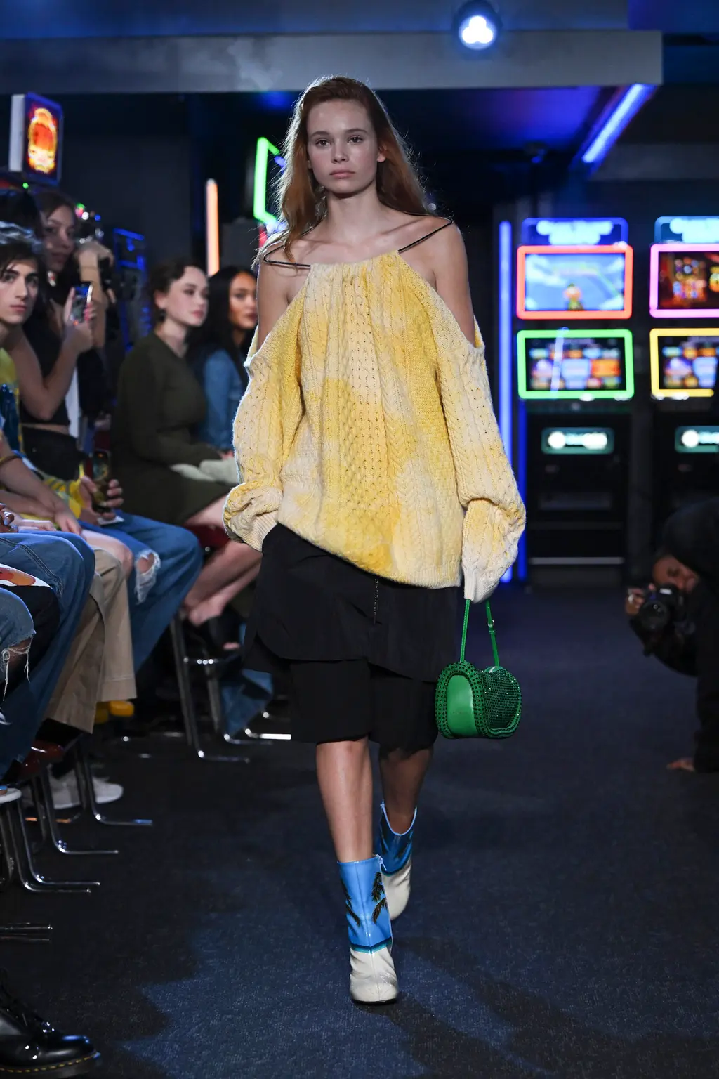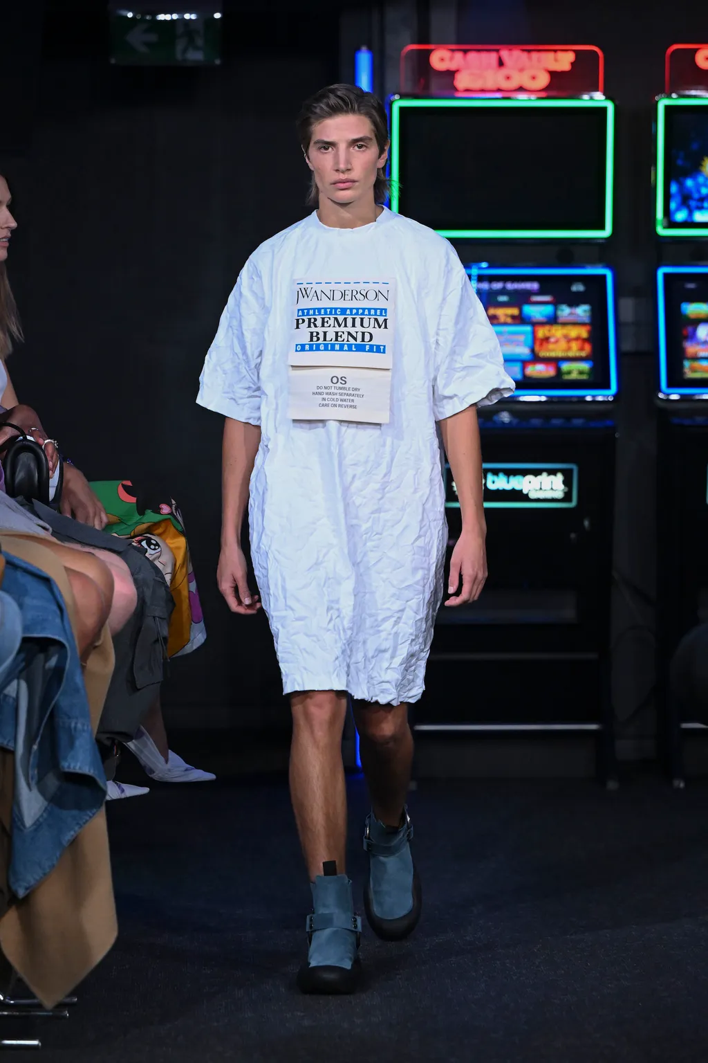 Considering it took place inside a literal arcade, the venue for JW Anderson’s SS23 collection wasn’t too much of a gamble. It was, after all, next door to the designer’s London boutique (a mere 62 metre walk according to Google Maps). Filled with shoot ’em ups and driving machines, the gaming setting felt fitting for a show that explored ideas of other worlds. “Are we falling into the screens? Are we becoming our phones? Is this interesting? Is it art??” asked a fairly existential Jonathan Anderson backstage.