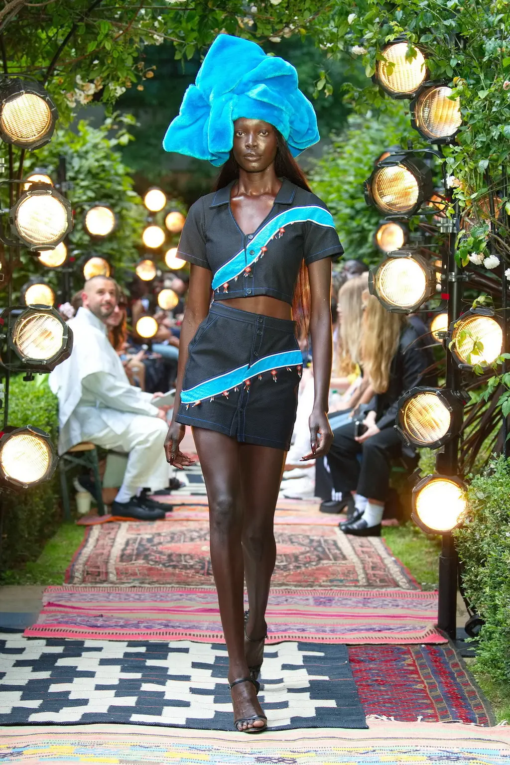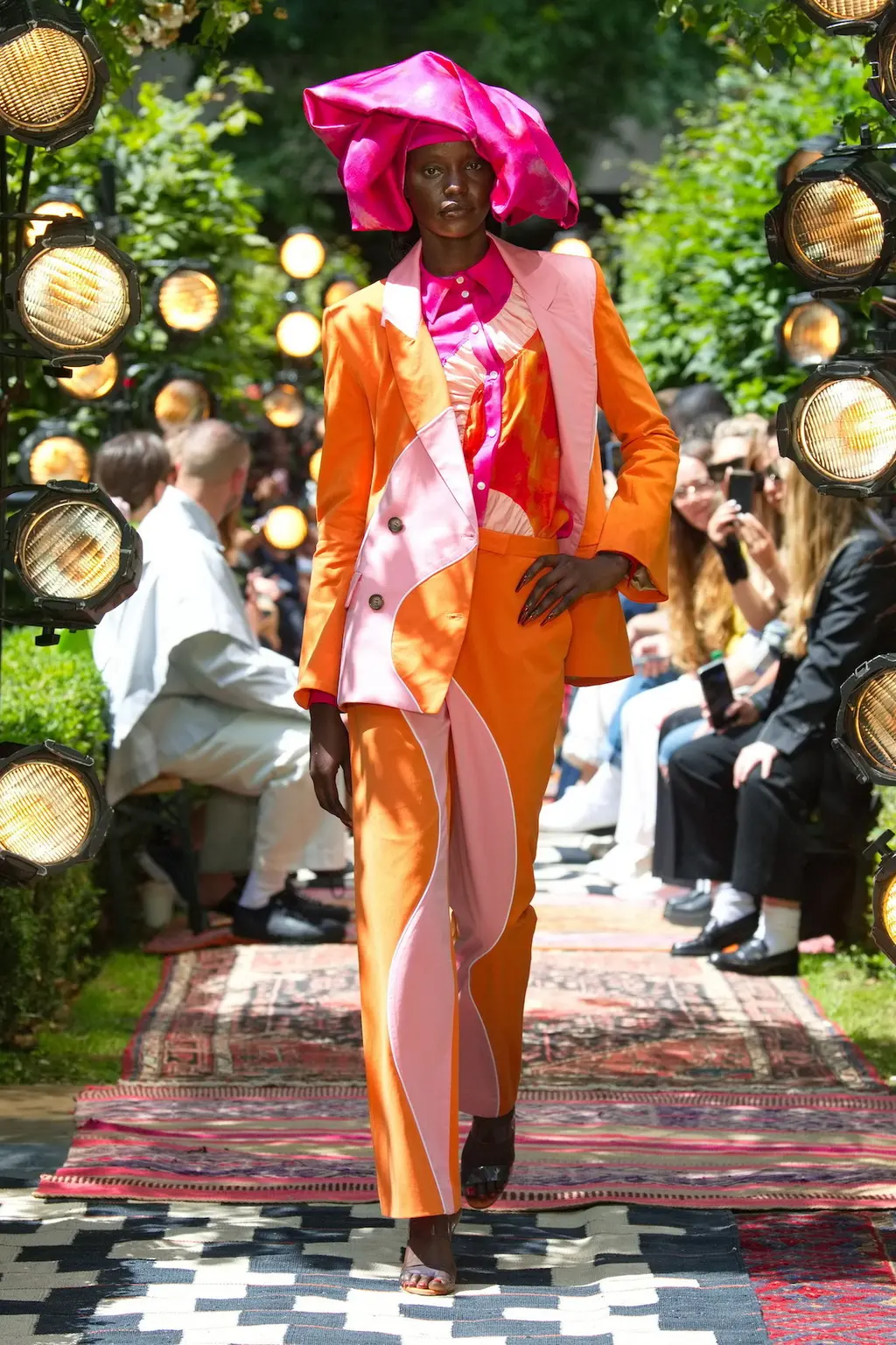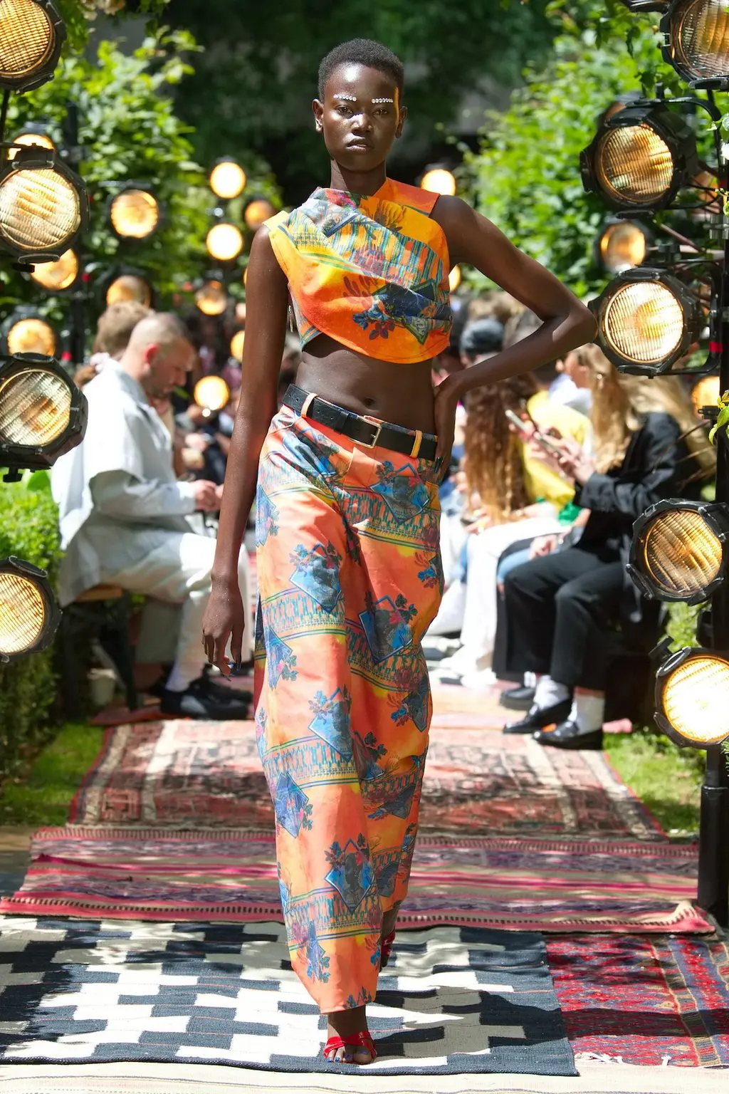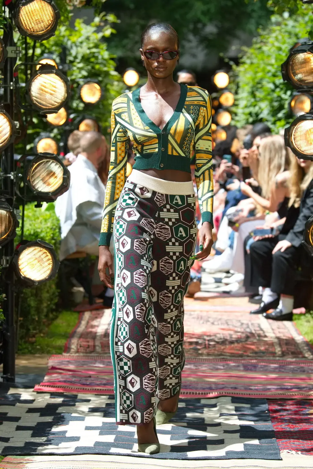 Where Priya Ahluwalia’s eponymous brand typically references a hybrid of her Nigerian and Indian heritage, this season was a deep-dive into Africa – a beautiful retelling of the continent’s many cultures, the magnificence of its landscapes and the rich history of its influence in film, music and style. Africa is Limitless was Ahluwalia’s love letter to the continent’s diverse thinkers, teachers and its outward-facing future. The collection was optimistic, as the creative director interpreted a wealth of research: the beaded elements from Kenyan and Rwandan cultures; the technicolour palettes of the Sapeurs subculture in The Congo’s Brazzaville and Kinshasa cities; the vibrant album covers of musicians from Côte d’Ivoire; the heady patterns found in traditional Tunisian blankets. The SS23 collection fluidly crossed the continent, with patterned jersey dresses, high-octane pops of orange and pink, sultry ombre effects and traditional headdresses. Here, Ahluwalia recontextualizes Africa, away from the mass media’s often misinformed narratives, and ends up with a trans-continental patchwork of cultural influences.