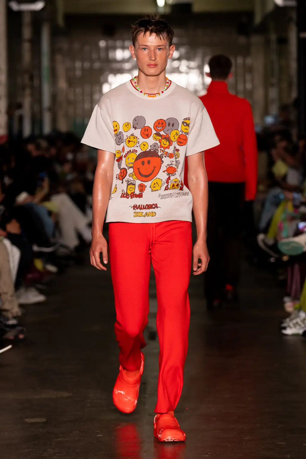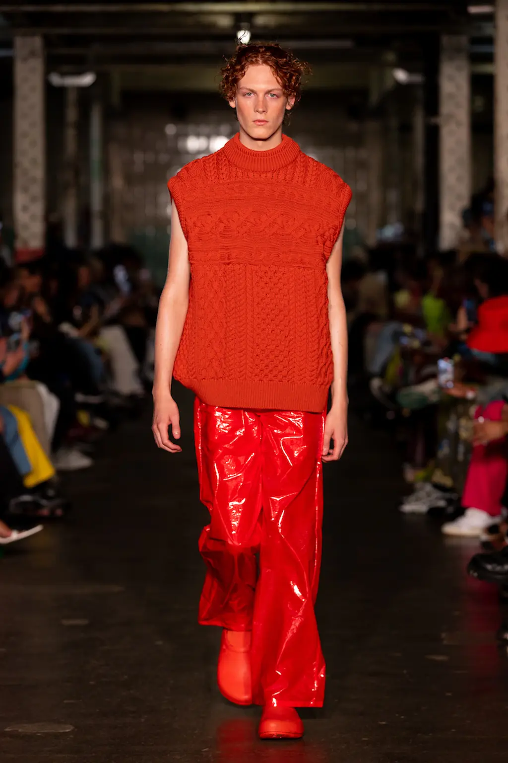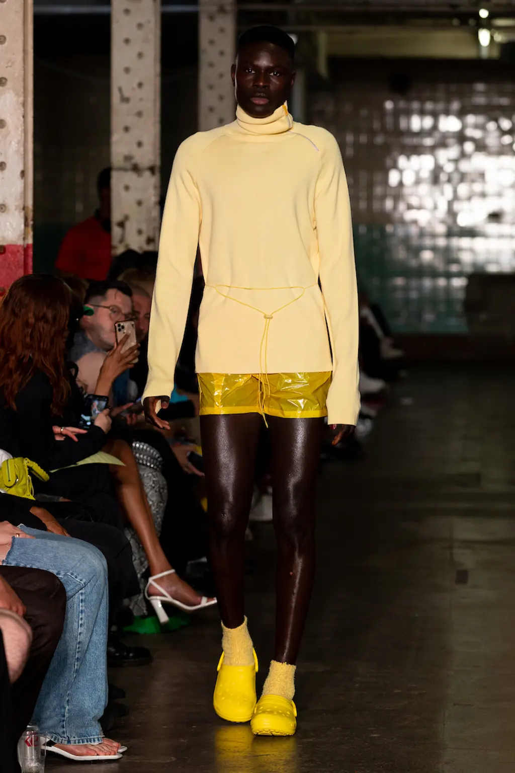 One of them ended up inspiring this collection’s best piece: a T‑shirt with “I caught crabs in Brighton” (crabs with claws, obviously). Elsewhere, Lynch continued her strong tendency for vibrant, kick-you-in-the-face colours – this time, in acid red or yellow: semi-transparent nylon trousers, sleeveless knitted vests, mini shorts, nylon sports jackets and mid-shorts. Perma-tans, Crocs and beaded necklaces accessorised throughout, and left us gagging for a fishbowl down the strip.