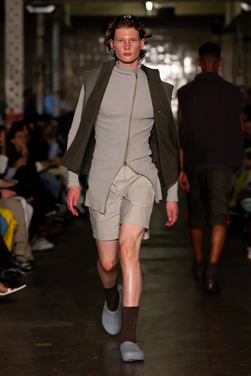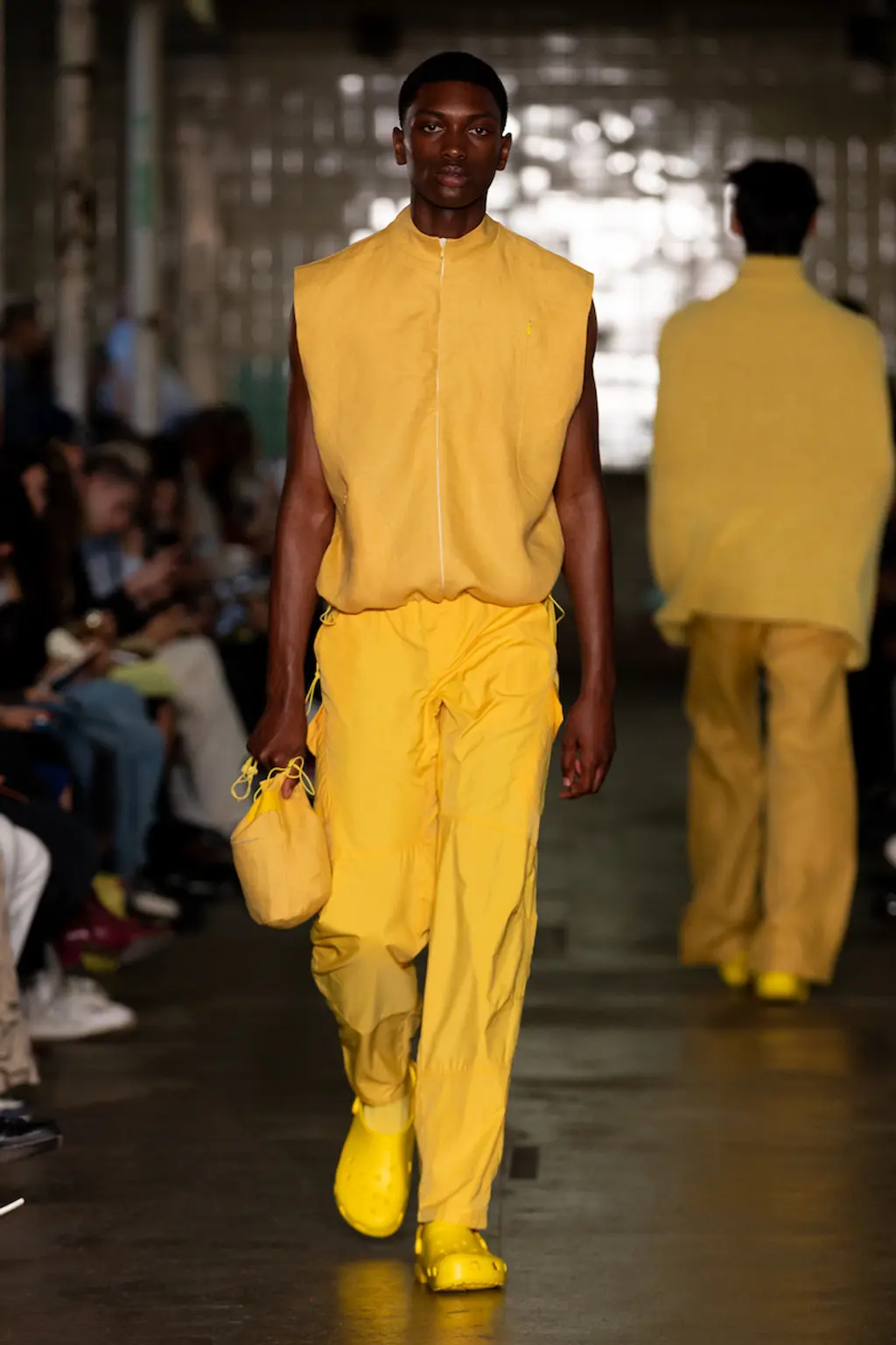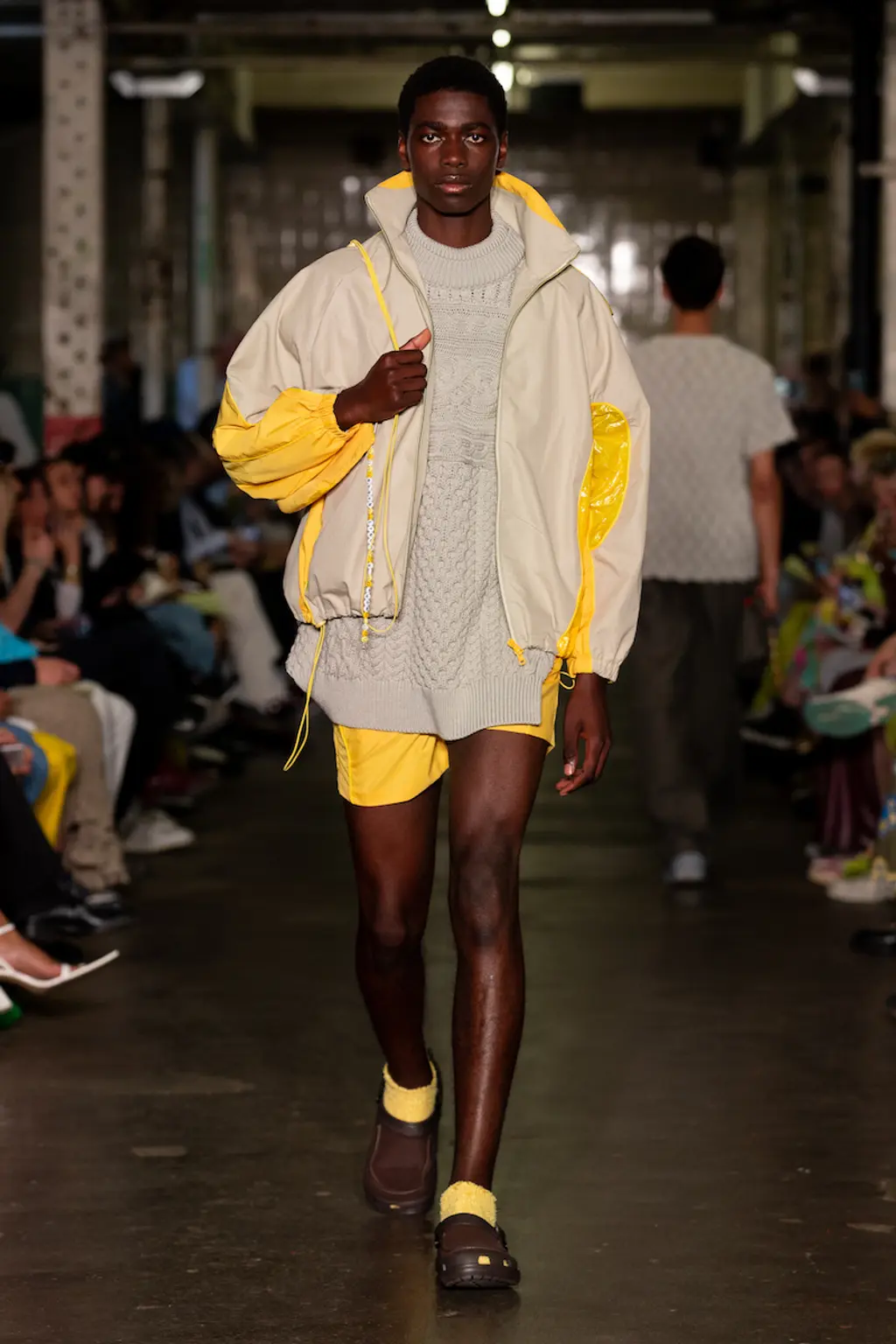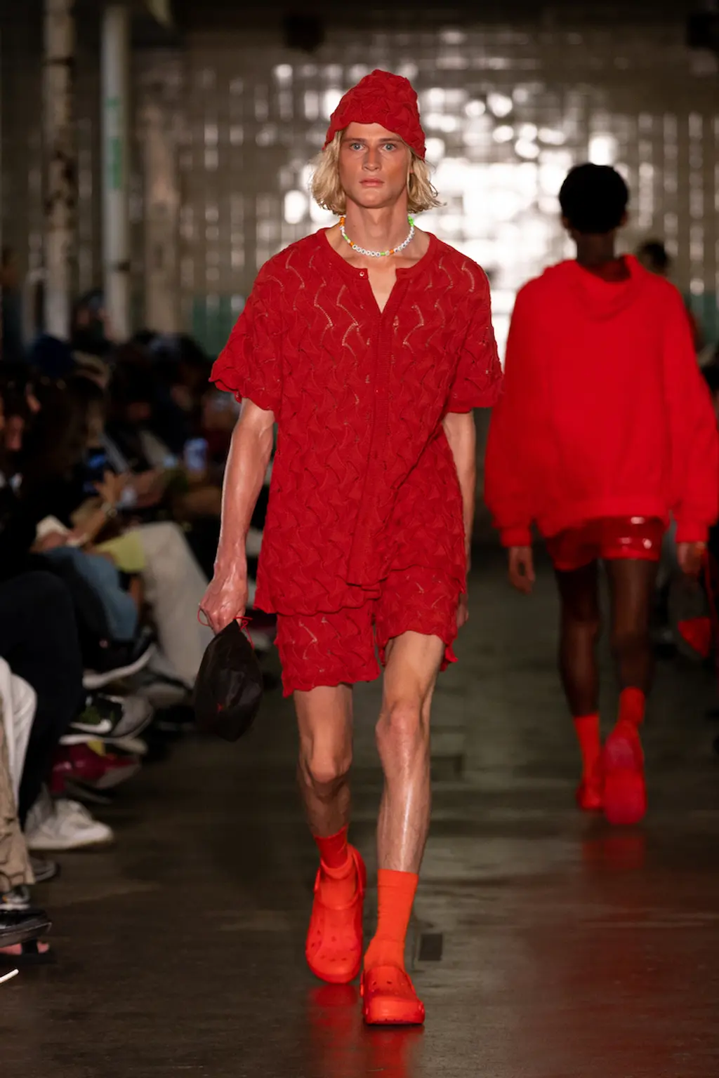 One of them ended up inspiring this collection’s best piece: a T‑shirt with “I caught crabs in Brighton” (crabs with claws, obviously). Elsewhere, Lynch continued her strong tendency for vibrant, kick-you-in-the-face colours – this time, in acid red or yellow: semi-transparent nylon trousers, sleeveless knitted vests, mini shorts, nylon sports jackets and mid-shorts. Perma-tans, Crocs and beaded necklaces accessorised throughout, and left us gagging for a fishbowl down the strip.