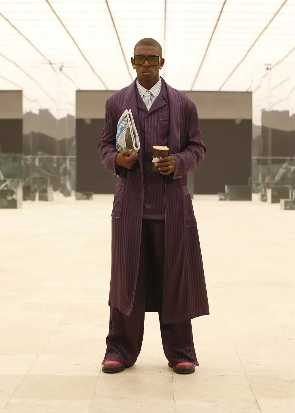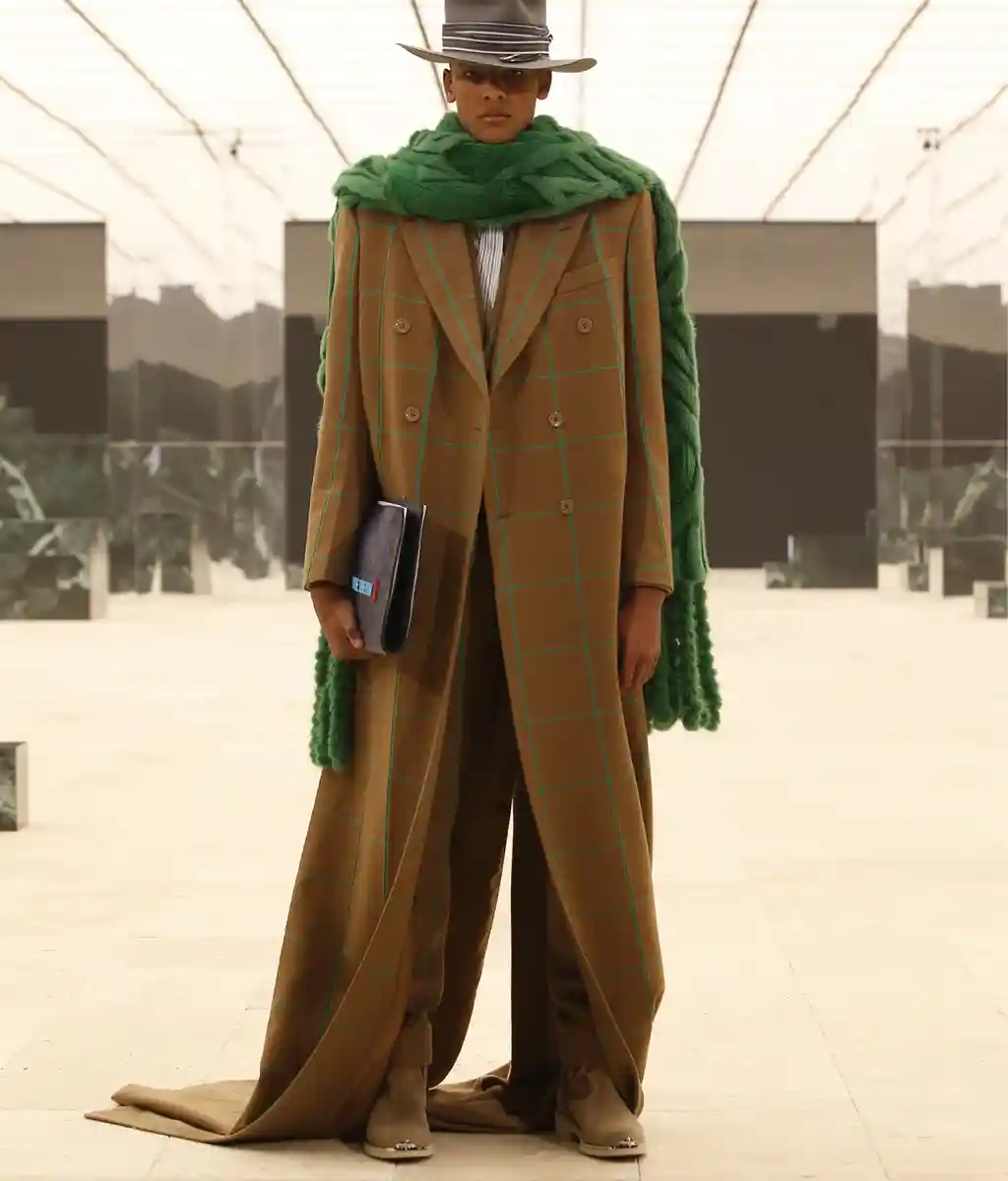 The zoot suit – worn by poet, activist and first-ever Black trans model to walk in a Vuitton show – was transformed: slickly tailored with freeing trousers and razor-sharp shoulders – a power-play worn with dark-lens sunglasses. The Kente cloth – close to Abloh’s Ghanian roots – was depicted in tartan, a pattern associated with Scotland that worked its way onto a heavily lined evening coat. Volumised fur coats, wide-rimmed trilbies and a deconstructed menswear take on a traditional dashiki – a highly patterned style of dress often worn traditionally worn by women in Kenya, Somalia and Tanzania – optimised Abloh’s quest to break the boundaries of who wears what and why, uplifting his wearers through opulent cuts and extravagant shapes.