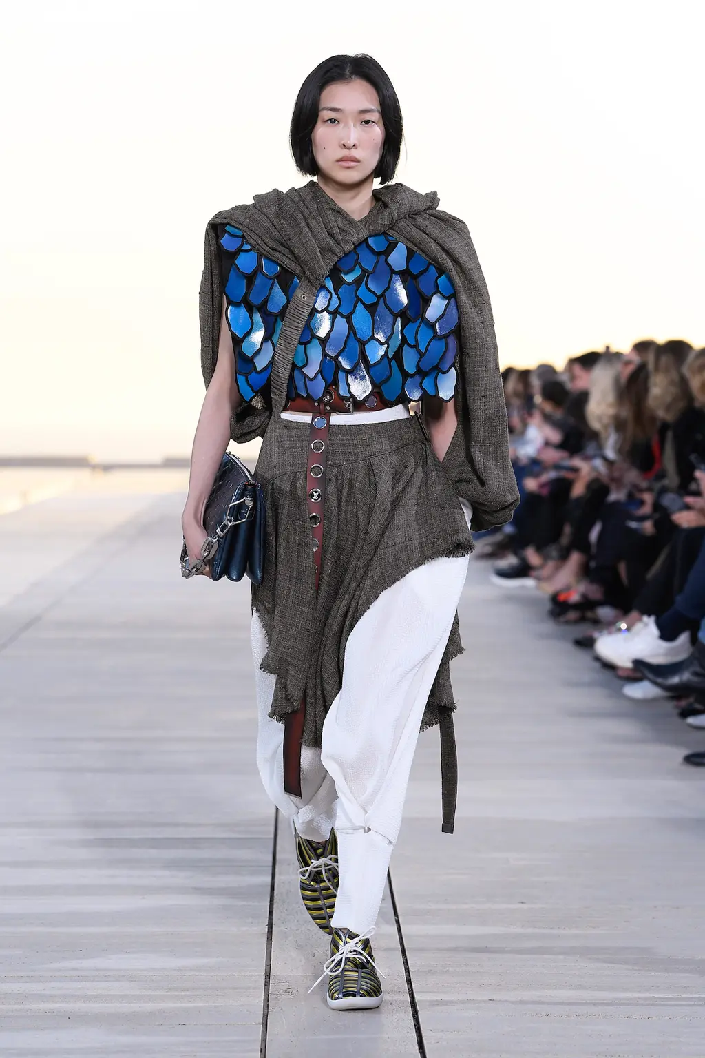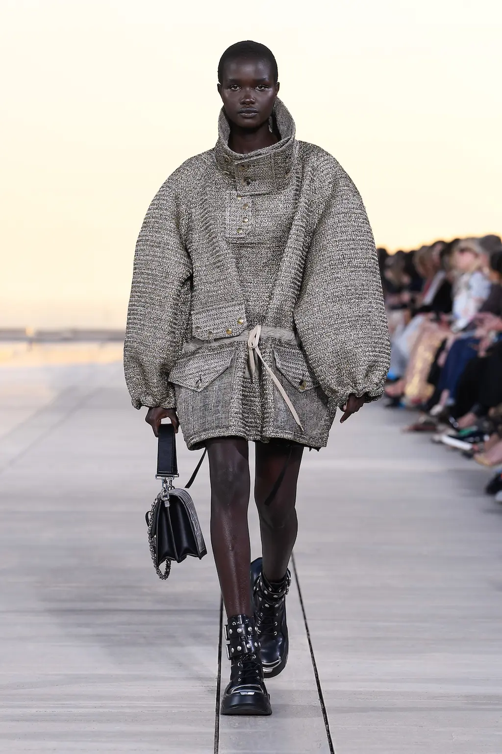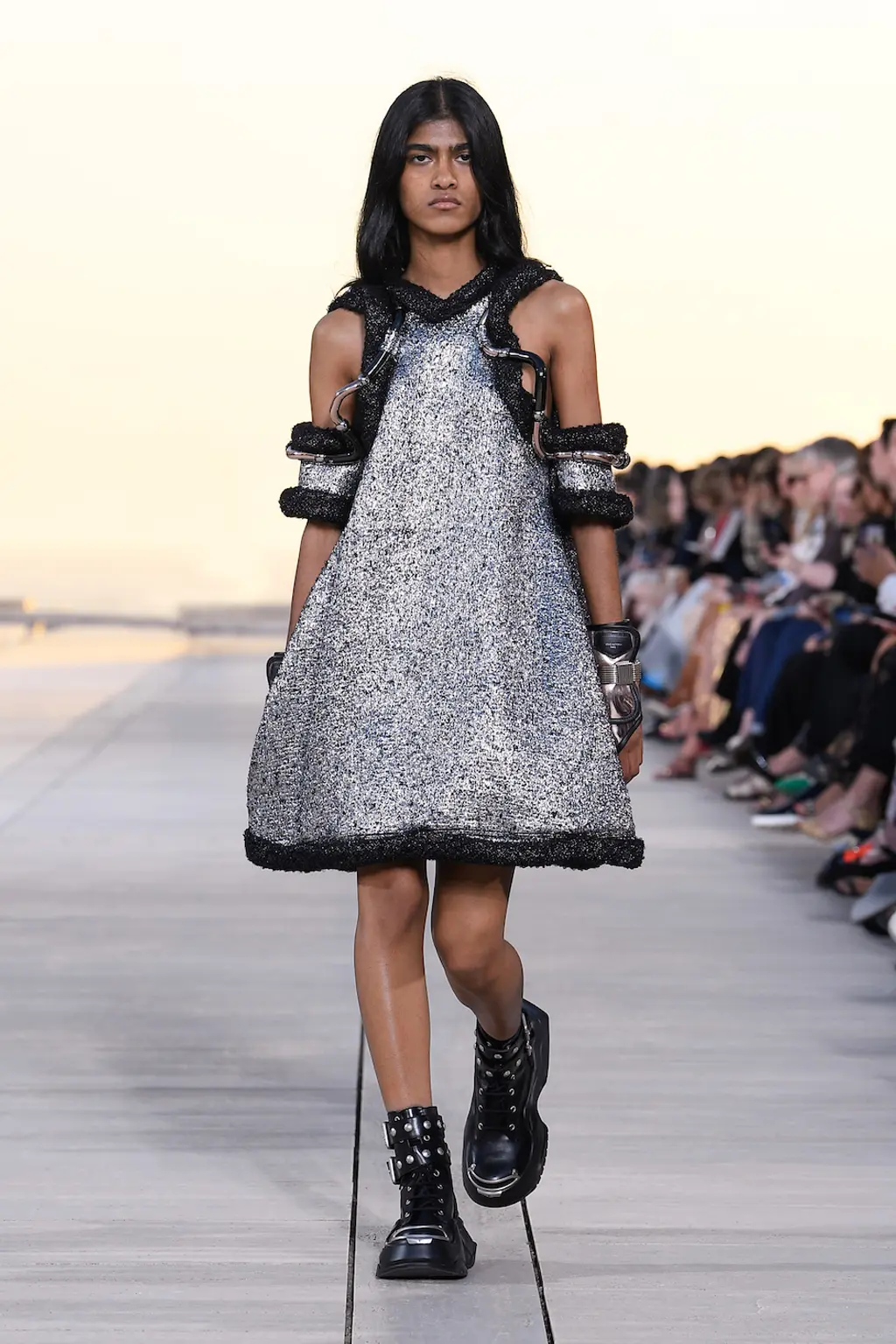 Looking every bit Dune, Vuitton’s woman is ready for battle this season, equipped with harnesses and warrior-esque structures in heavy shoulders and leather belts cinching the waist – and a decent selection of flat shoes. By the mid-section of the show, armour came in more obvious iterations, through metallic guards covering the shoulders, knee-high boots protecting the calves and the early headscarves now worn with visor-like sunglasses.