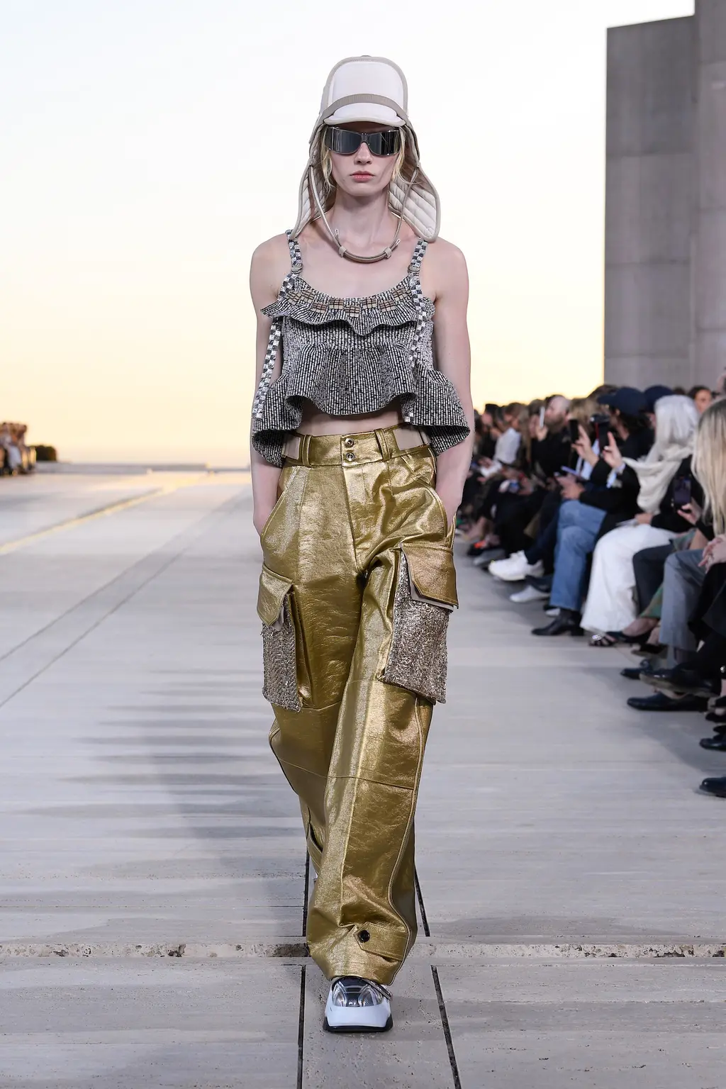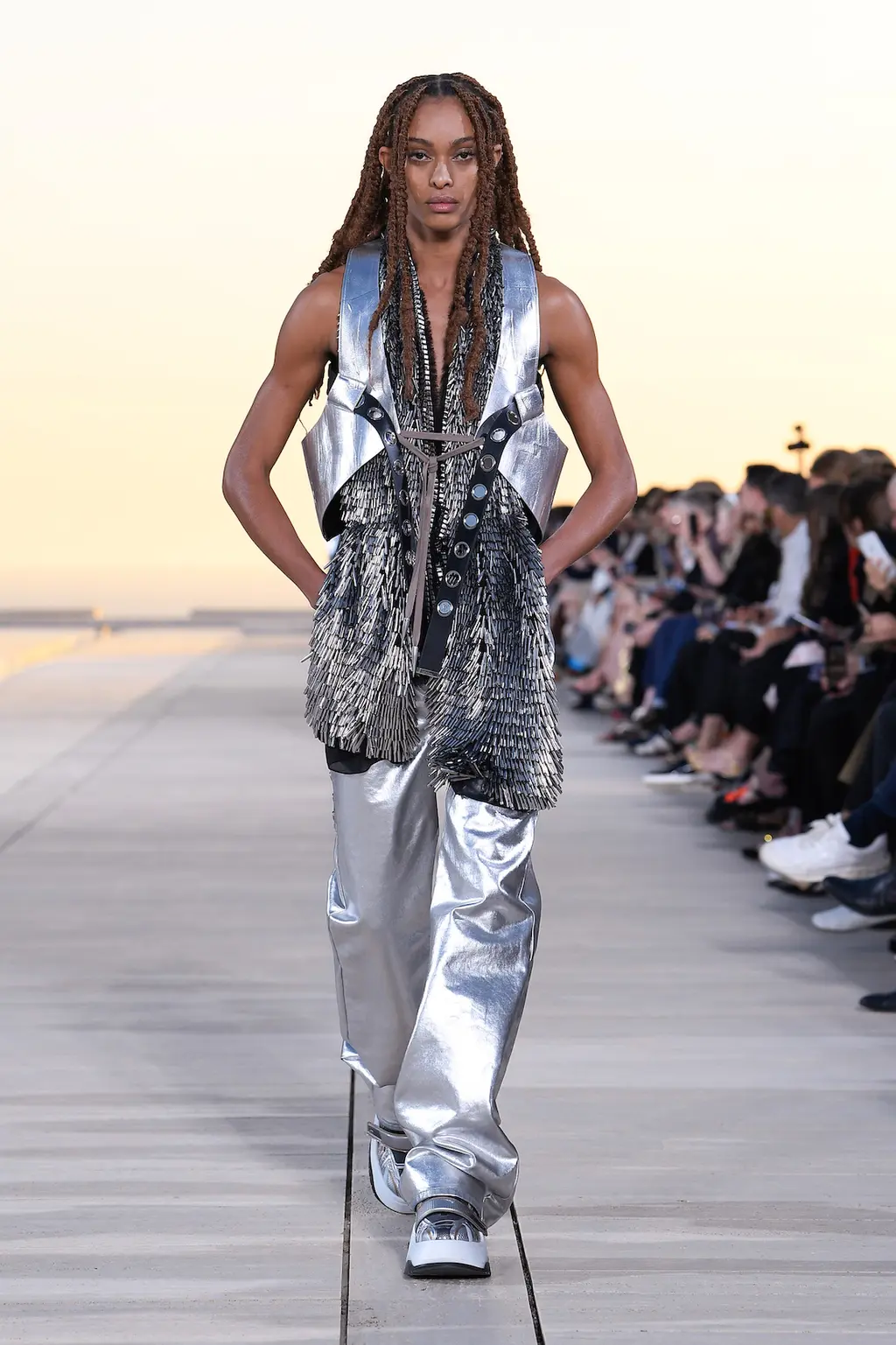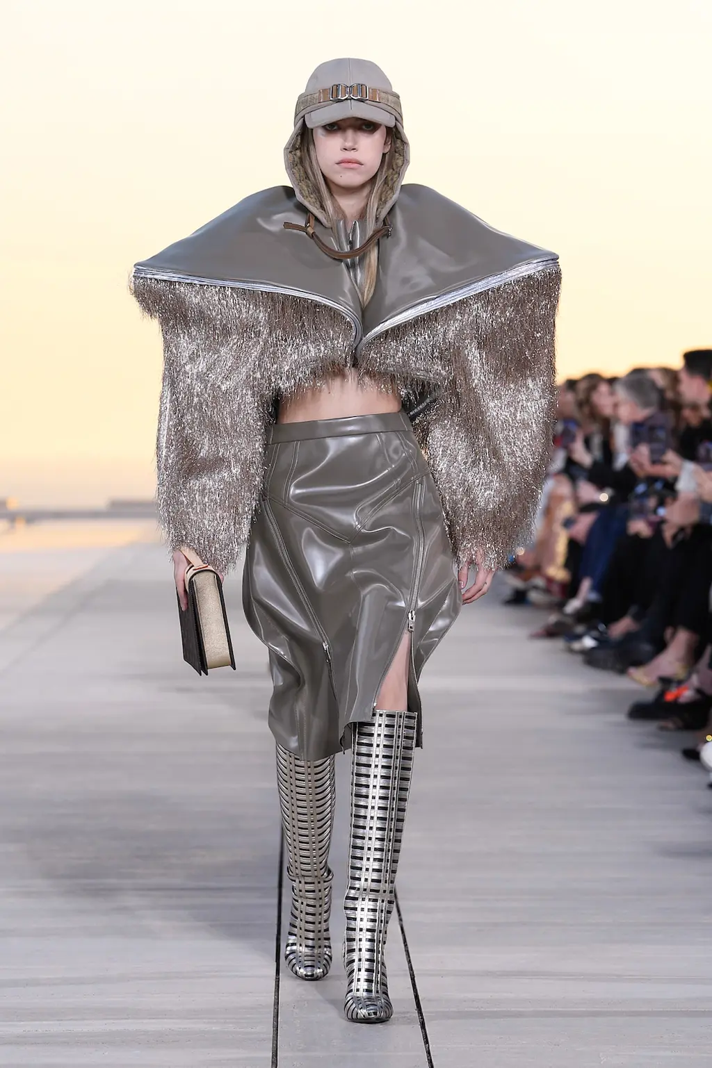 To no surprise, Ghesquière continued his quest for innovation, with liquid-gold trousers and shiny leathers stitched with embroideries that oxidise, changing colour over time and shimmering gleefully with every step.