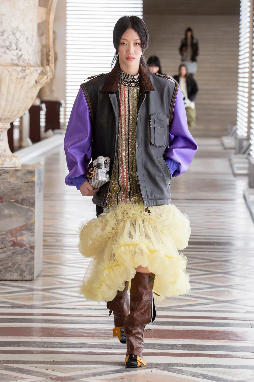 A collaboration with the legendary Italian homewares house of Fornasetti saw their signature Renaissance-inspired, illustrative prints crop up on blazers and shirting, as well as superimposed onto the classic Vuitton monogram across a number of immediately desirable leather bags. Still, this being Ghesquière, there were plenty of nods to the future too, whether through iridescent ski goggles, knitwear with spacesuit-style circular pockets, or dresses featuring prints inspired by Roman mosaics realised in cosmic crystals.