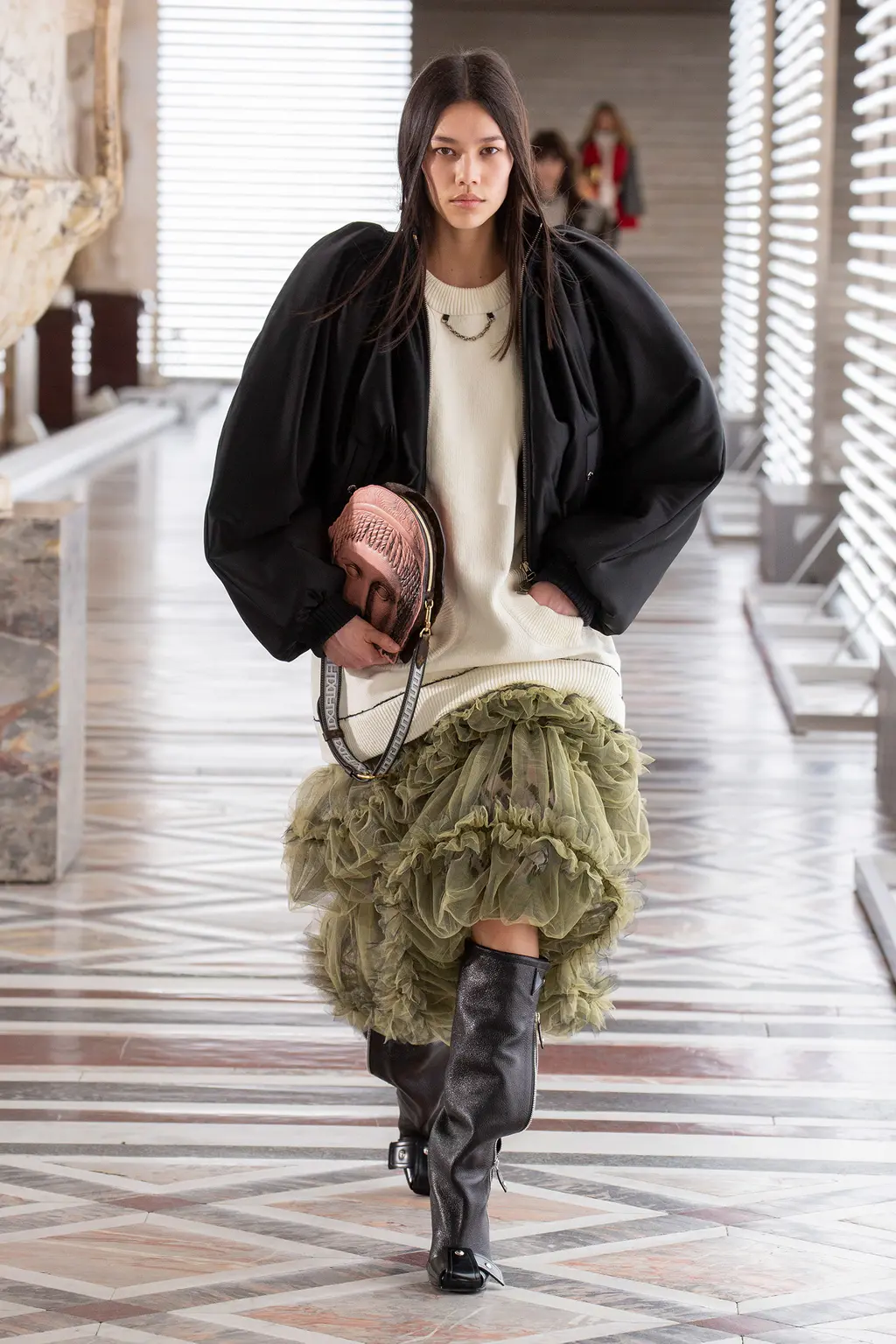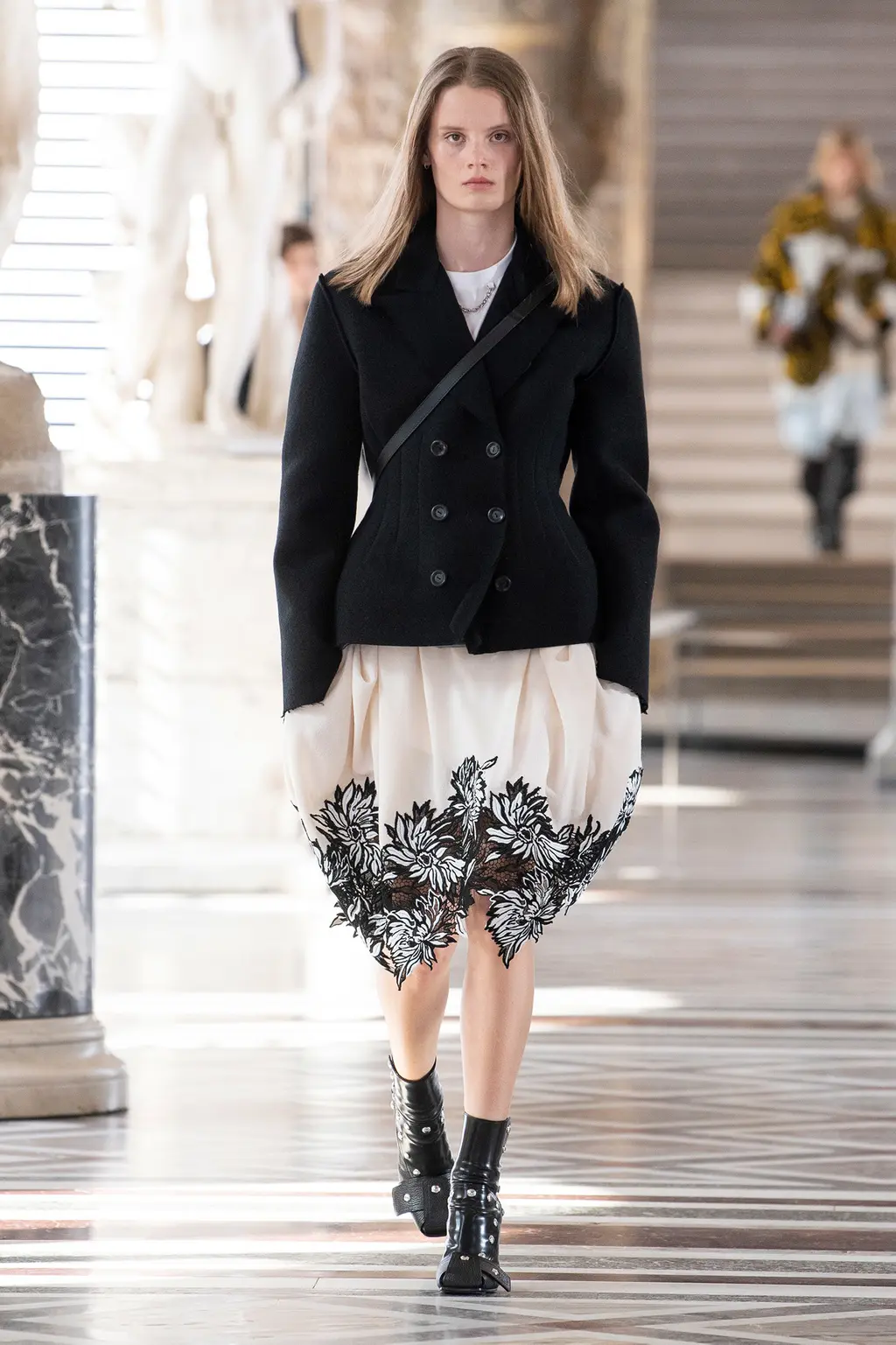 While the Louvre has always been Ghesquière’s show location of choice at Vuitton, this time, instead of constructing one of his typically elaborate sets on a courtyard stage or somewhere deep in the bowels of the building, he chose to put the museum’s collections front and centre. As models walked through airy, sun-dappled halls packed with sculptures from classical antiquity, Ghesquière’s mish-mash of references neatly echoed the show’s surroundings: Hellenic busts were printed onto minidresses, centurion-style skirts swished around thighs and stompy gladiator sandals were worn over socks, with a sweet addition of tiny satin bows below the knee.