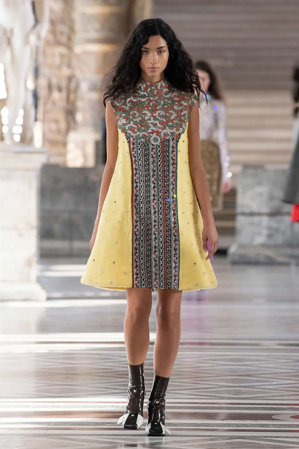 It makes sense that for a designer as restless as Ghesquière – and perhaps more importantly for a house like Vuitton that is so closely associated with the spirit of travel – that a year stuck in Paris would leave him itching for the most fantastical forms of jet-setting imaginable. And where better to find yourself transported to far-flung locales (while remaining within the safety of your own city) than in the halls of the Louvre, which houses hundreds of thousands of objects and artworks from every corner of the globe?