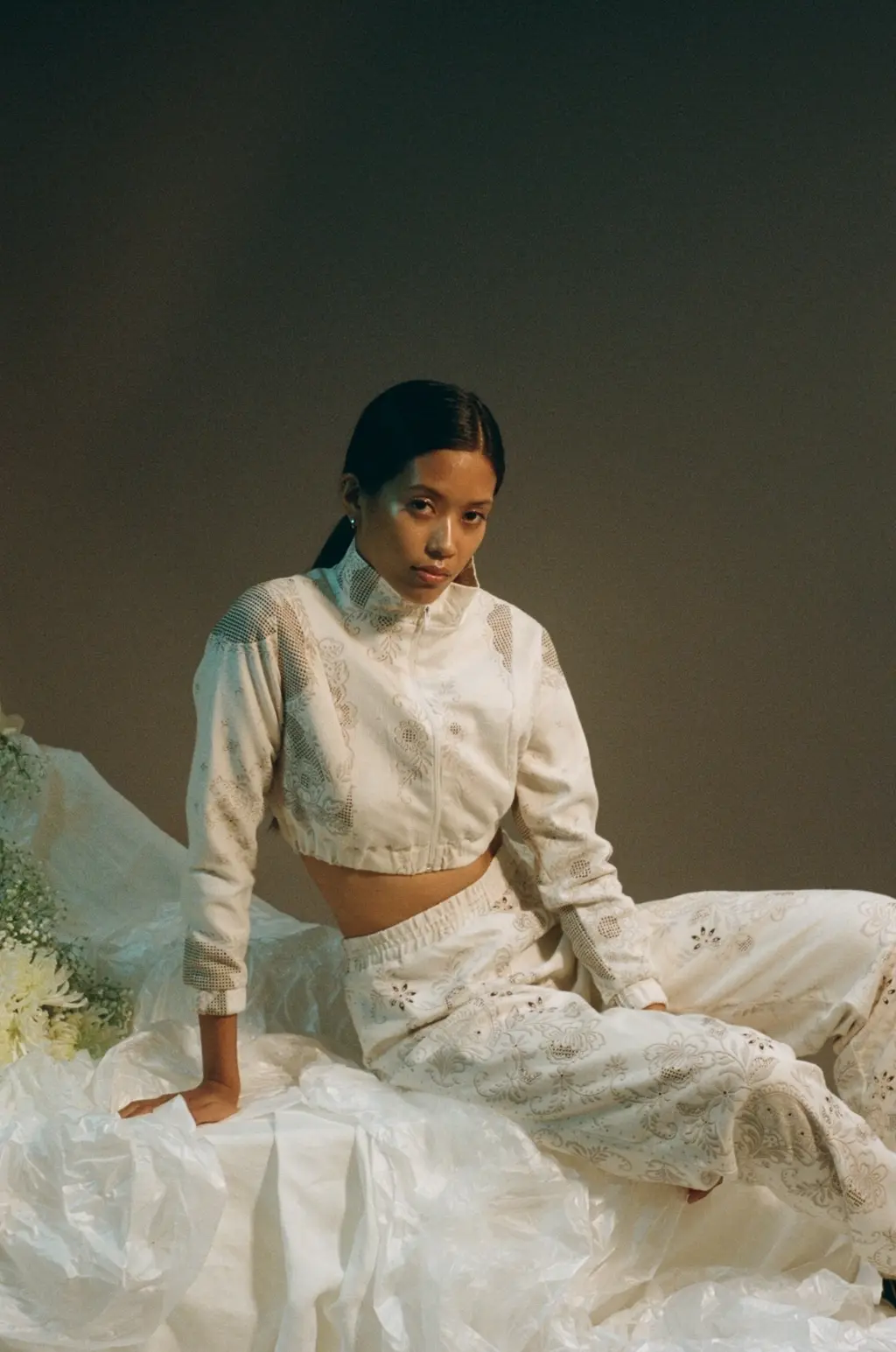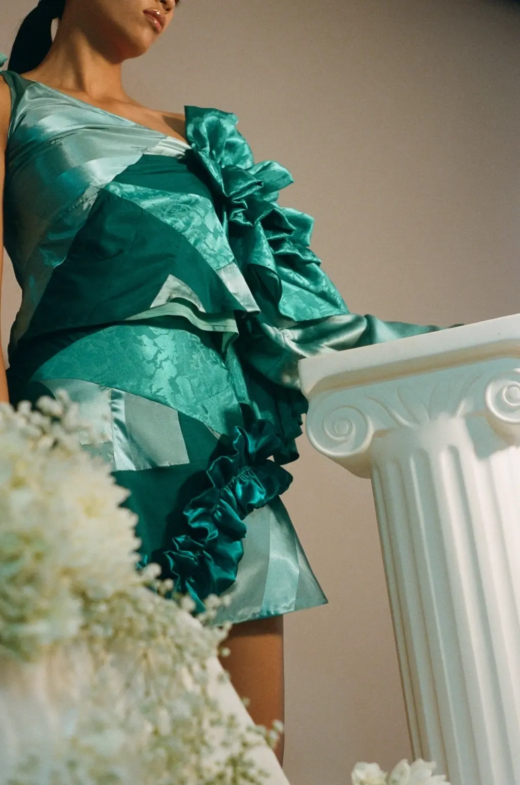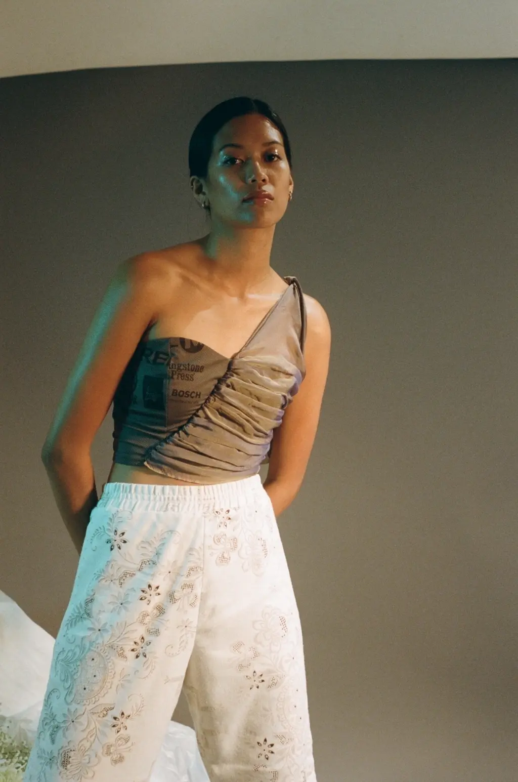 As should be the case in the midst of the worsening climate crisis, sustainability is her key focus. As opposed to buying new fabrics, she slashes charity shop dresses and stitches them onto reworked, second-hand tracksuits; T‑shirts are patched together from scraps of old material, making each of her garments completely unique.