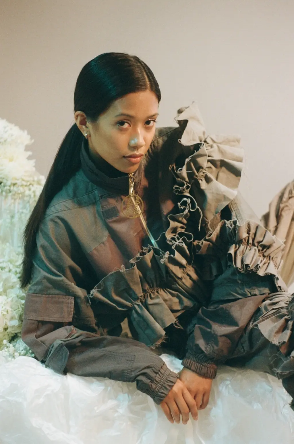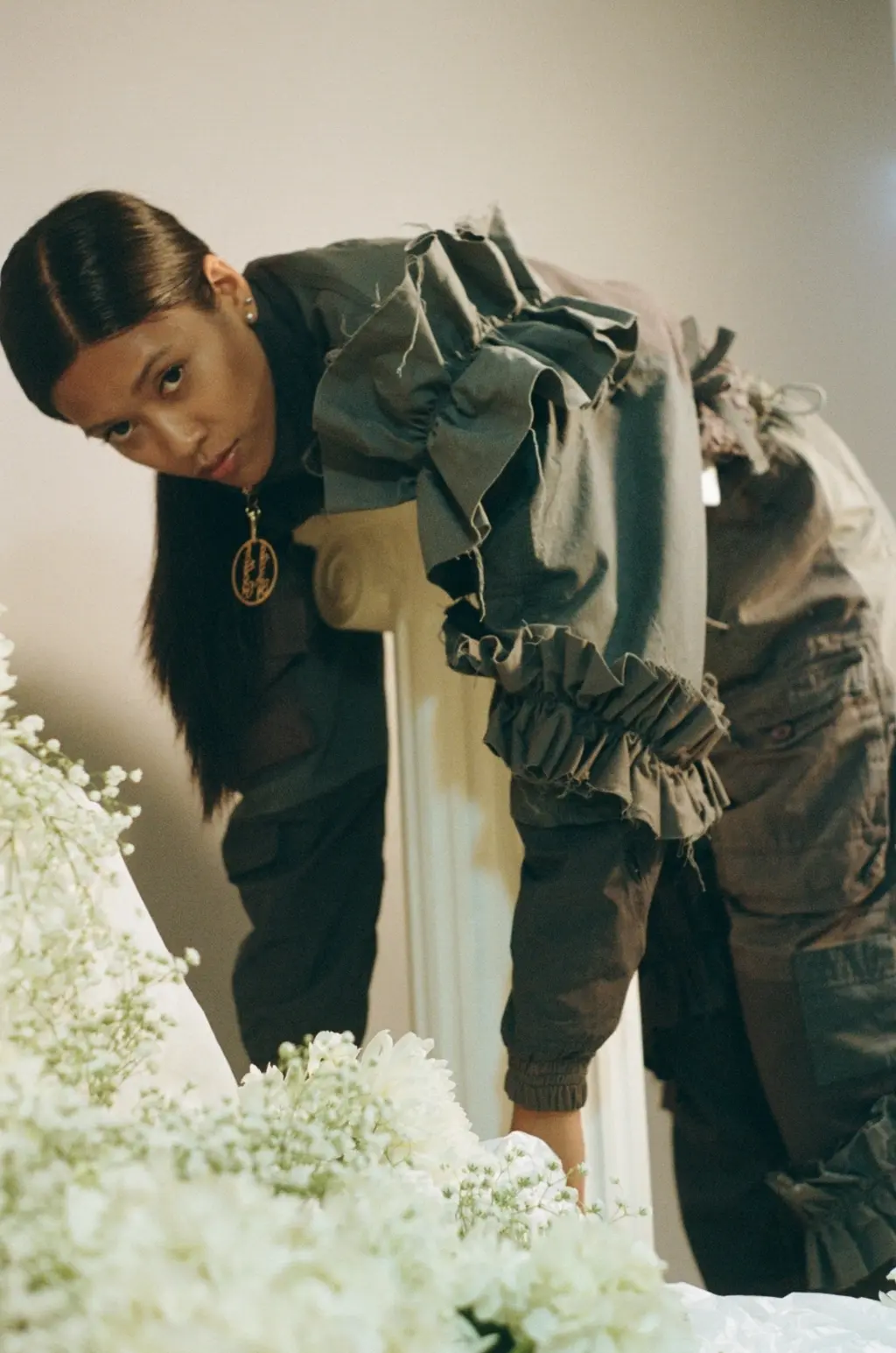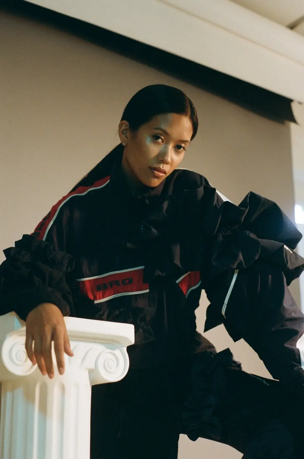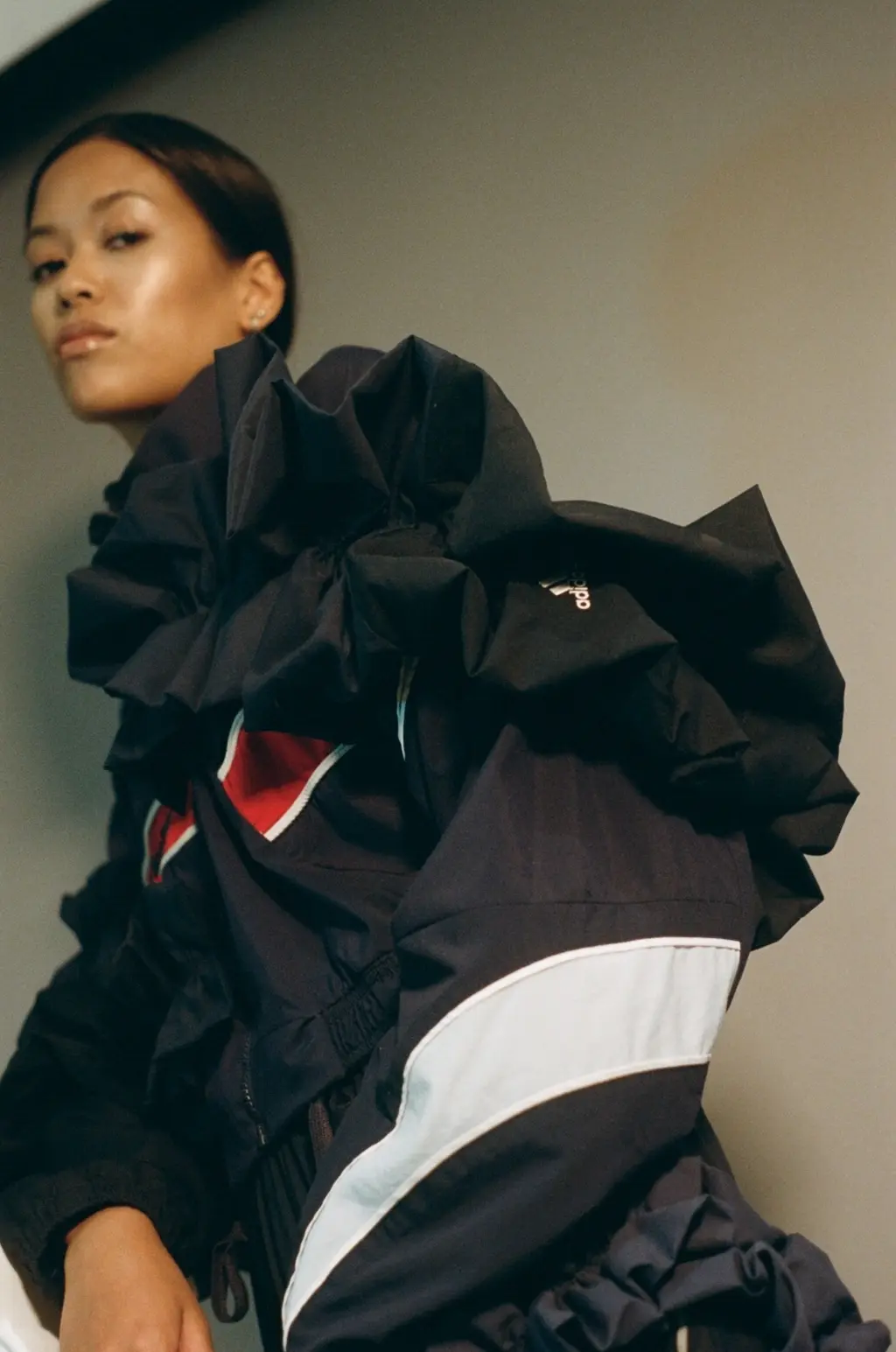 I love sportswear and I love girly things, so it really was just about combining the two. My graduate collection was called “The Girl That Wore A Tracksuit To Prom”; I had cut up old tracksuits, made these frills and the just appliquéd them on. The graduate collection was quite girly so I think it’s matured since then, but I wanted to take that Galliano, more-is-more approach and bring an element of those super-luxe ballgowns to the designs, too.