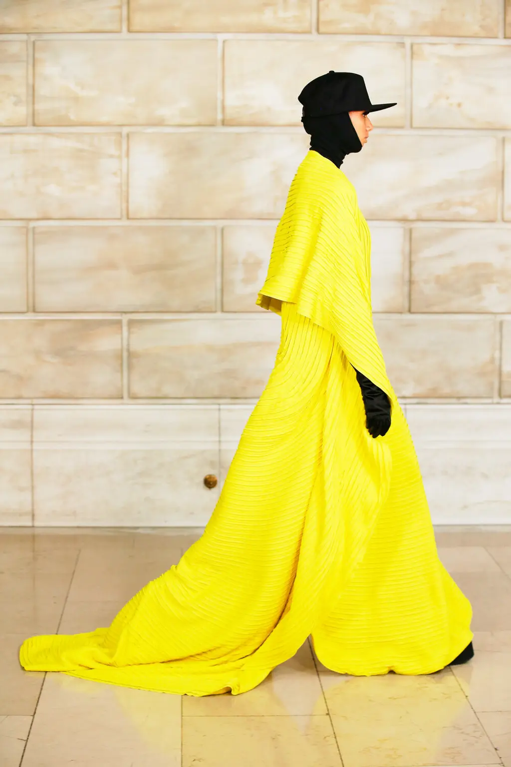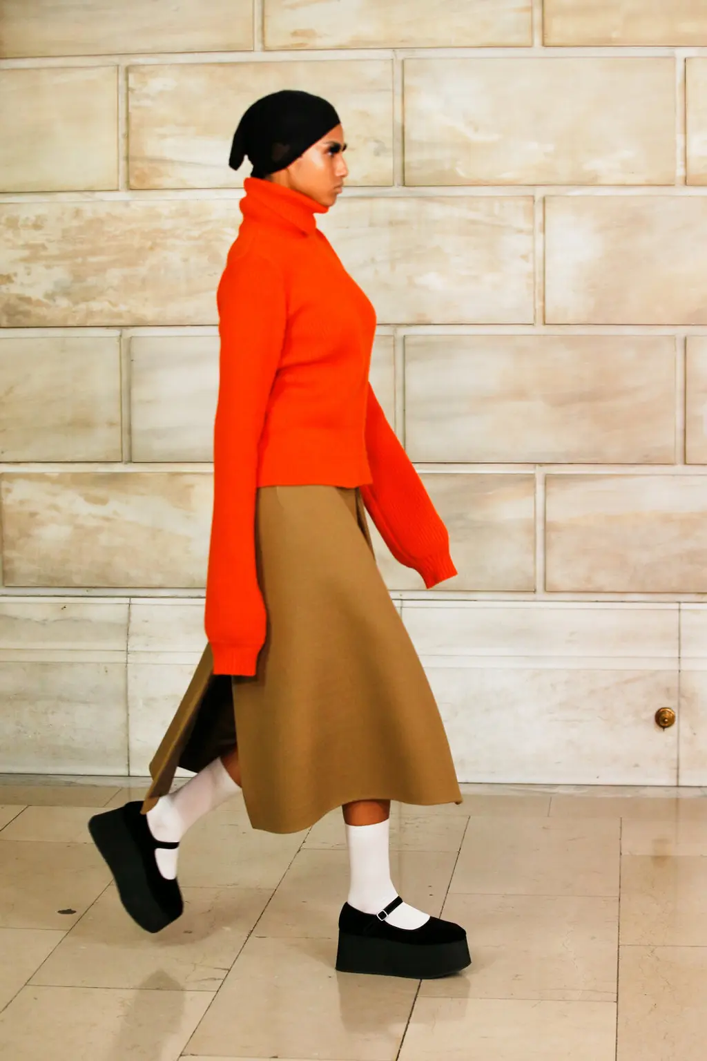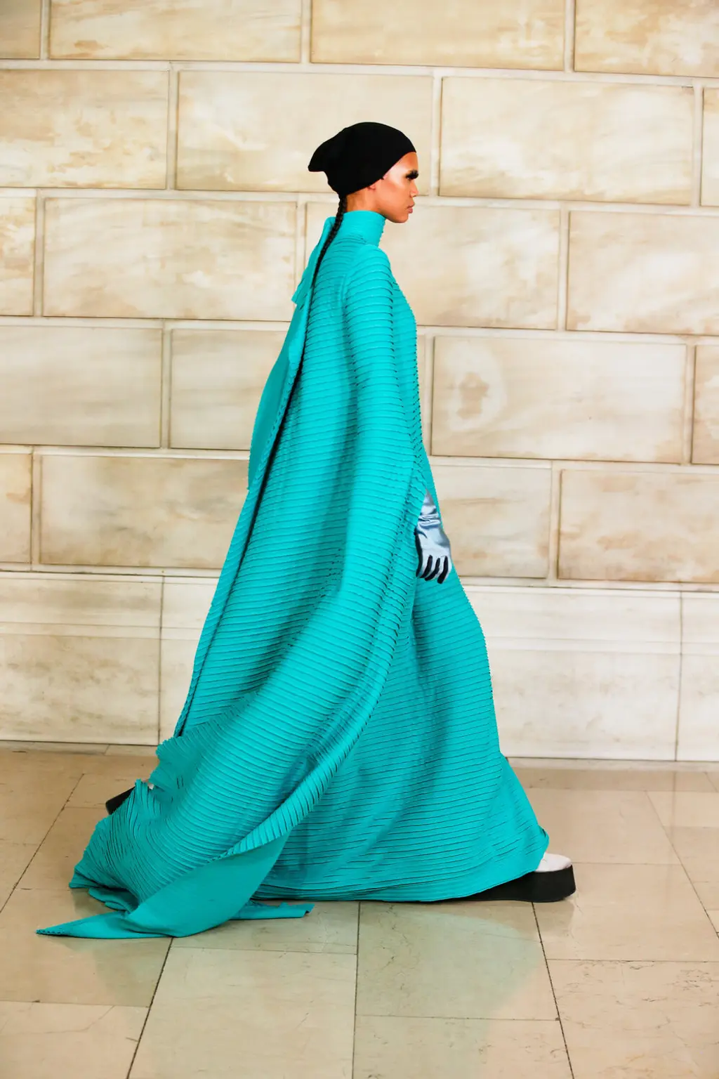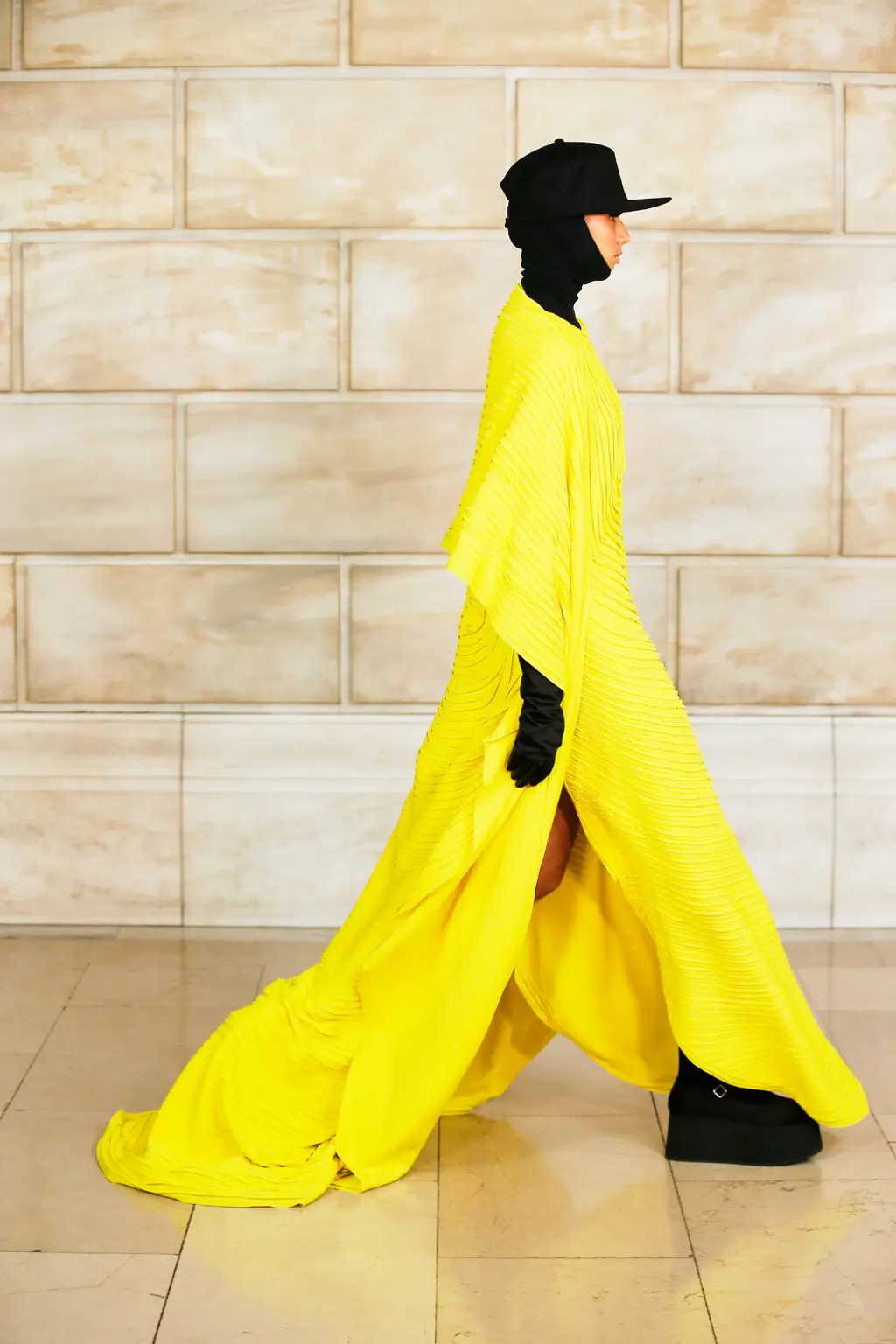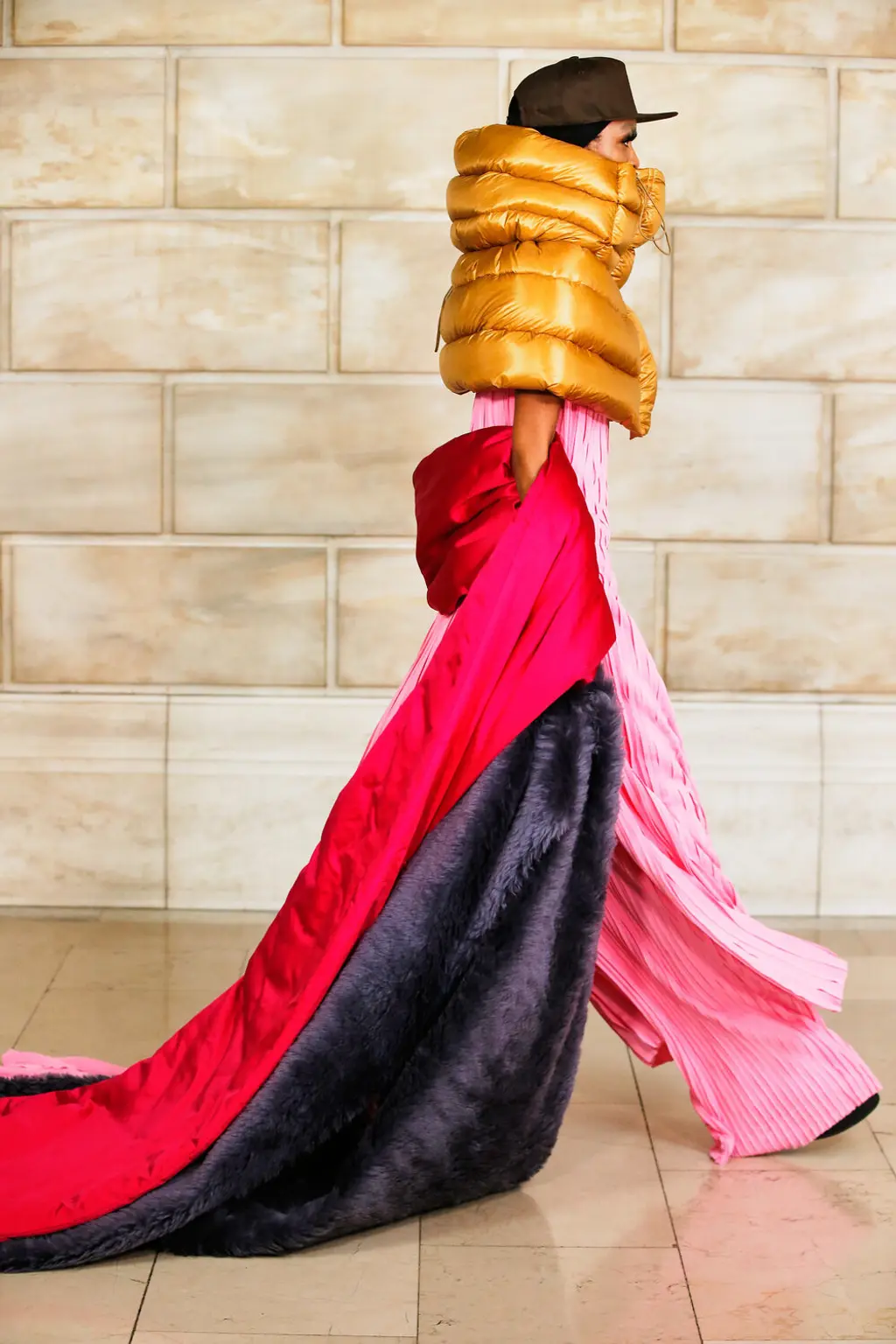 Like many a designer this year, Jacobs is now looking forward. Presenting at New York Public Library yesterday to a live audience (attendees had to provide a negative Covid result), the New York designer channelled the fear, anxiety, loneliness and detriment of the past year into a searingly inventive collection of volume, draped shapes and nonsensical bodily form… that slowly became very sensical.