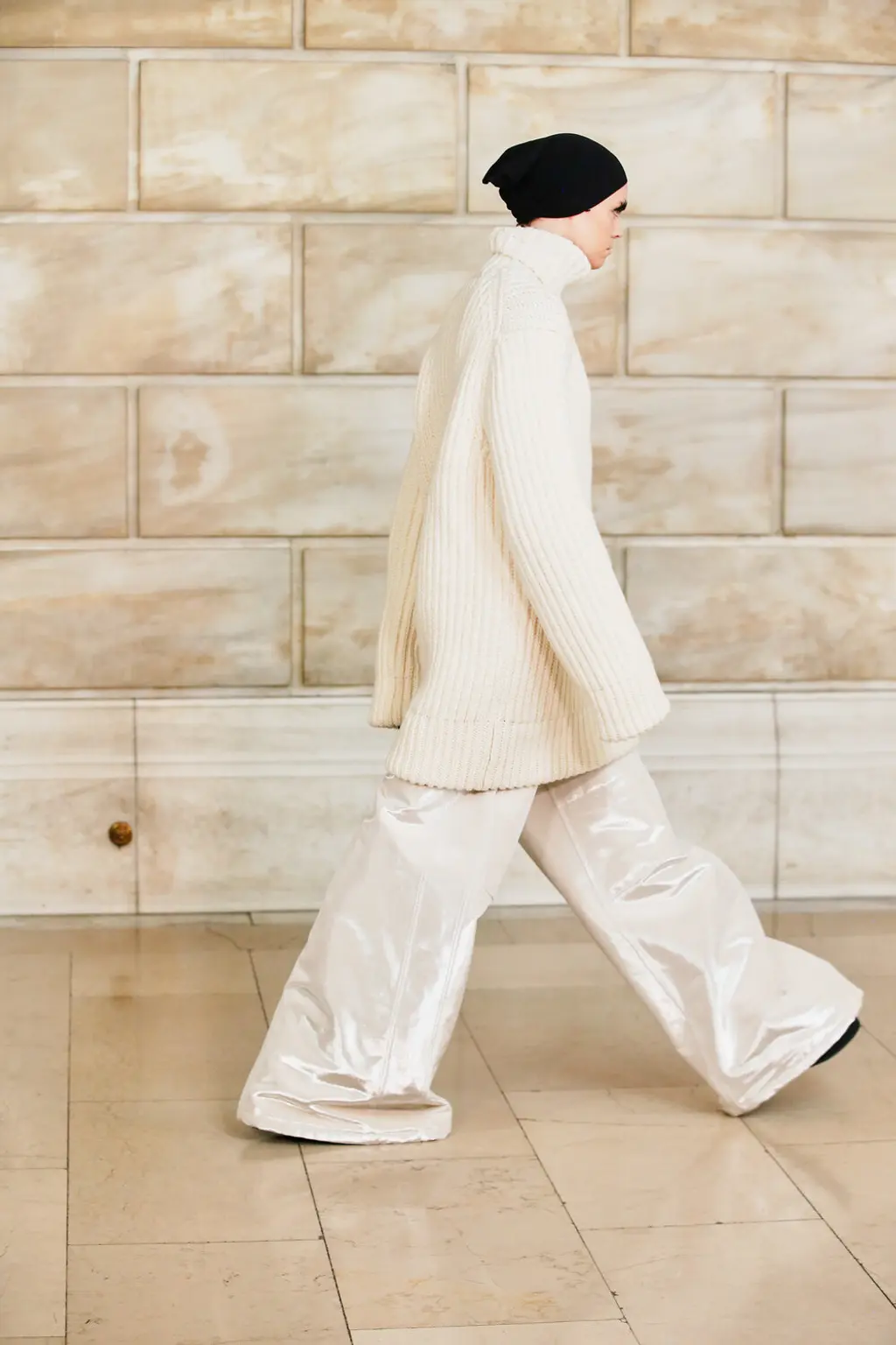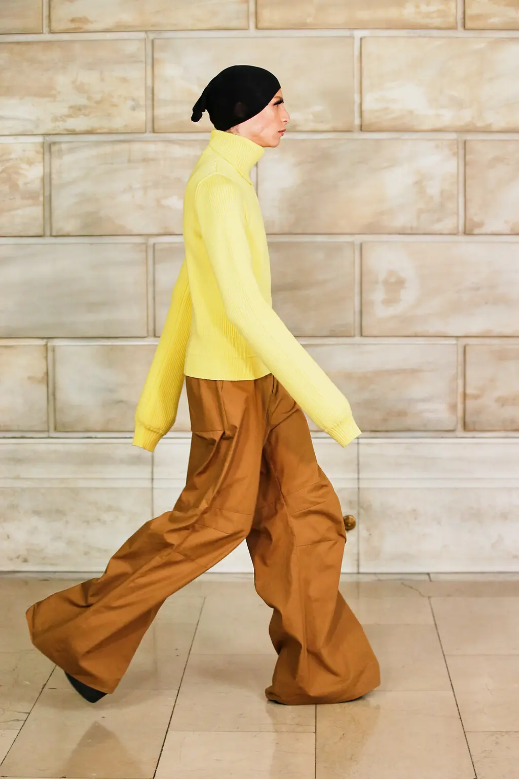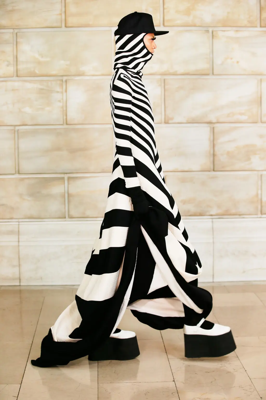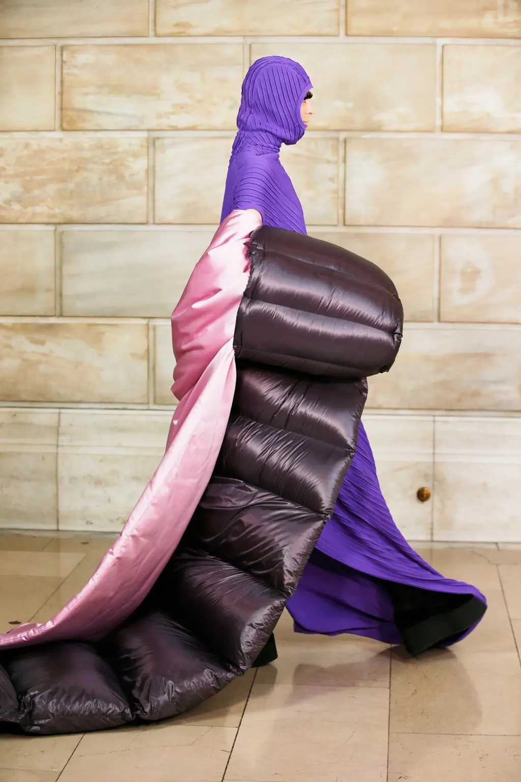 But back to the future. This season, Jacobs presented a collection that was all about happiness, turning an affirmative back on the difficulties of a pandemic-ridden year. Interestingly, though, the pandemic themes throughout were hard to ignore. Shielding came through in padded, full-body gowns, ominously striped black-and-white like a warning. In earlier looks, mouths were concealed by super-high roll-necks, the head topped with a beanie and sunglasses covering the small frame of skin left on show.