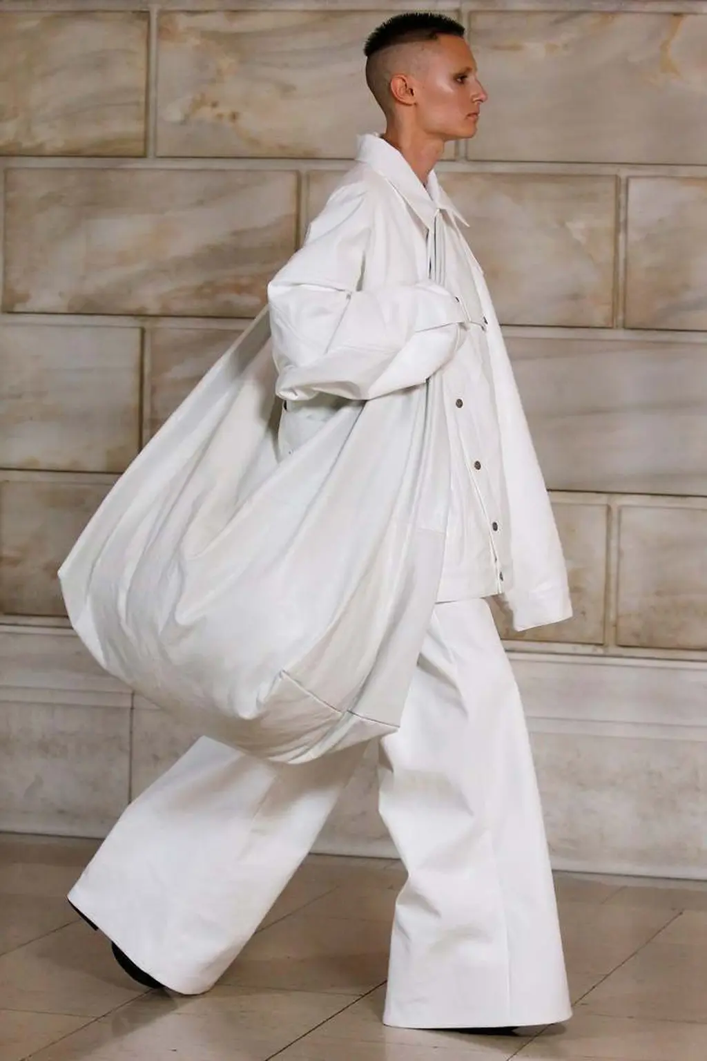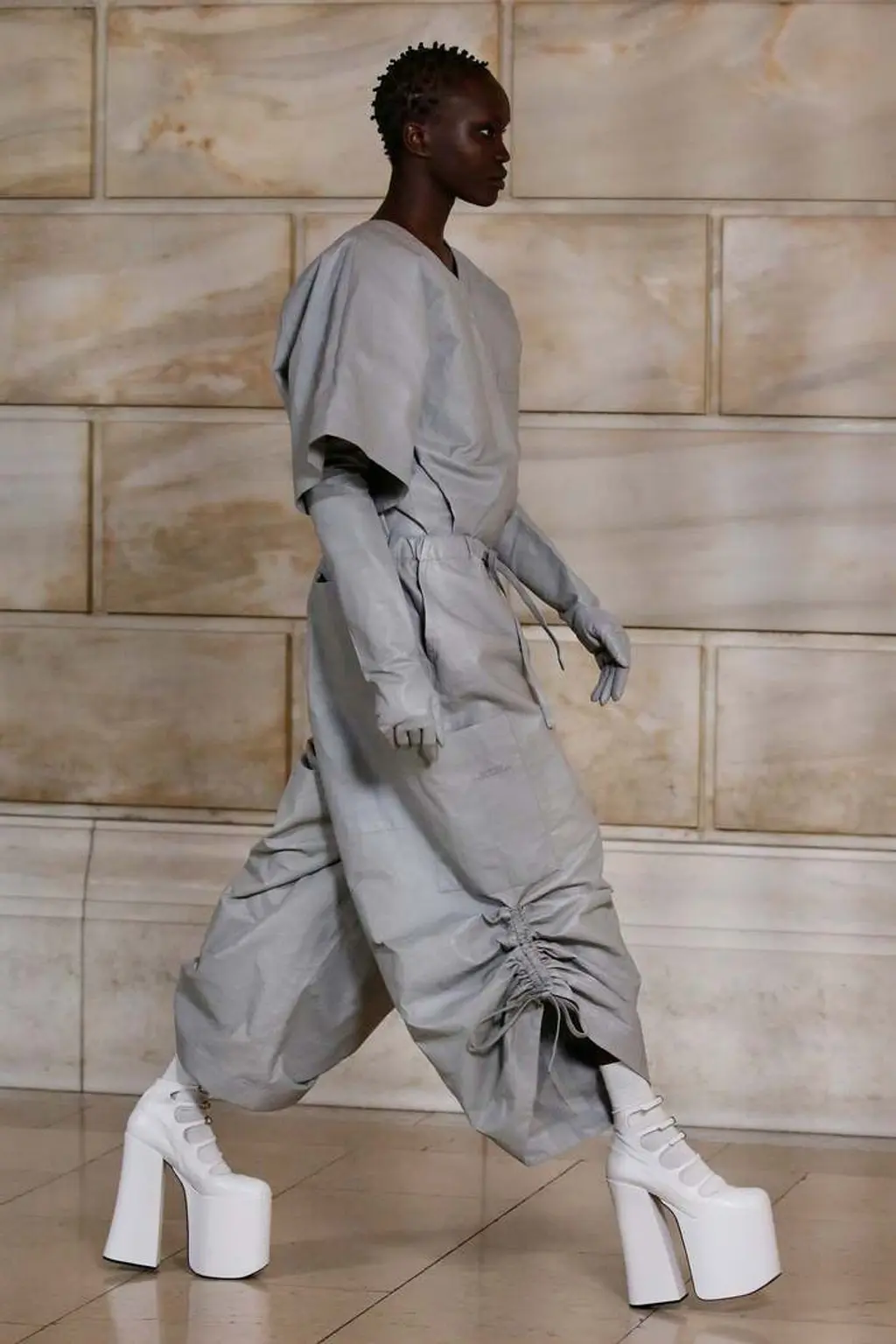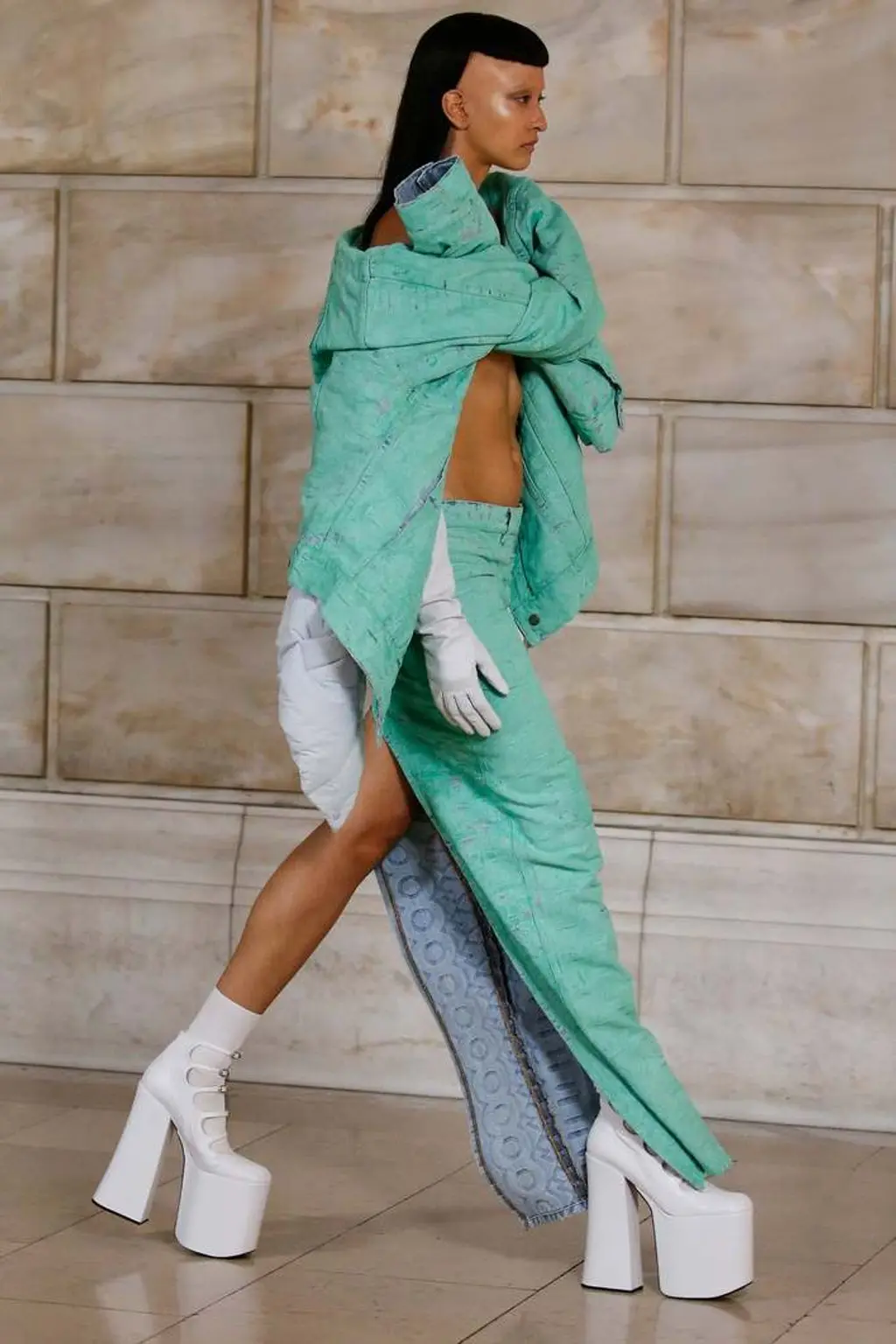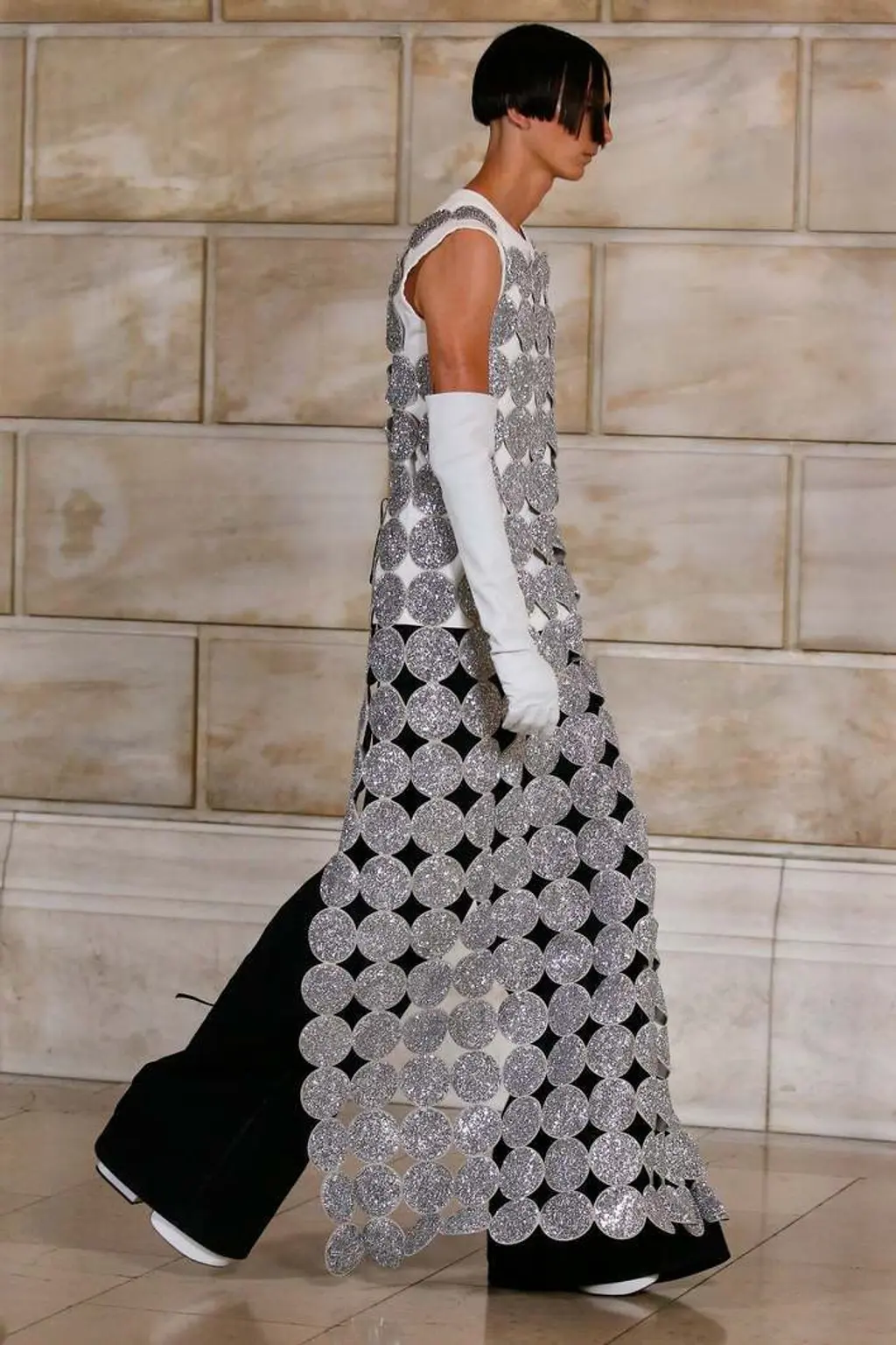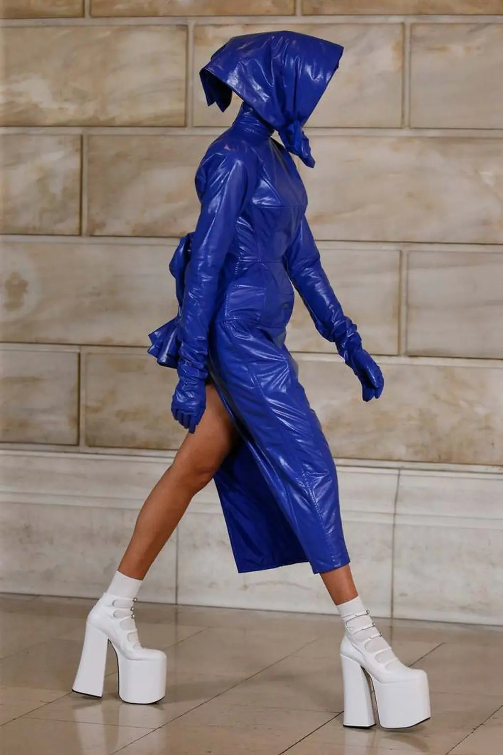 The collection itself was ambitious – not just in the height of the platformed Mary Jane heels, which added trippy Alice in Wonderland edge, but in the scope of the silhouettes. Knits were blown up and tied in big, bulbous knots. Skirts and jackets were padded like glam airbags. Some of the pieces felt like Comme des Garçons gone clubbing, while others featuring Paco Rabanne-esque chainmail shapes lightly layered over white t‑shirts suggested a thoroughly modern Joan of Arc.