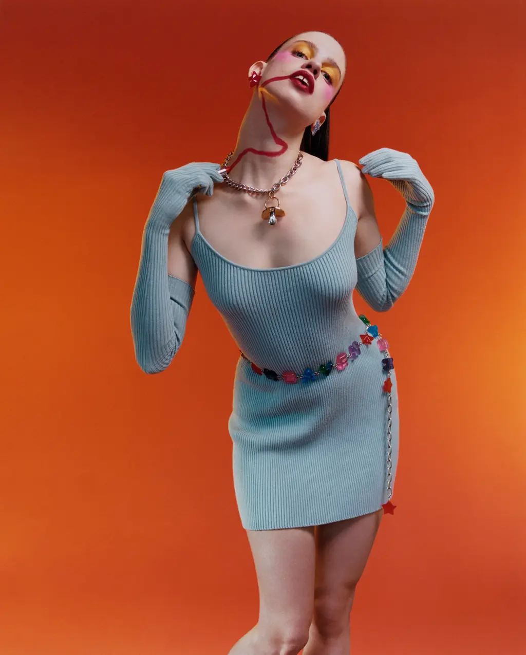 Expect sparkling lurex knits and preppy tank tops, tartan dresses and pleated skirts, printed sleeveless puffer jackets, loose gauge knits and trippy printed T‑shirts. Accessories come in the shape of heart-balloon earrings, a knitted double-headed teddy bear keyring and the label’s signature puffy tote bag in an array of candy colours. Heaven’s now-iconic double-headed teddy bear backpack (inspired by a photograph of Katie Grand in a 1994 issue of Dazed & Confused) is served in Berghain-ready black faux leather.