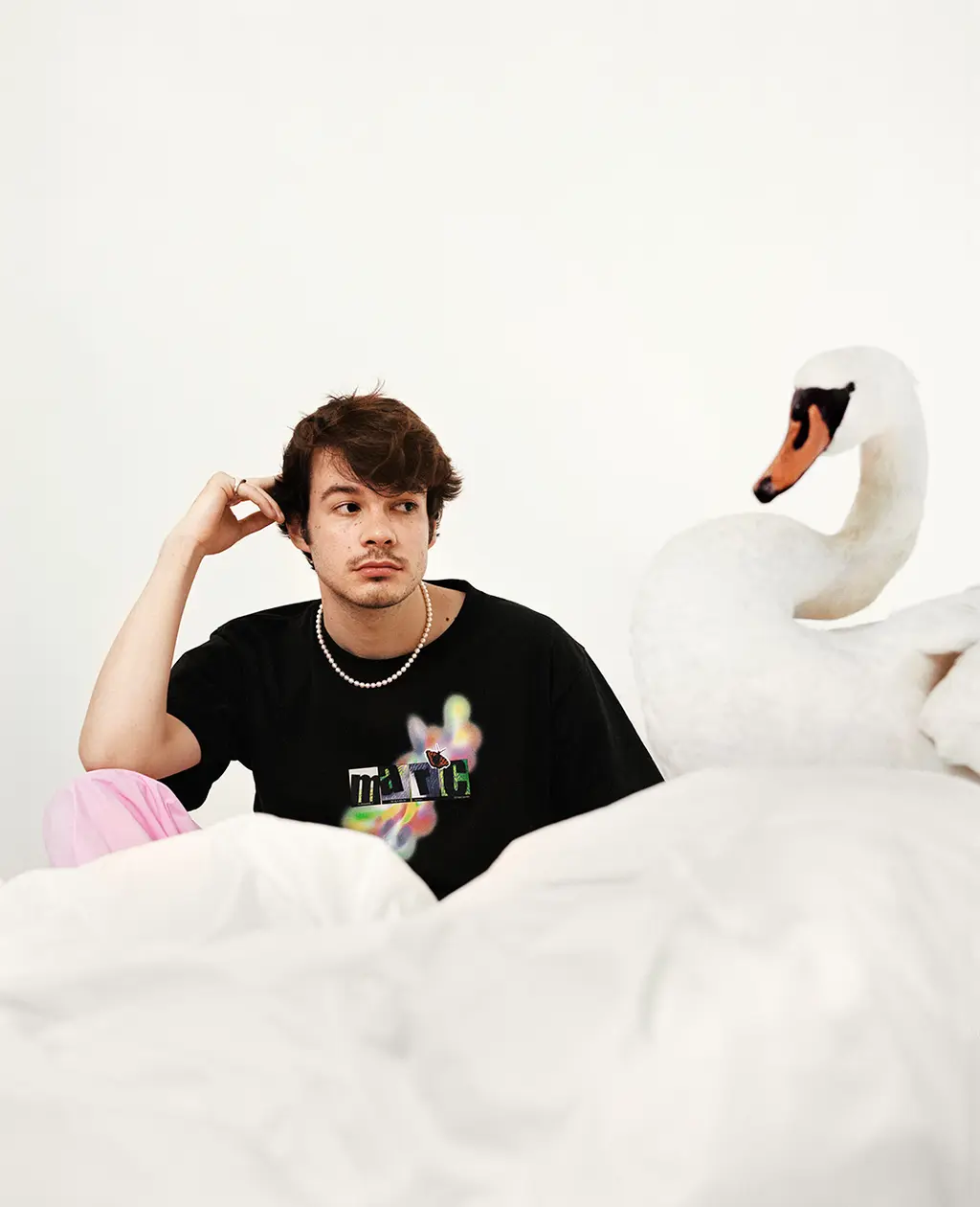 The lookbook for the collection, now available to purchase, is shot around the house from the breakfast station to the bedroom (because where else would anyone be right now?). Heaven’s debut offering focussed heavily on cut-and-sew pieces (see: sell-out graphic tees and sweatshirts), but this collection goes deeper: knitwear 2.0, woven pieces and killer denim. “Yes, we have introduced jeans with really dreamy prints, which we are excited about!”