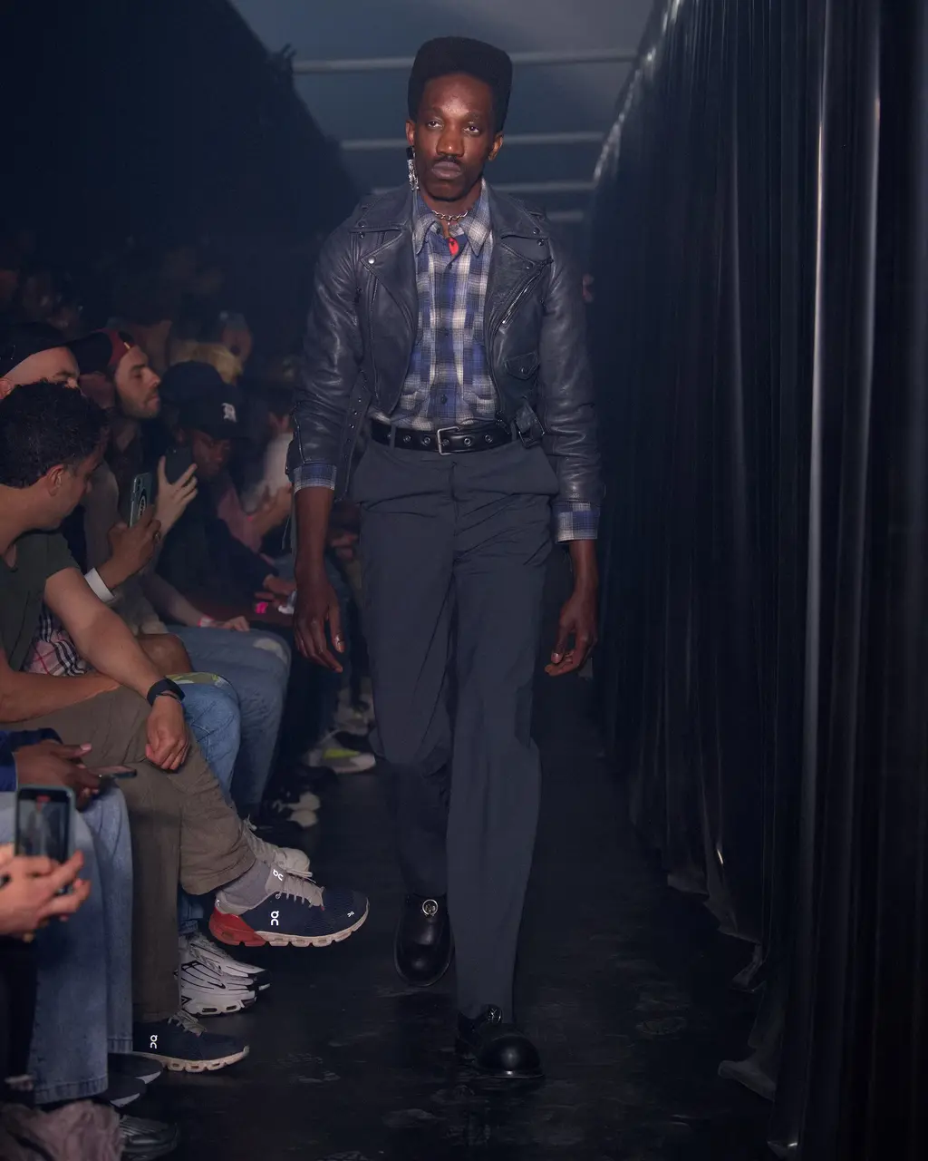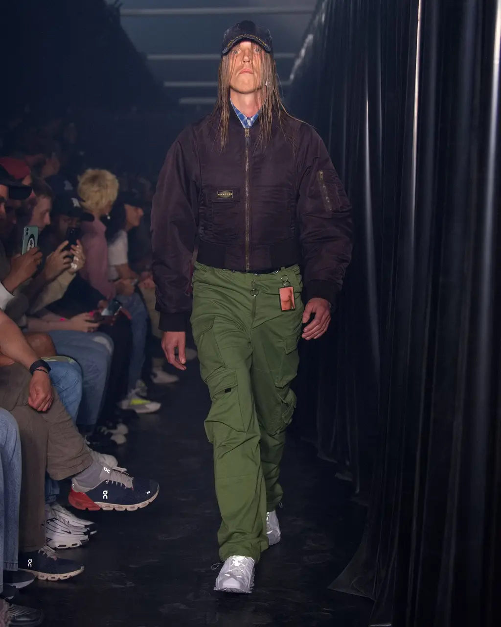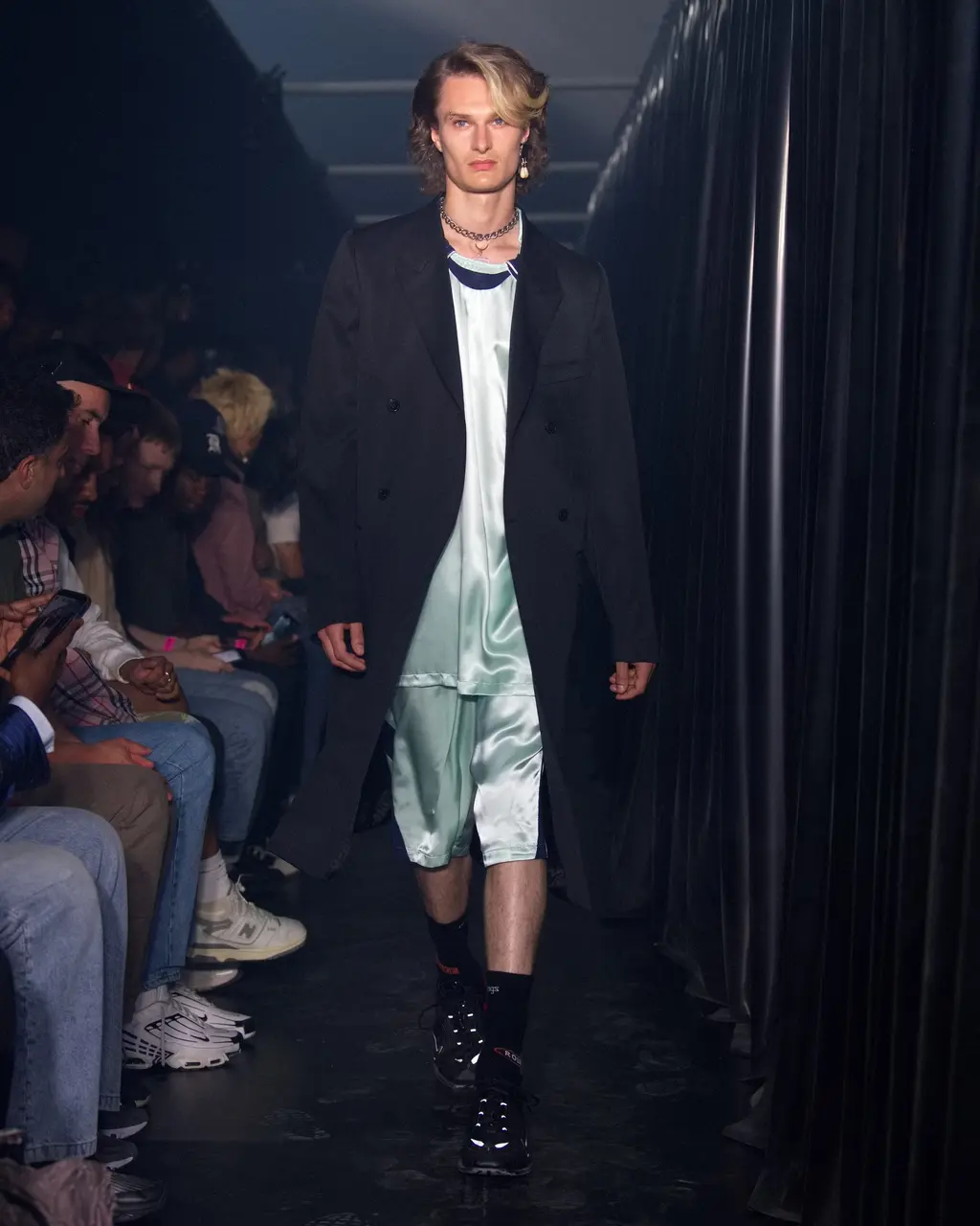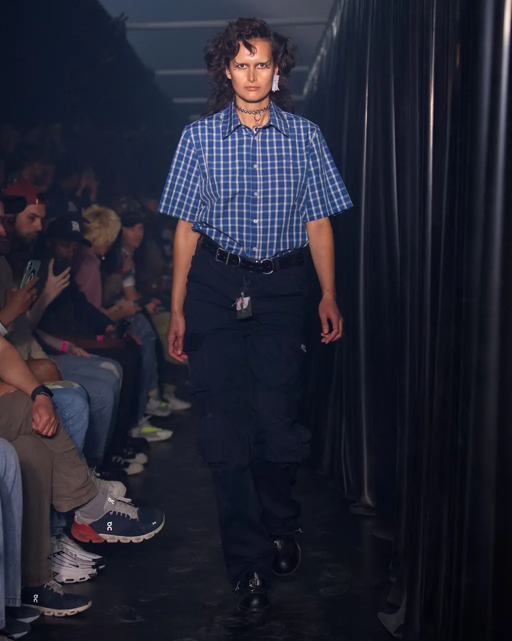 Leather jackets were cropped, hugging the shoulders as though gasping for air, and photo keyrings were suggestively hung from the zippers of jeans, provided by long-time collaborator and artist Roxy Lee, with images taken from her recent X‑rated exhibition, Cold Lunch. Bomber jackets nodded to punk styles – less ’70s anarcho and more Bruce LaBruce – a vision of masculinity dreamt up by horny gays in the comfort of safe spaces like dirty dancefloors and red rooms. And Rose’s daddy-world is reappropriated again this season, in pocketed cargo knee-lengths and trousers hoisted right up the waist, with chequered short-sleeve shirts tucked in and paired with a sexy new Nike collaboration, with the upcoming Shox MR4.
