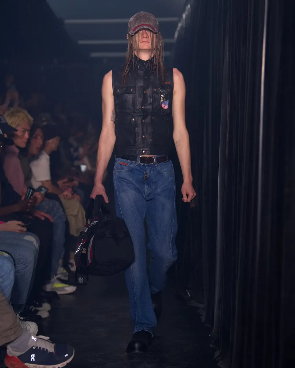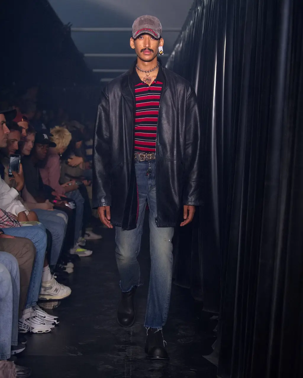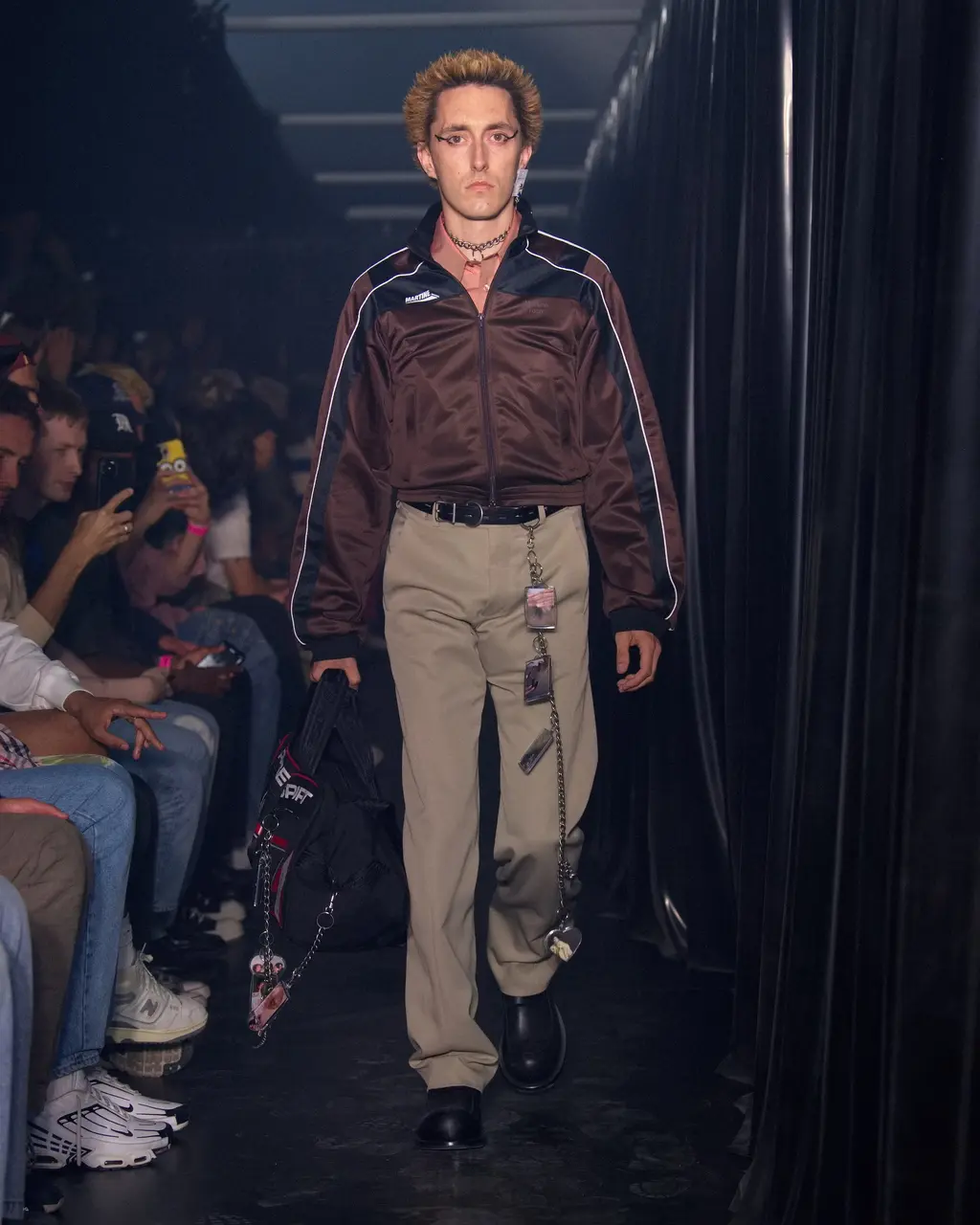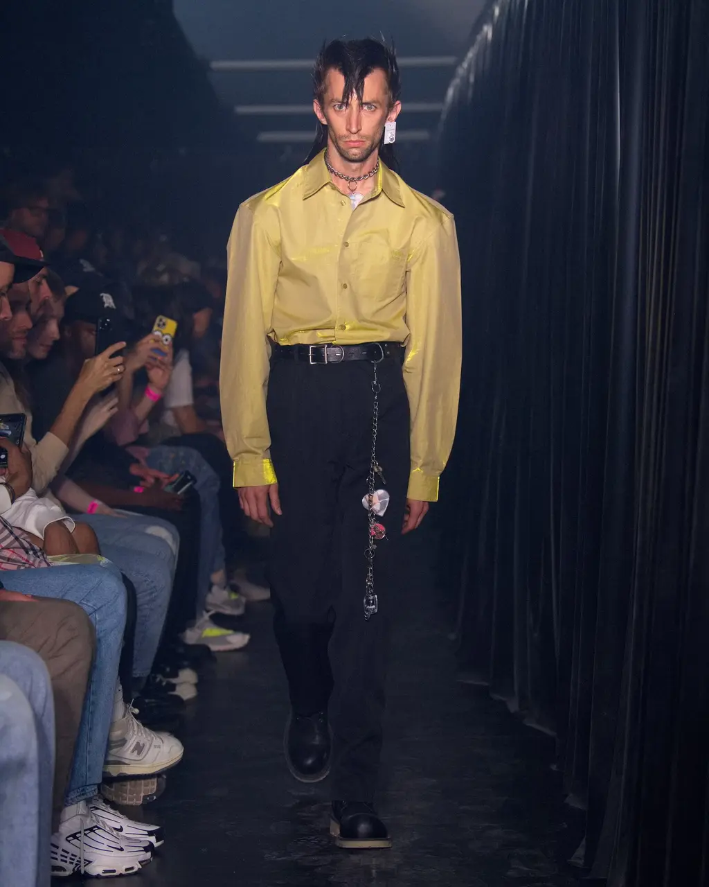 Leather jackets were cropped, hugging the shoulders as though gasping for air, and photo keyrings were suggestively hung from the zippers of jeans, provided by long-time collaborator and artist Roxy Lee, with images taken from her recent X‑rated exhibition, Cold Lunch. Bomber jackets nodded to punk styles – less ’70s anarcho and more Bruce LaBruce – a vision of masculinity dreamt up by horny gays in the comfort of safe spaces like dirty dancefloors and red rooms. And Rose’s daddy-world is reappropriated again this season, in pocketed cargo knee-lengths and trousers hoisted right up the waist, with chequered short-sleeve shirts tucked in and paired with a sexy new Nike collaboration, with the upcoming Shox MR4.