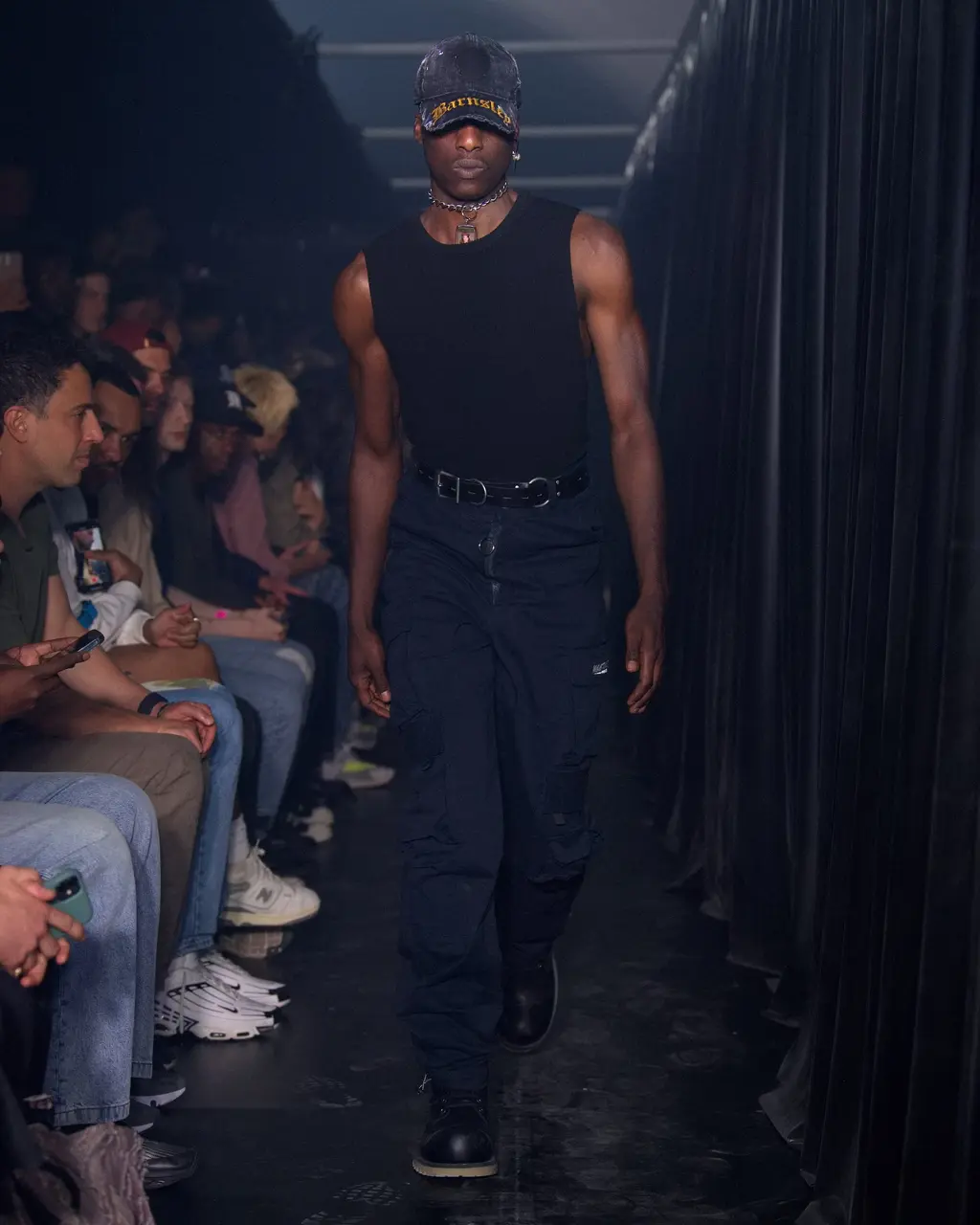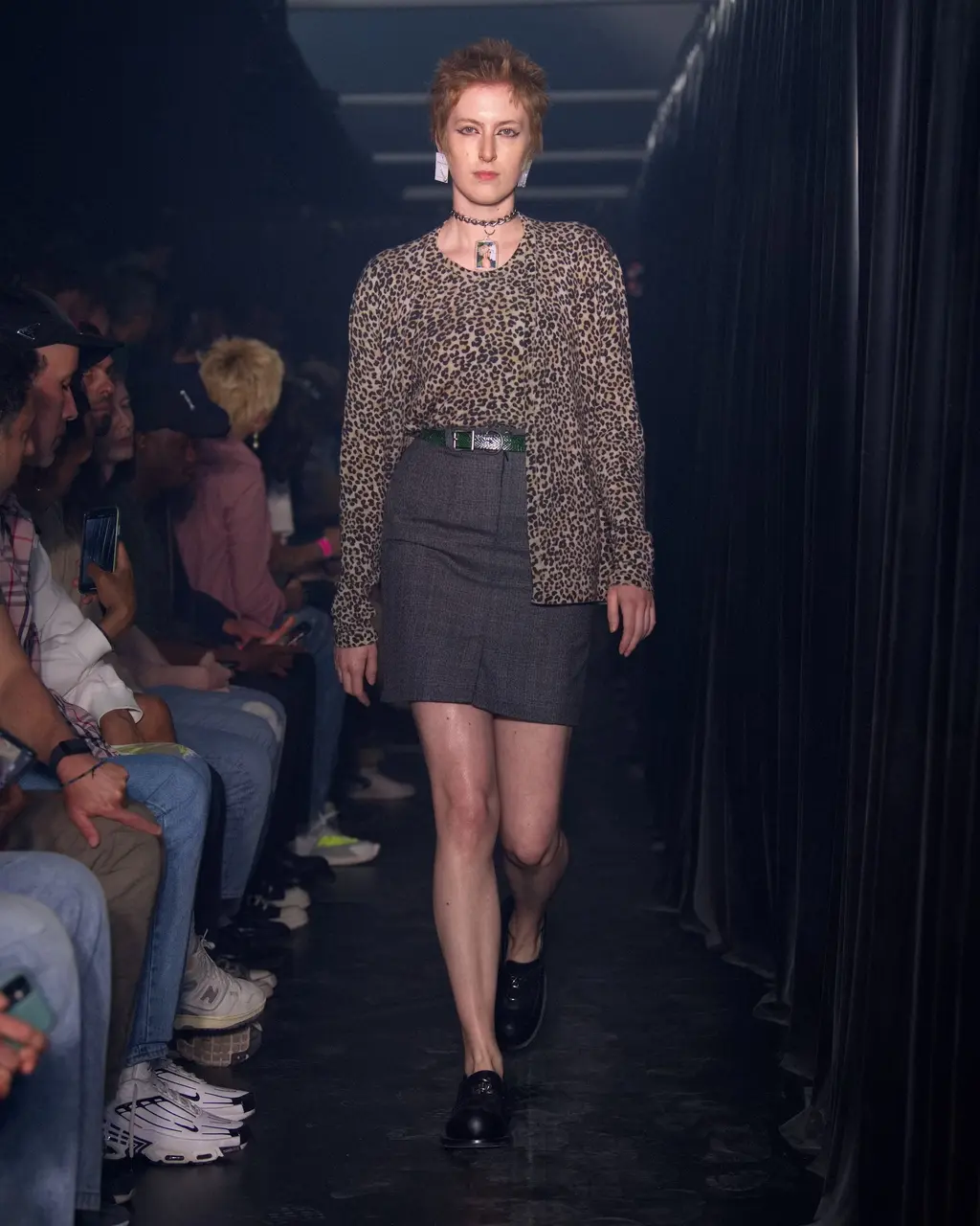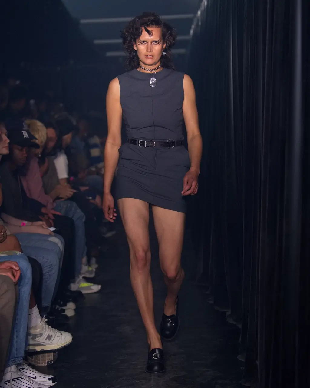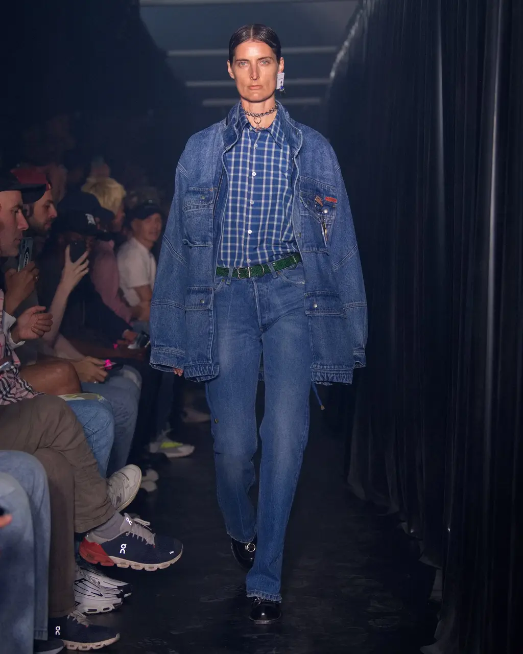 Leather jackets were cropped, hugging the shoulders as though gasping for air, and photo keyrings were suggestively hung from the zippers of jeans, provided by long-time collaborator and artist Roxy Lee, with images taken from her recent X‑rated exhibition, Cold Lunch. Bomber jackets nodded to punk styles – less ’70s anarcho and more Bruce LaBruce – a vision of masculinity dreamt up by horny gays in the comfort of safe spaces like dirty dancefloors and red rooms. And Rose’s daddy-world is reappropriated again this season, in pocketed cargo knee-lengths and trousers hoisted right up the waist, with chequered short-sleeve shirts tucked in and paired with a sexy new Nike collaboration, with the upcoming Shox MR4.