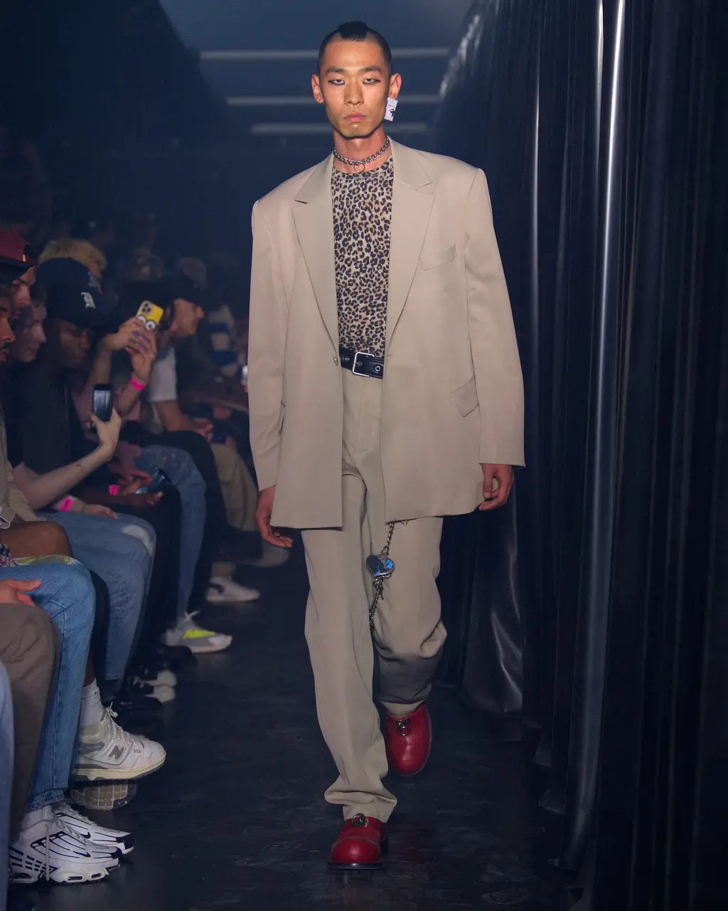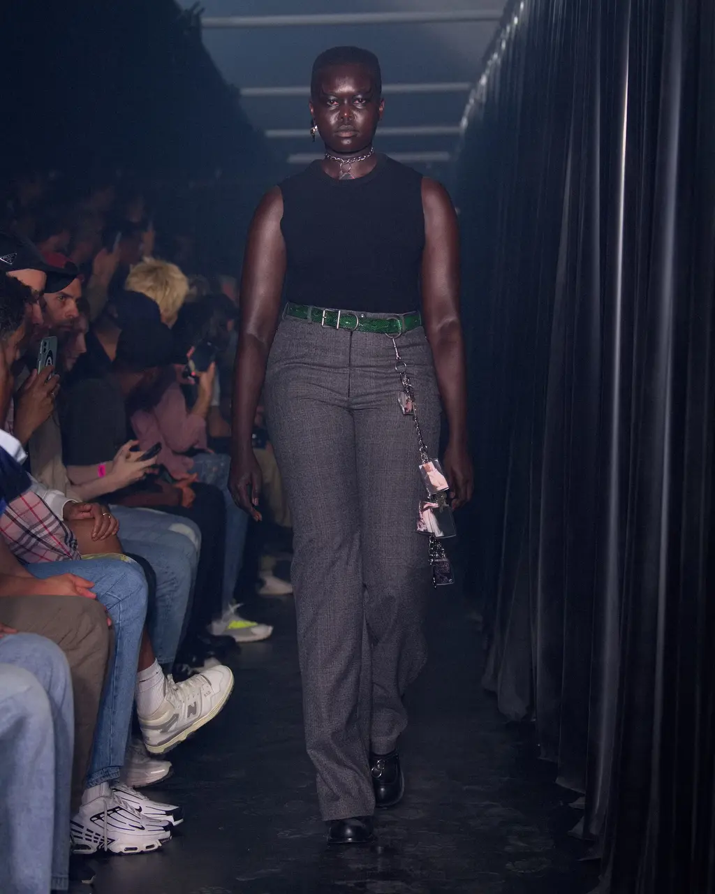 The looks belted out thick and fast, with the initial trench coat hugging the skin like a fetishistic straight jacket. Martine Rose is a master of proportion, whether elongating, accentuating or minimising. For SS23, pieces are shrunk, as if hurriedly borrowed from a one-night stand the morning-after. And where Rose has created kinky fantasies in football lads, ravers and even sexy uncles in the past, the jangling of sets of keys worn by models on the loop of their trousers conjured odd visions of a janitor stalking the corridor.