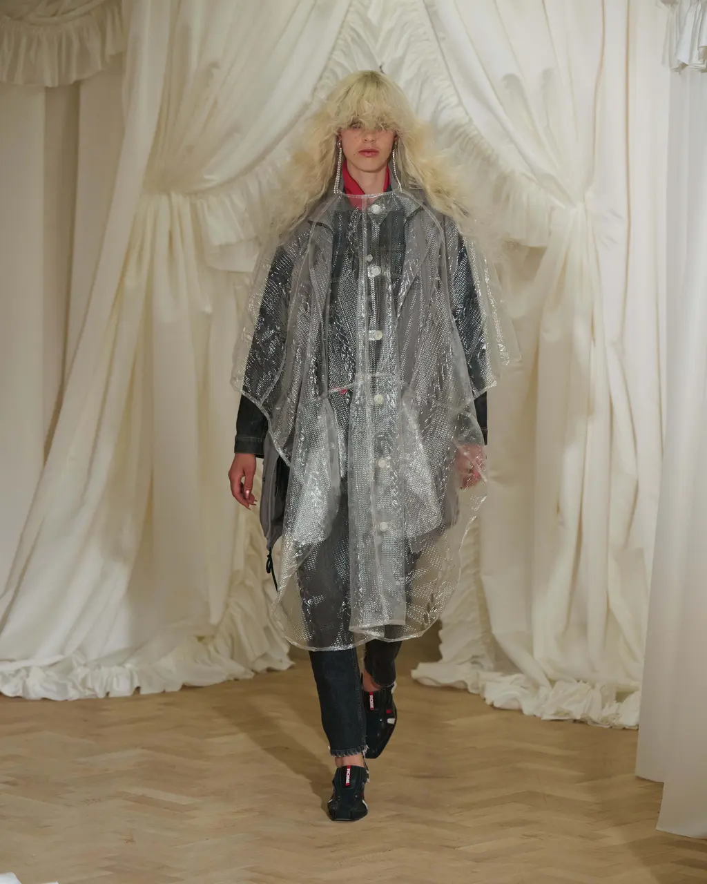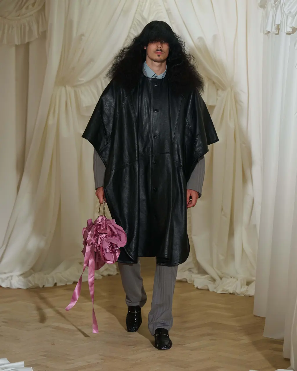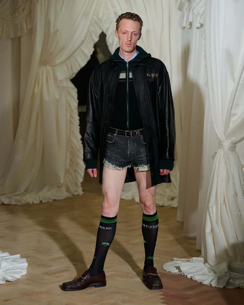 For this SS26 collection, things oscillate between being outright sexy and off-kilter – not unfamiliar territory for Martine. Proportion play is the main event, leading to shrunken, awkward silhouettes that “almost feel too small”. Second-skin lycra pieces, leather and denim, meanwhile, are “contorted, pulled and stretched across the body in funny ways”, frilly aprons make a cameo, and barbershop capes are reimagined into ponchos.