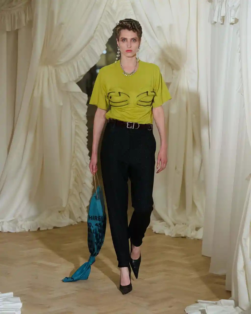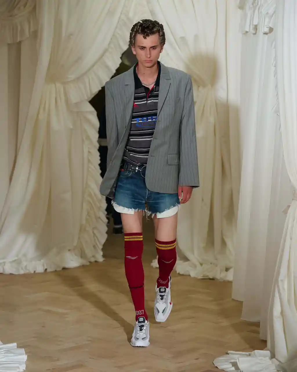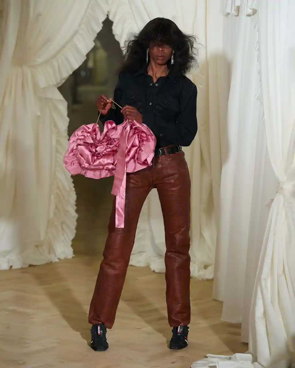 For this SS26 collection, things oscillate between being outright sexy and off-kilter – not unfamiliar territory for Martine. Proportion play is the main event, leading to shrunken, awkward silhouettes that “almost feel too small”. Second-skin lycra pieces, leather and denim, meanwhile, are “contorted, pulled and stretched across the body in funny ways”, frilly aprons make a cameo, and barbershop capes are reimagined into ponchos.