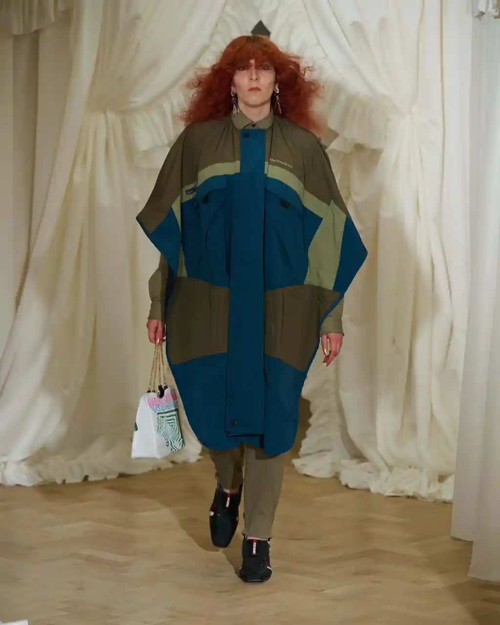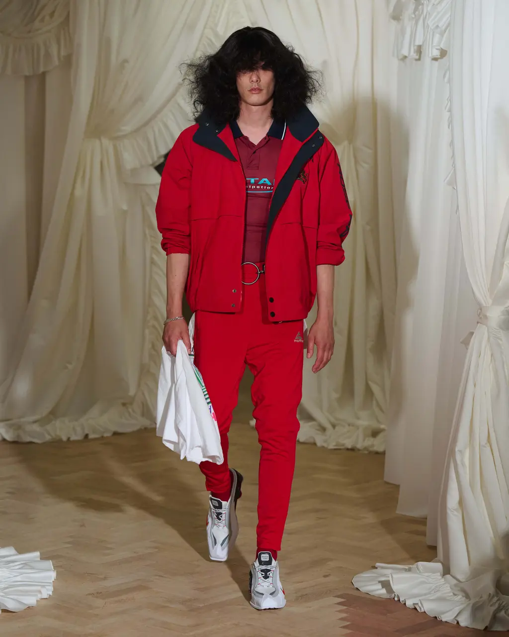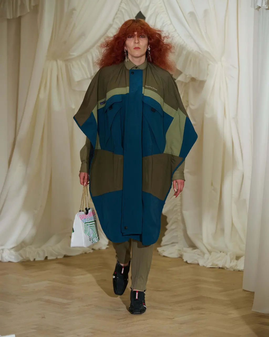 The show will also serve as a platform for Martine to unveil a new Nike collaboration – keep your eyes and ears to the ground as the drop is expected next month. Familiar archetypes that reappear on Martine’s runway include Harrington and puffer jackets, both of which have been suctioned, pulled and played with. “It’s nice when you can look at something and get the joke,” she continues, a glint in her eye, referring to the ballsy humour she tends to inject into her shows. “The references to the barbershop and the aprons and all of that…There are these moments of lightness that break it up a little bit.”