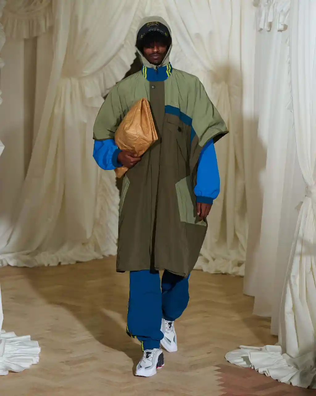 Now, back in her element – and her home city – Martine is in a different headspace. The designer often holds up a mirror to the marginalised communities and subcultures of London, from ’90s raves to a red-hot derelict sauna in Vauxhall (SS23), to mundane North London community centres (SS24). This time, she’s set her sights on the capital’s market traders. Think Roman Road vendors flogging knock-off designer tees, Whitechapel market’s vibrant array of exotic foods and old records, or fruit and veg sellers trying to shift produce on Peckham’s Rye Lane. And so, as she ruminated on this decades-old trade, the flicker of an idea was born.