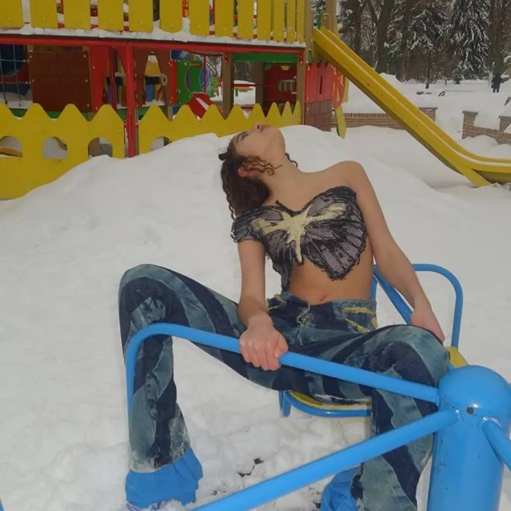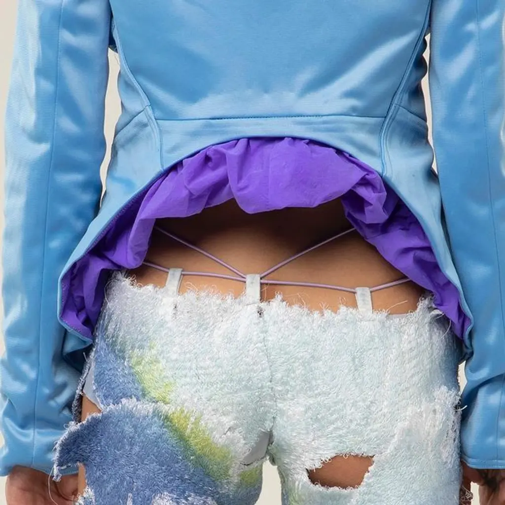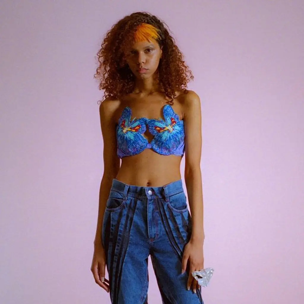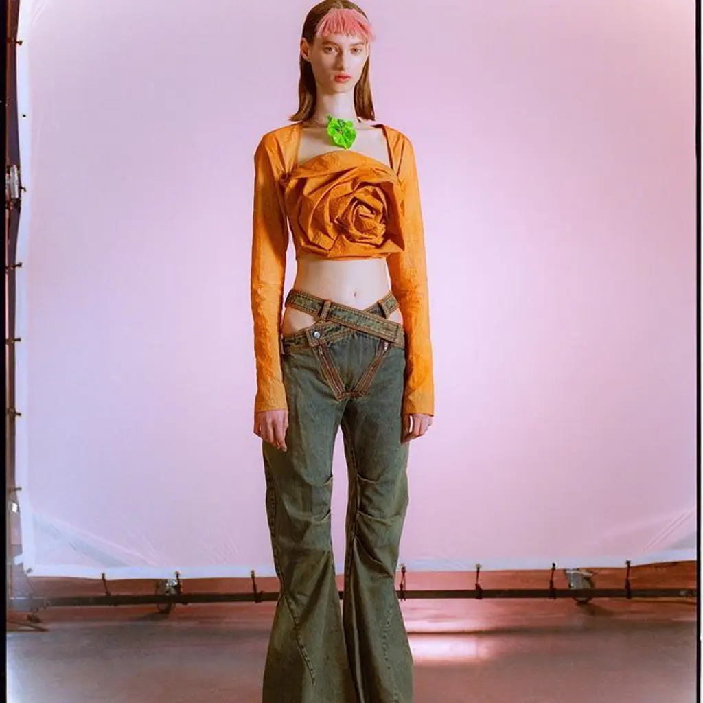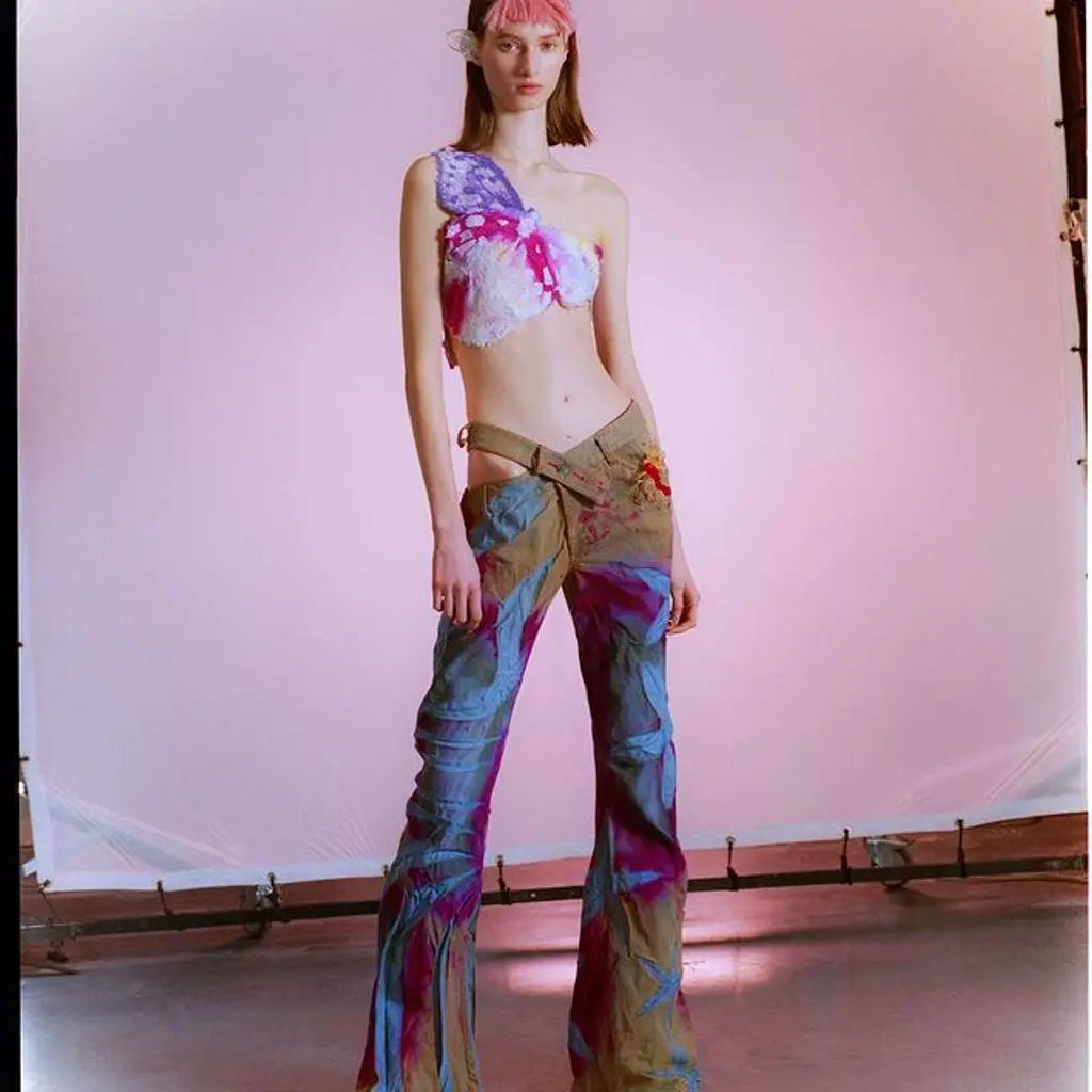 In an irreverent take on sensuality, skin was laid bare in exposed midriffs and the chest covered only by an oversized butterfly motif. Popova pays attention to the small details too, like her take on an exposed G‑string that plays into subversive references from the ’90s and ’00s – a space oddity of freedom, individuality and seduction. “To be honest, it is chaotic,” she says. “But that’s just how I feel!”