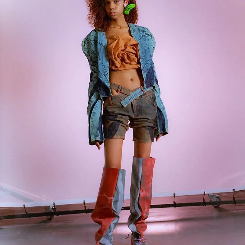 Morphed denim, gingham prints and micro shorts were nods to the lowbrow and, she admits, a departure from the high-fashion references she was initially captivated by upon her move to London. But the mashed-up style cues played closer to home. Without high street chains to visit as a teen, Popova often scoured second-hand shops, rifling through rails of unexpected gems to piece together mismatched outfits: “It’s just a completely different perspective on how you dress,” Popova says. And with that freeing outlook on shopping came an ethos she still carries forward: “My intention is that [my designs] should always be fun to wear. I never try to make something that just looks nice in pictures and that’s all.”