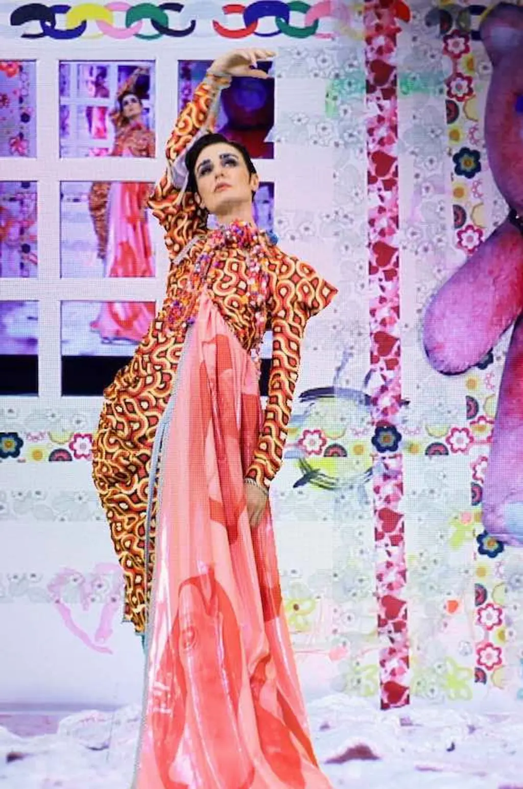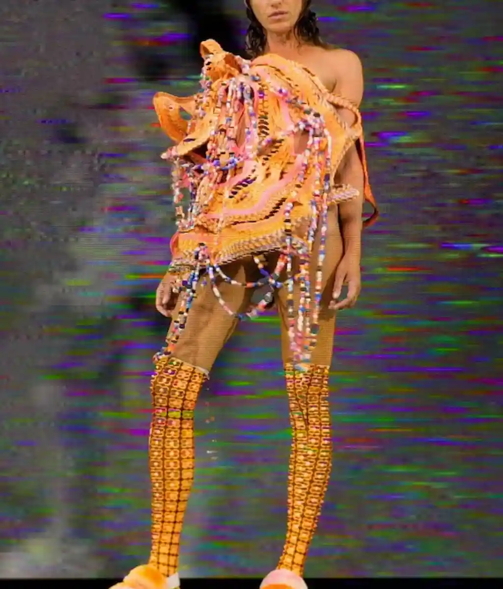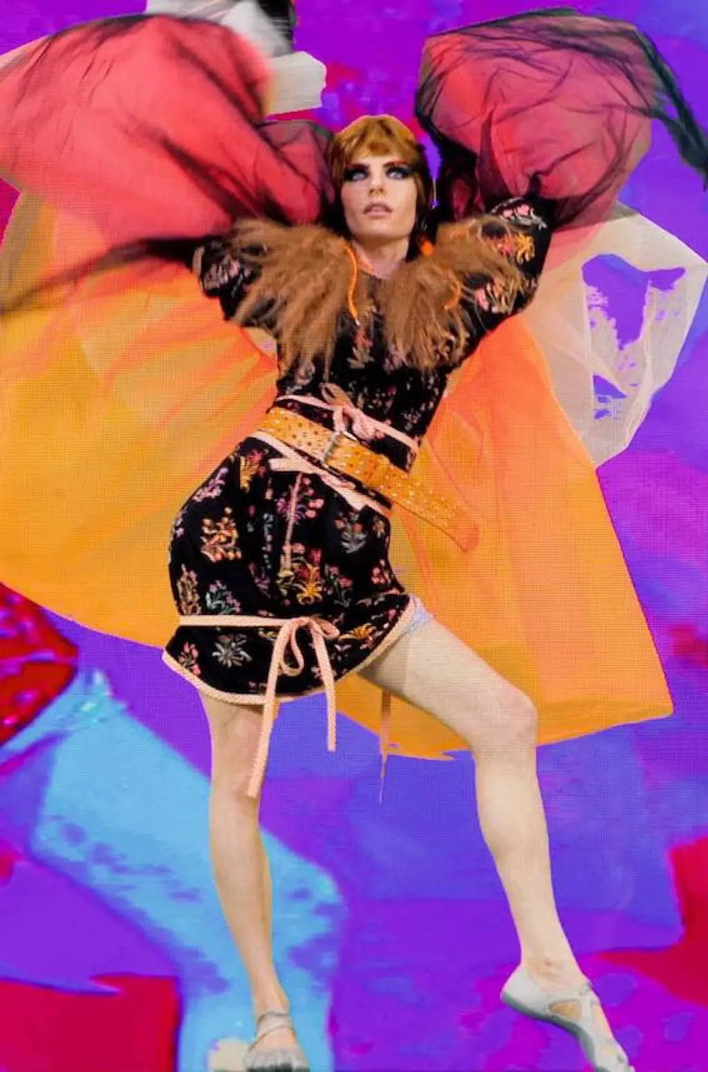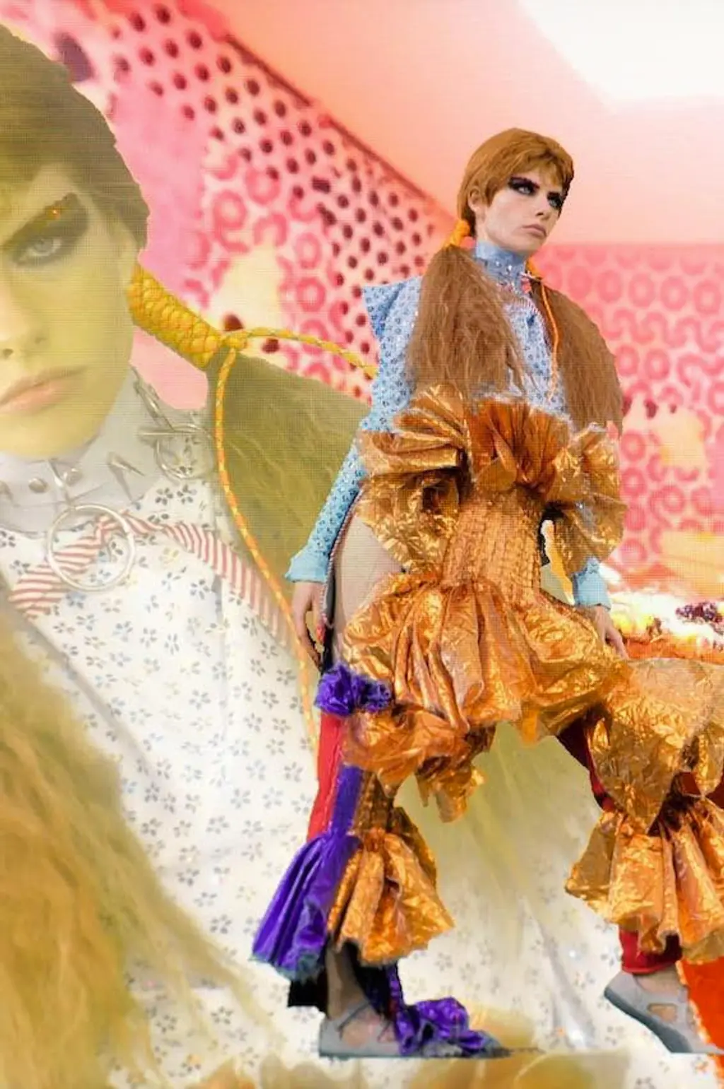 It was a homely affair for Matty Bovan, who looked to all sorts of home comforts – flowery wallpaper, family photographs, tweed blankets and oddball ornaments – for his SS22 collection, presented digitally in a psychedelic short film on Friday. Titled HYPERCRAFT, it patchworked the crazy coloured brain of a designer who has always been one part nostalgia, two parts future fashion.