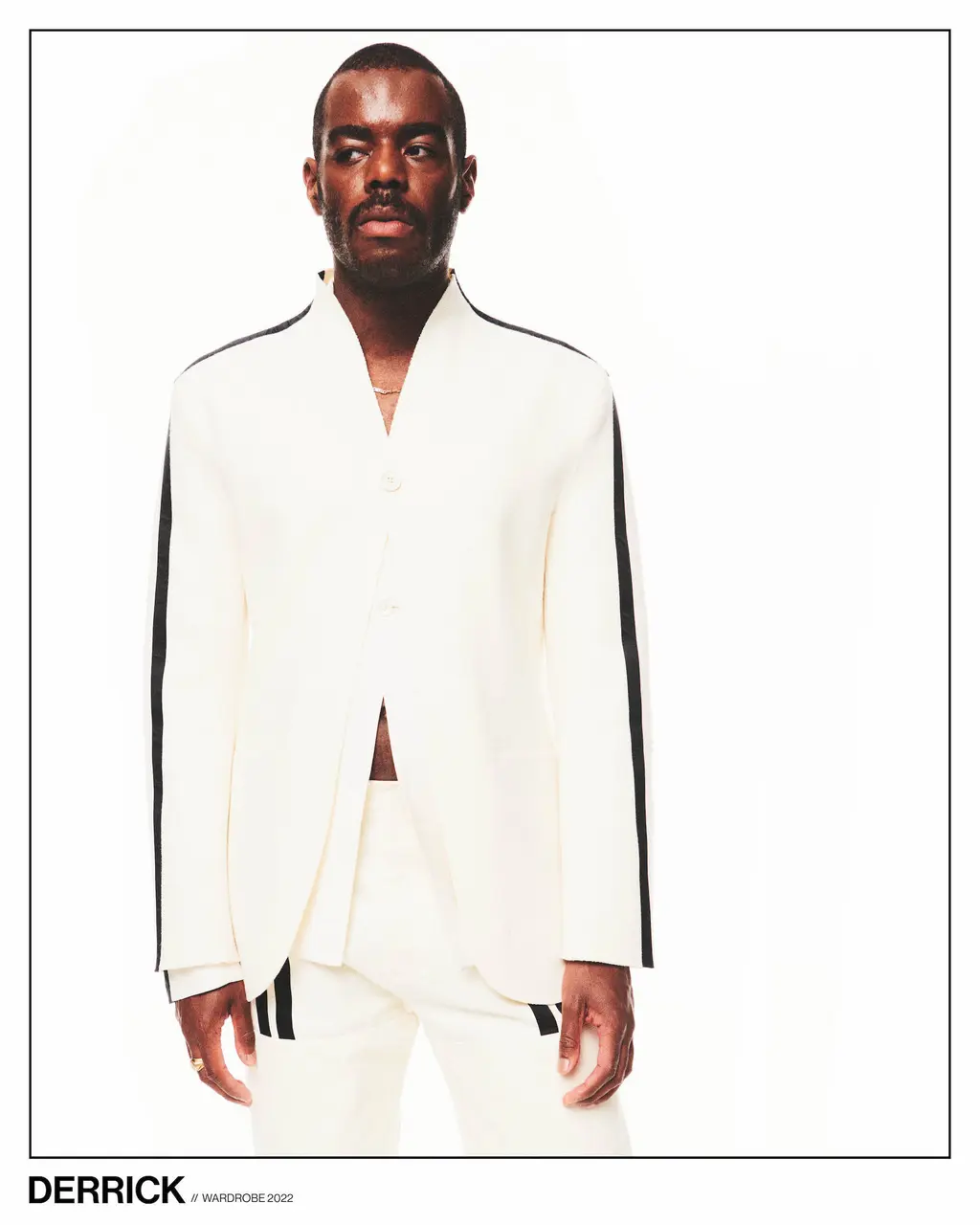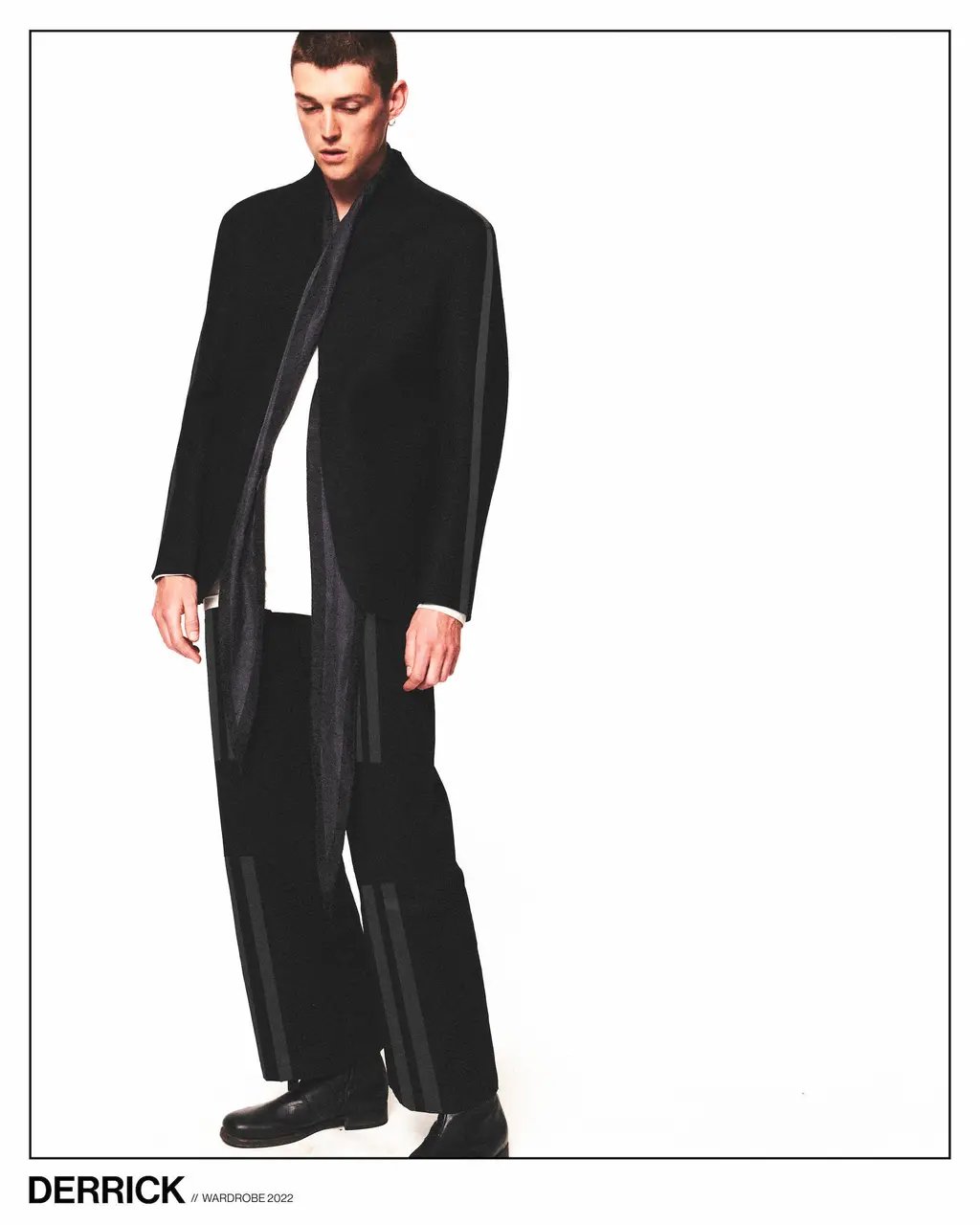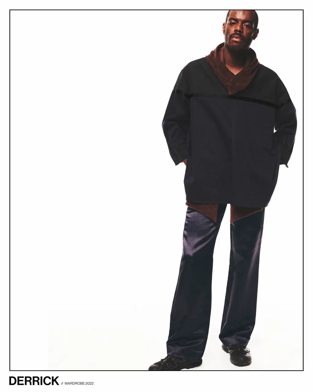 “Who is that ‘urban guy’ today? Maybe he’s creative, probably likes Tarantino… It’s about creating clothes that blur across those different expectations of dress codes,” Derrick says. “You could wear something that you would want to loaf around in, not have time to change, but go out in it anyway. ‘Getting away with it’ dressing is what I’m enjoying exploring with my stuff at the moment.”