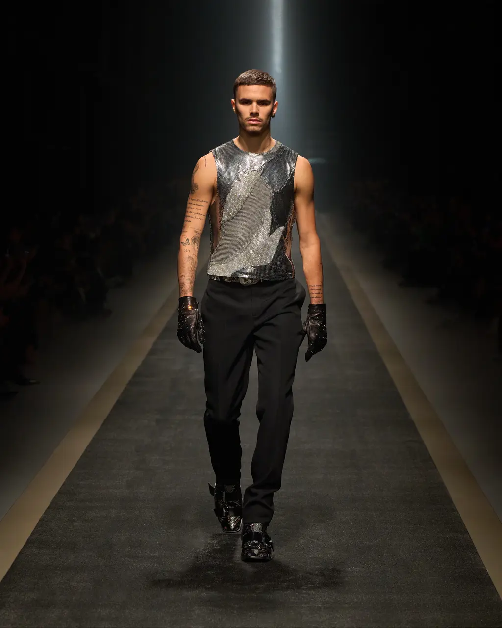 At Versace, an abandoned tram station was the location for AW25, and things kicked off with a series of models in flamboyant, baroque dresses that floated along the catwalk. The consistency with which things shifted gears gave us whiplash: one moment you were seeing blink-and-you-miss-it spiked heels, and the next you were watching Romeo Beckham and Alex Consani in metallic garb. An entire section consisted of jackets lined in Versace’s signature baroque print (Colman Domingo did it first at this year’s BAFTAs) and the closing looks featured peplum dresses. It was a head-scratching show – Vanessa Freidman echoed this sentiment on X. The most evident thing here was that Donatella was reminiscing, not to mention she wore a 1992 archive Versace jacket to take her (final?) bow.