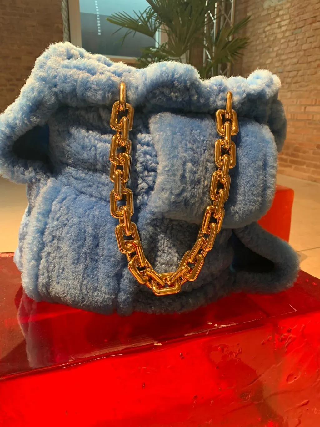 Powder-blue shearling woven into an oversized tote bag with a chunky gold chain handle – need we say more?