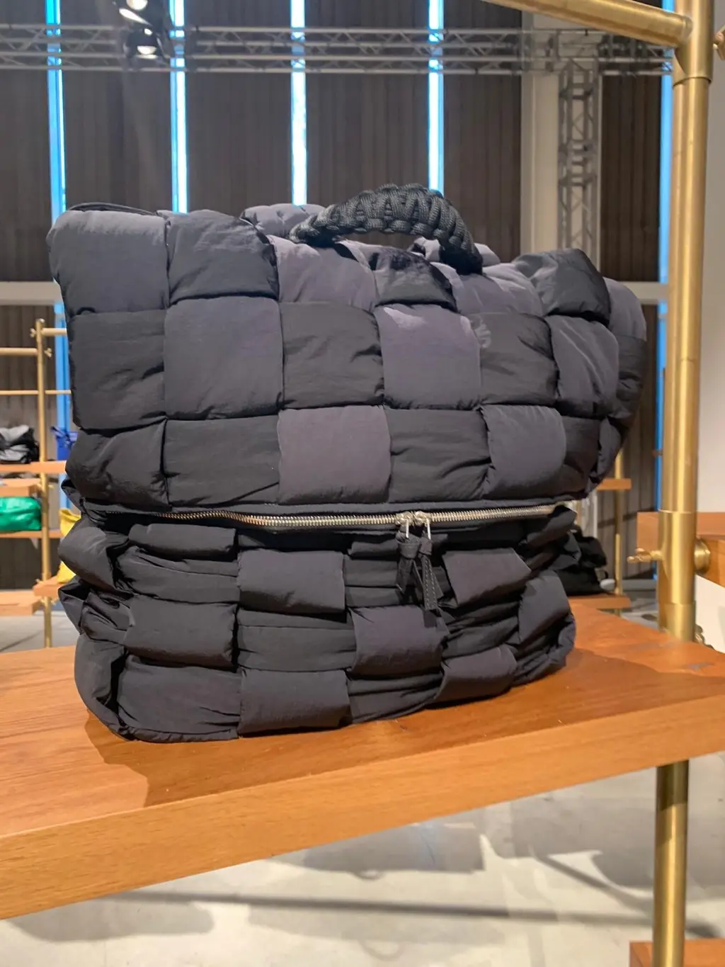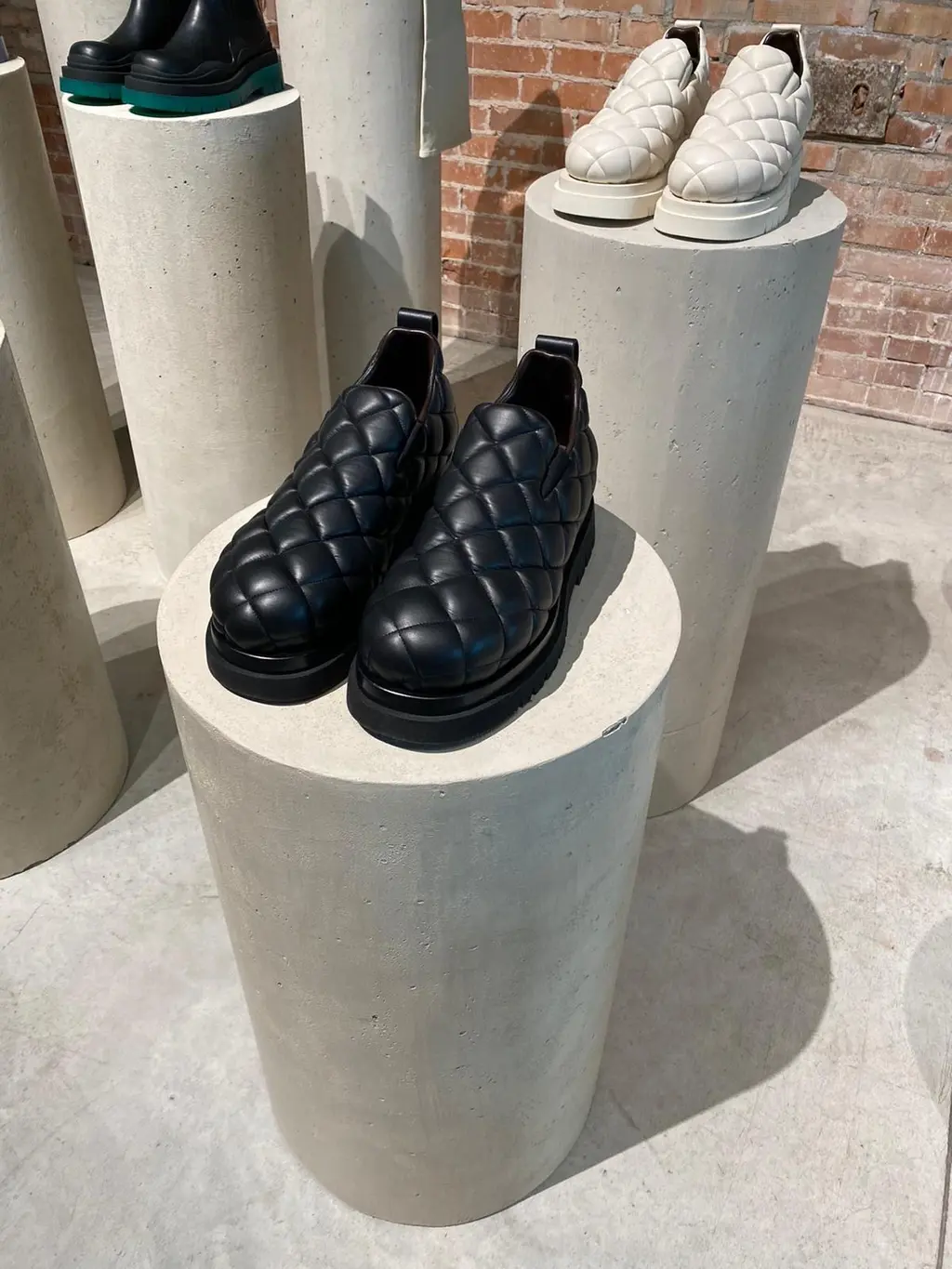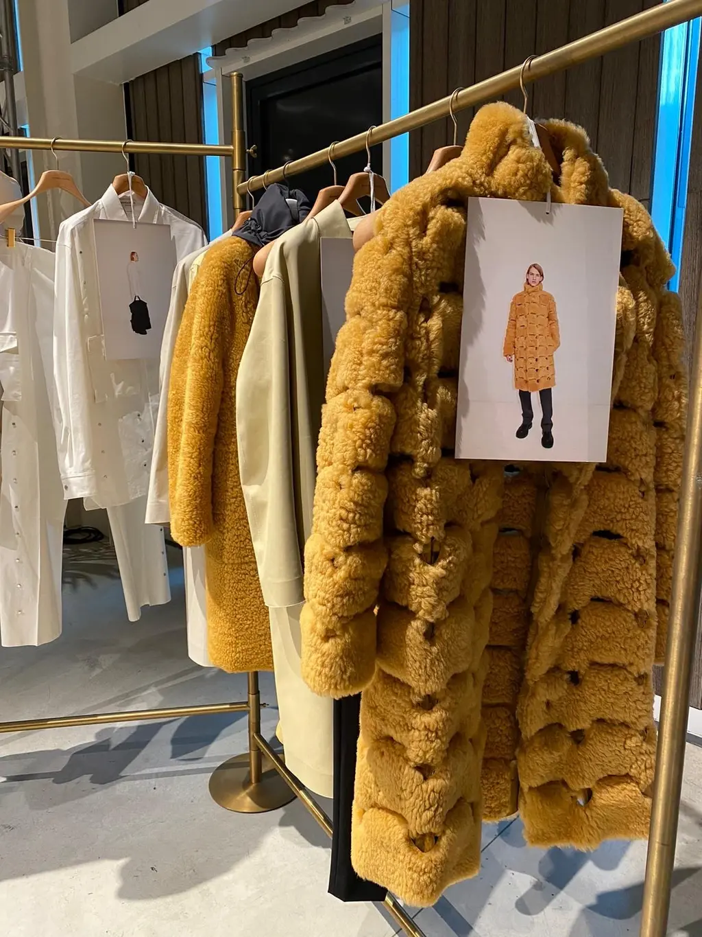 The laser-cut, shaggy, shearling coat in a honey hue and the giant flumpy quilted shoes served in sophisticated monochrome leather.
