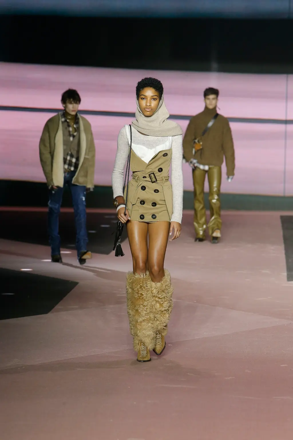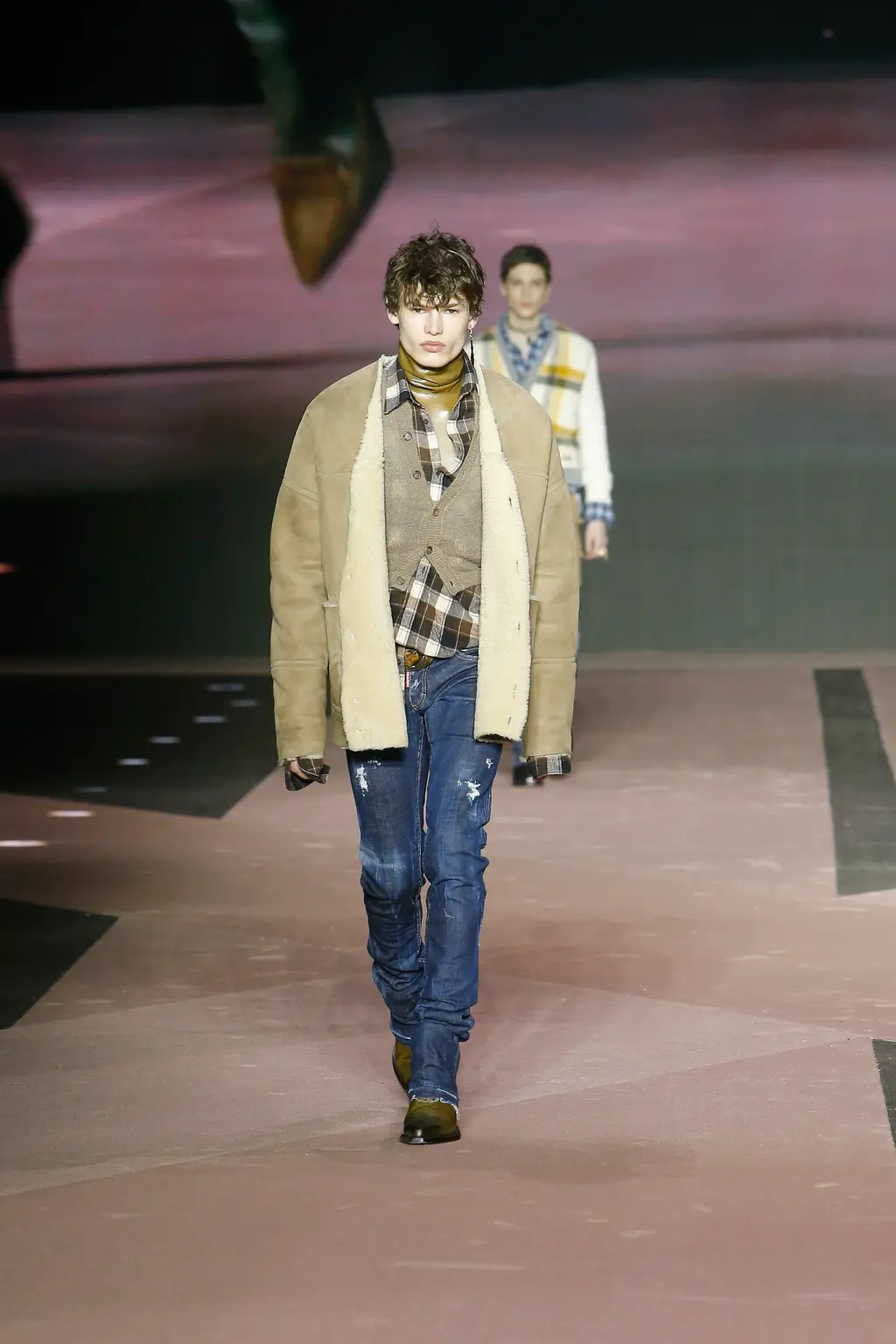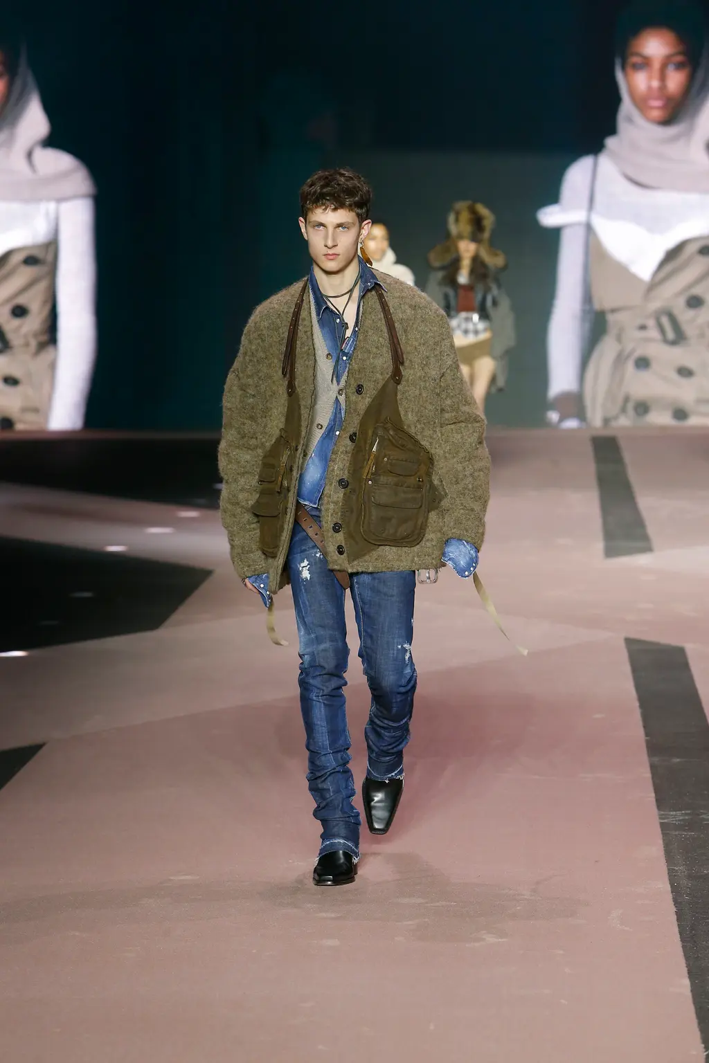 Think: shearling, battered denim, lumberjack check, signature trapper hats (oversized, of course) and vinyl camo. Voluminous tops were teamed with skinny bottoms, while ready-to-be-ripped-off trompe l’oeil trousers were styled sexily with undone belts.
