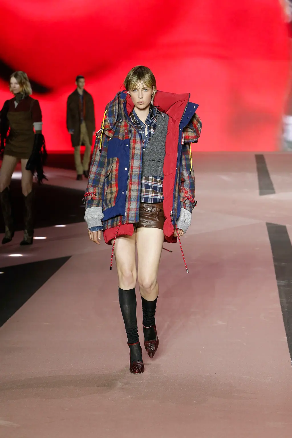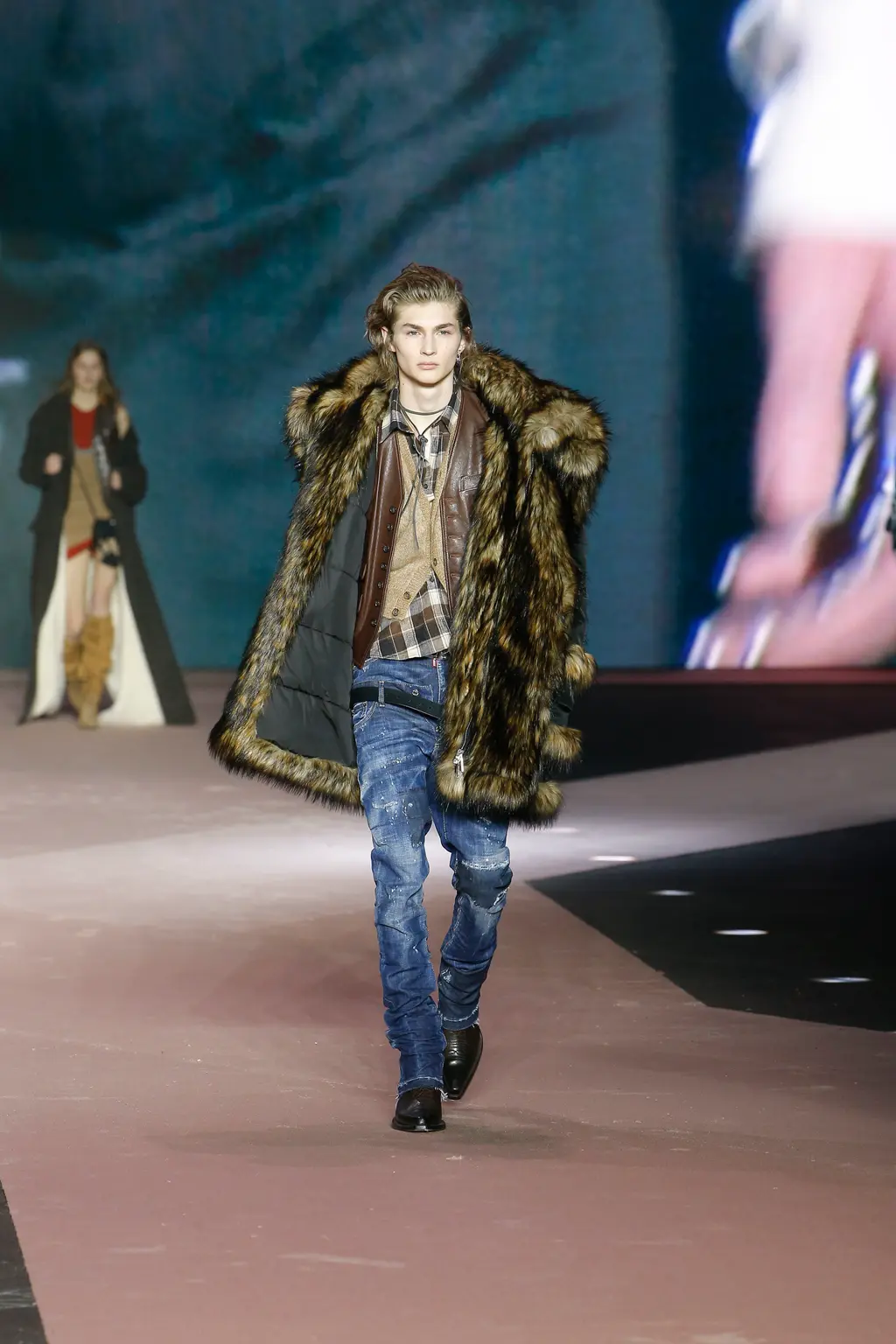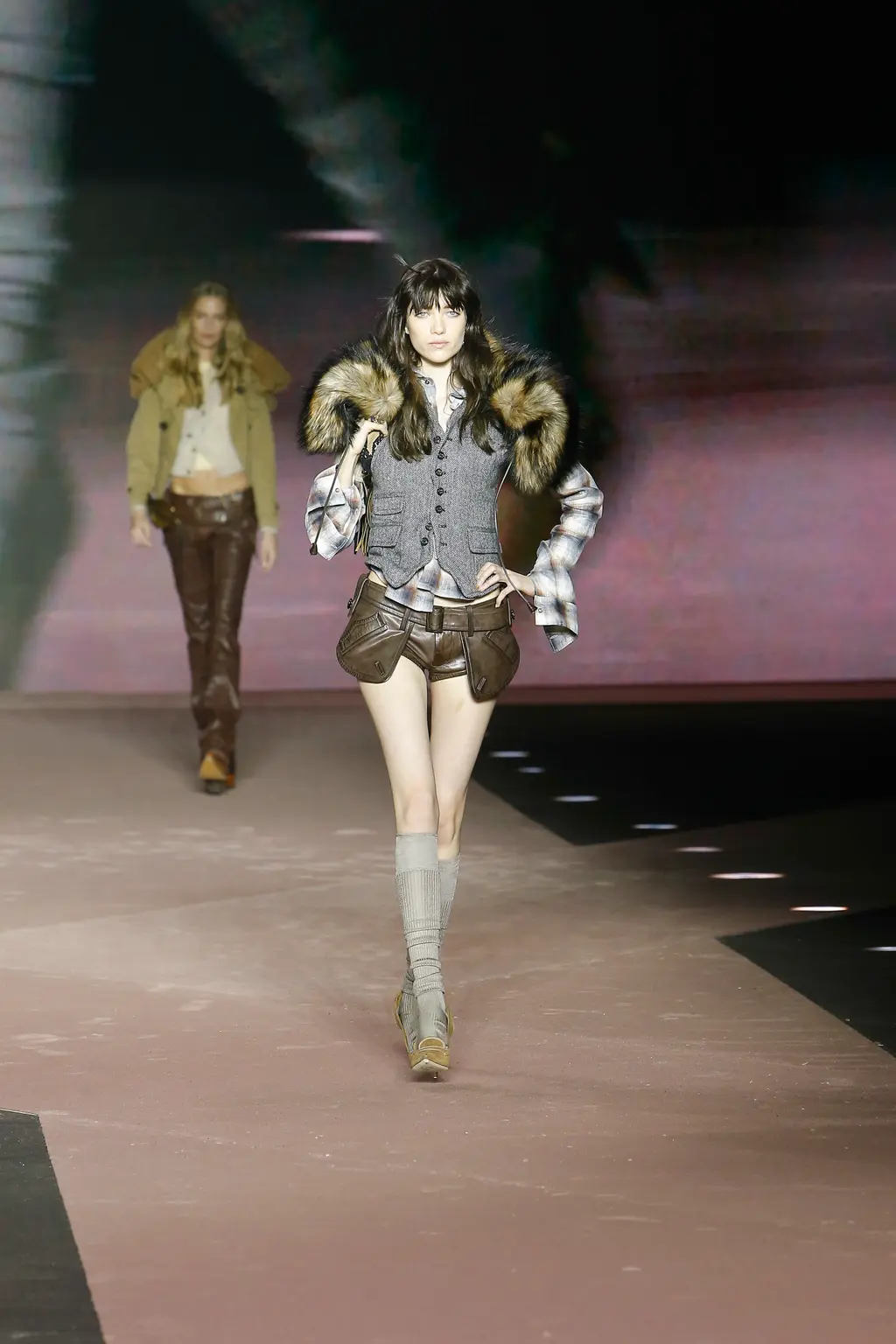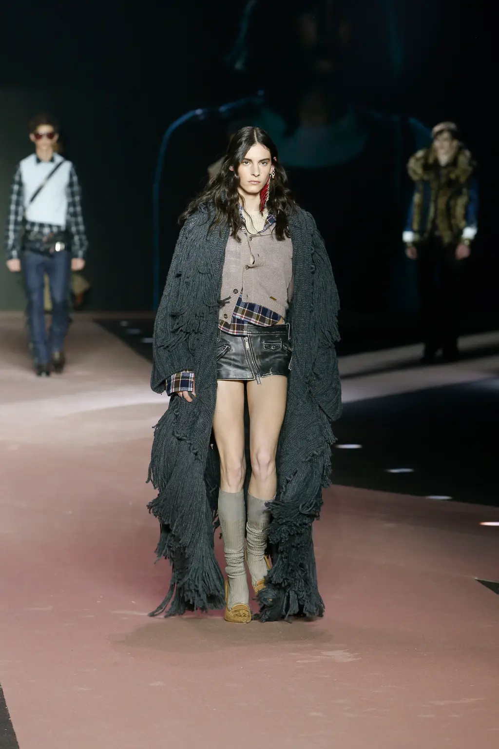Think: shearling, battered denim, lumberjack check, signature trapper hats (oversized, of course) and vinyl camo. Voluminous tops were teamed with skinny bottoms, while ready-to-be-ripped-off trompe l’oeil trousers were styled sexily with undone belts.