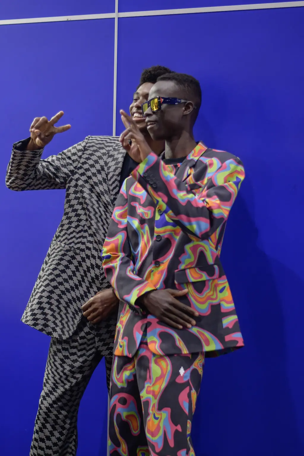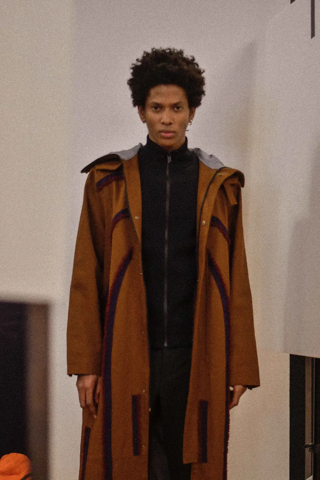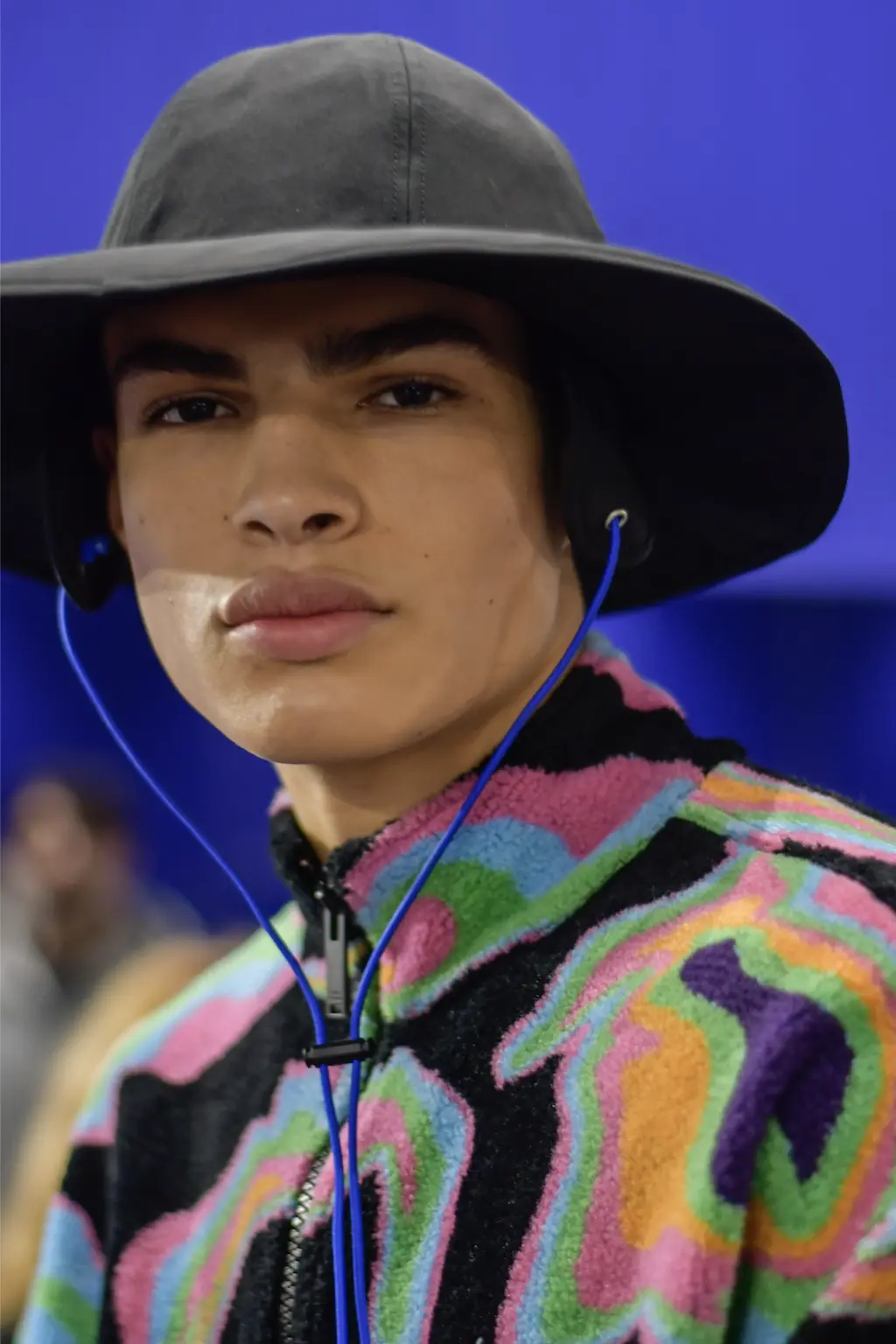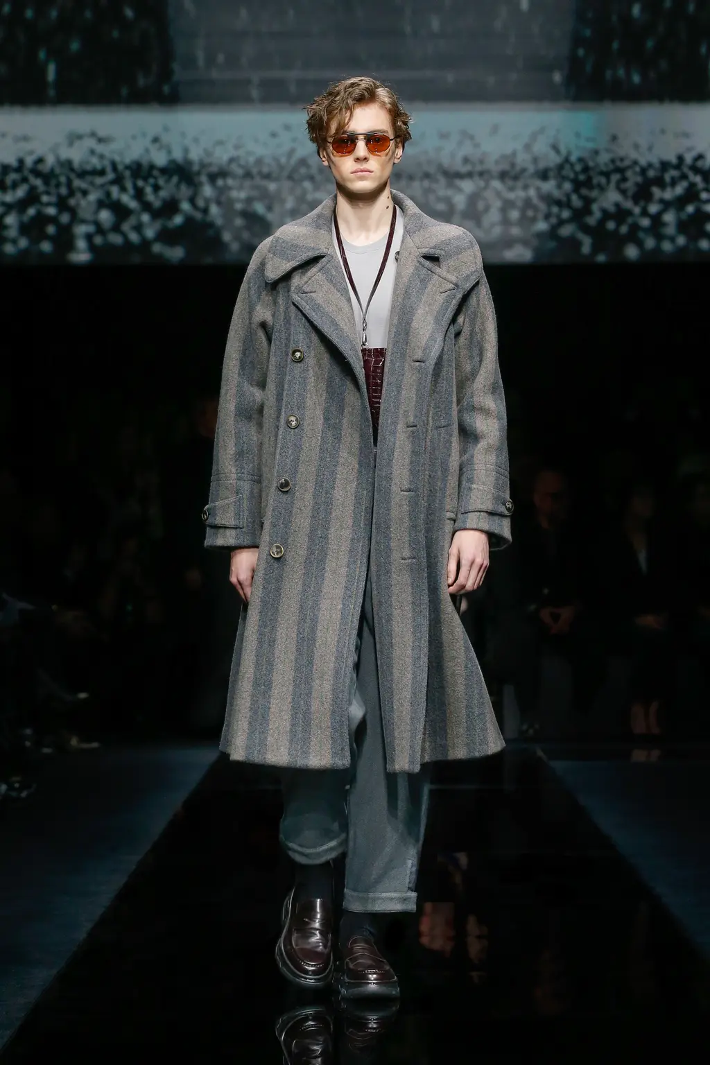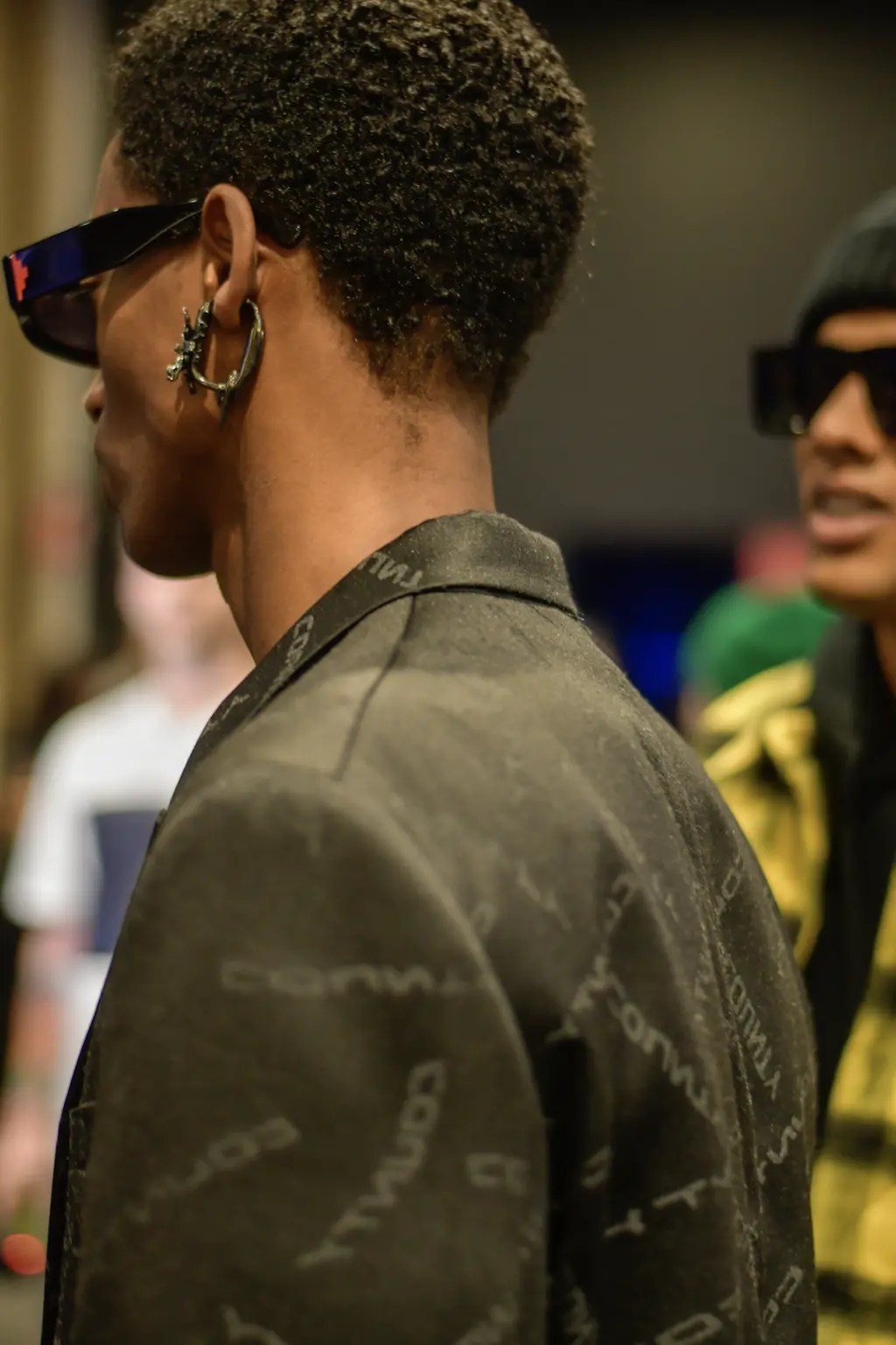 The Italian-Lebanese designer’s AW20 collection of functional, wearable pieces was peppered with stand-out, psychedelic prints: a vivid swirl-pattern seen in fleece and as a two-piece suit and a distorted houndstooth used for a monochrome, mohair jumper and a number of outerwear pieces. (Also see: the electric-blue and black iteration that carpeted the show venue.) Eye-catching accessories came in the shape of rectangular shades with iridescent lenses and a number of angular, oxidised silver earpieces that stuck out from the ear at a right angle, or hung from the lobe.