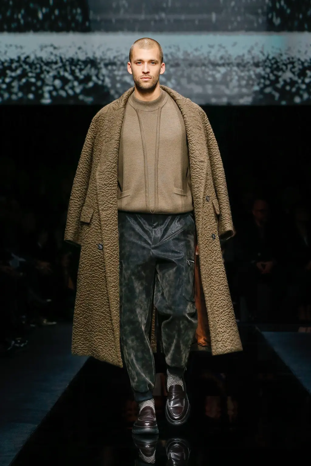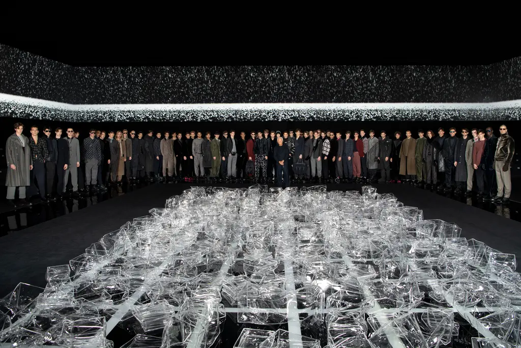 Giorgio Armani’s AW20 collection was a reaction to the times. According to Armani, it was a lesson in “enduring elegance” – one that took us on a journey from the snow-capped mountains of The Alps to a candle-lit Italian cocktail lounge. A dozen monochrome, padded and puffed, protective Armani Neve looks came first – each well equipped to protect its wearer against even the most extreme elements – followed by a number of multi-textured looks in natural, earthy tones: wool trousers, bear-like fleeces, a biscuit-beige Astrakhan coat and khaki velvet layering. Finally, a series of printed and textured tailored ensembles – in many shades of grey – morphed into ten black velvet evening fits. Endurance to elegance, complete.