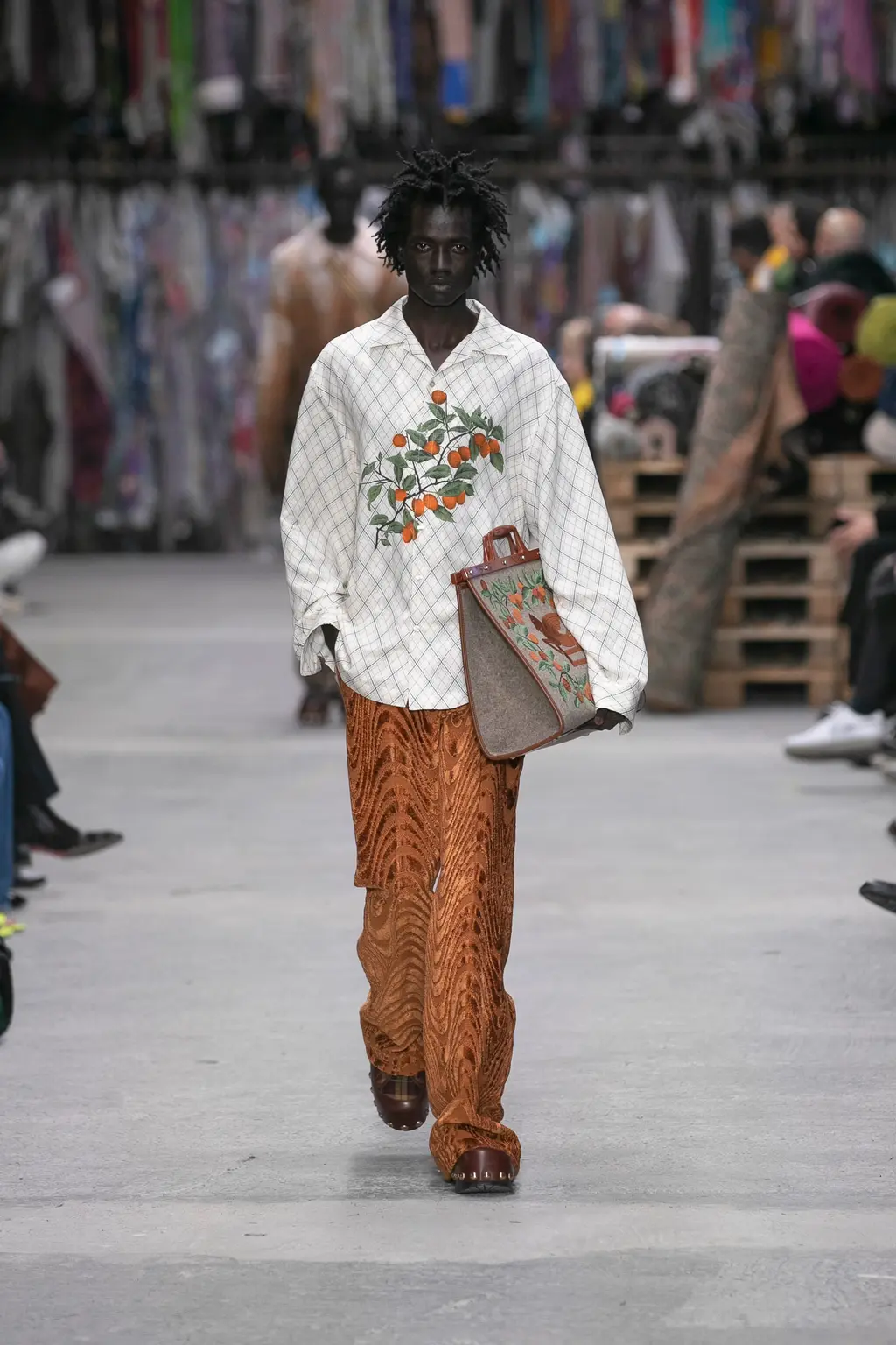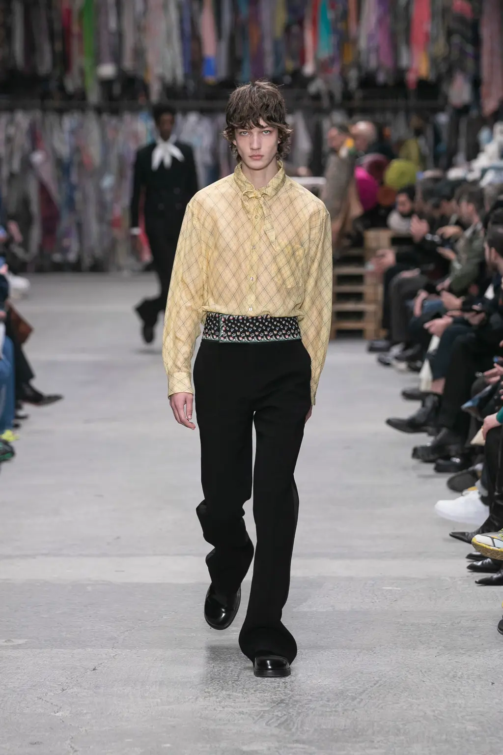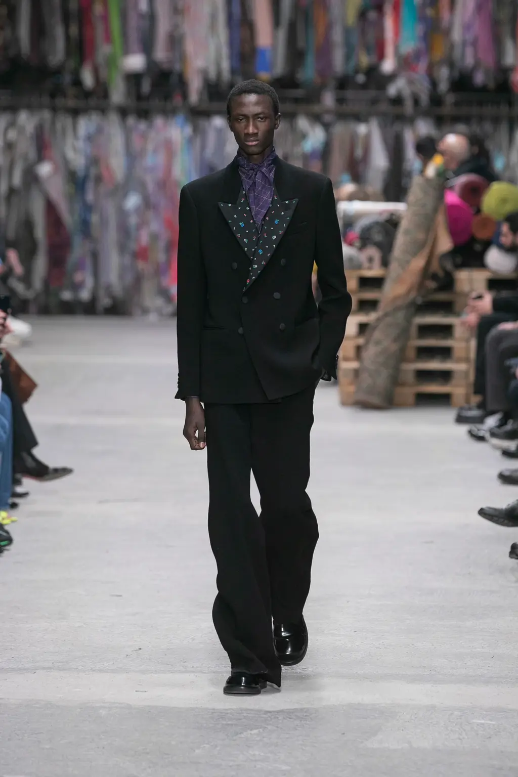 The kind of show where people turn to each other and whisper: “This is really good, isn’t it?” Sandra Salibian said it nicely in her review for WWD, but it felt like you were joining in the “discovery process” along with De Vincenzo, the set surrounded by rolls of fabric, that echoed on the runway. “Tailoring [has always been] beautiful and important for [Etro],” said De Vincenzo, as he spoke with a really lovely amount of reverence for the brand backstage. “They started producing and showing men’s fabrics, especially the tartan. It’s one of the most important fabrics in the [brand’s] history. What I’m doing is just studying everyday and taking inspiration from what people don’t know yet [about the brand’s history]. Because it’s a long story. And tailoring and the masculine is something that Etro has in its codes.”
