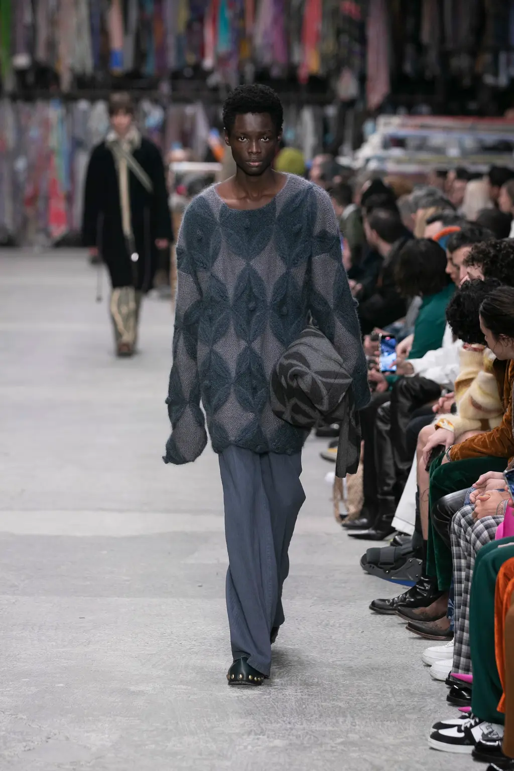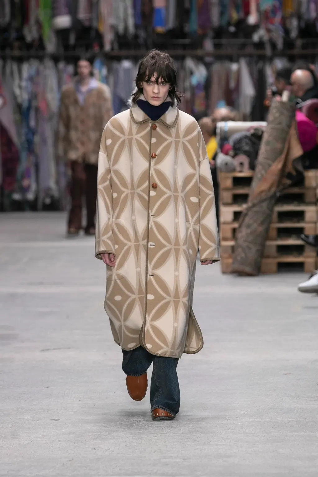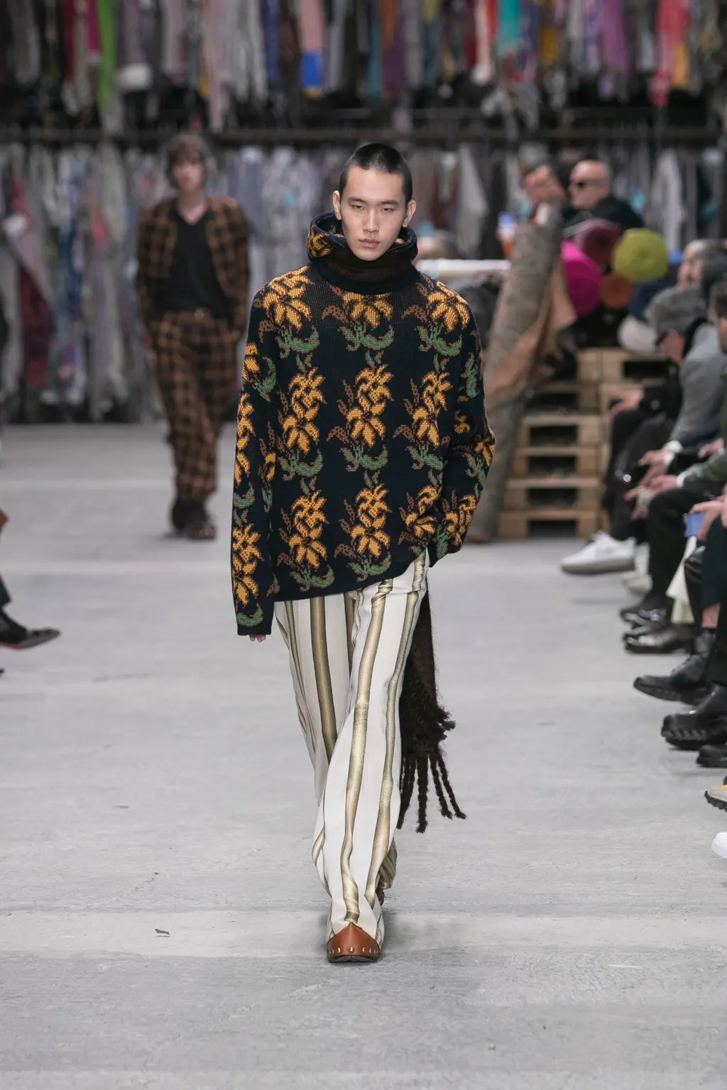 The kind of show where people turn to each other and whisper: “This is really good, isn’t it?” Sandra Salibian said it nicely in her review for WWD, but it felt like you were joining in the “discovery process” along with De Vincenzo, the set surrounded by rolls of fabric, that echoed on the runway. “Tailoring [has always been] beautiful and important for [Etro],” said De Vincenzo, as he spoke with a really lovely amount of reverence for the brand backstage. “They started producing and showing men’s fabrics, especially the tartan. It’s one of the most important fabrics in the [brand’s] history. What I’m doing is just studying everyday and taking inspiration from what people don’t know yet [about the brand’s history]. Because it’s a long story. And tailoring and the masculine is something that Etro has in its codes.”