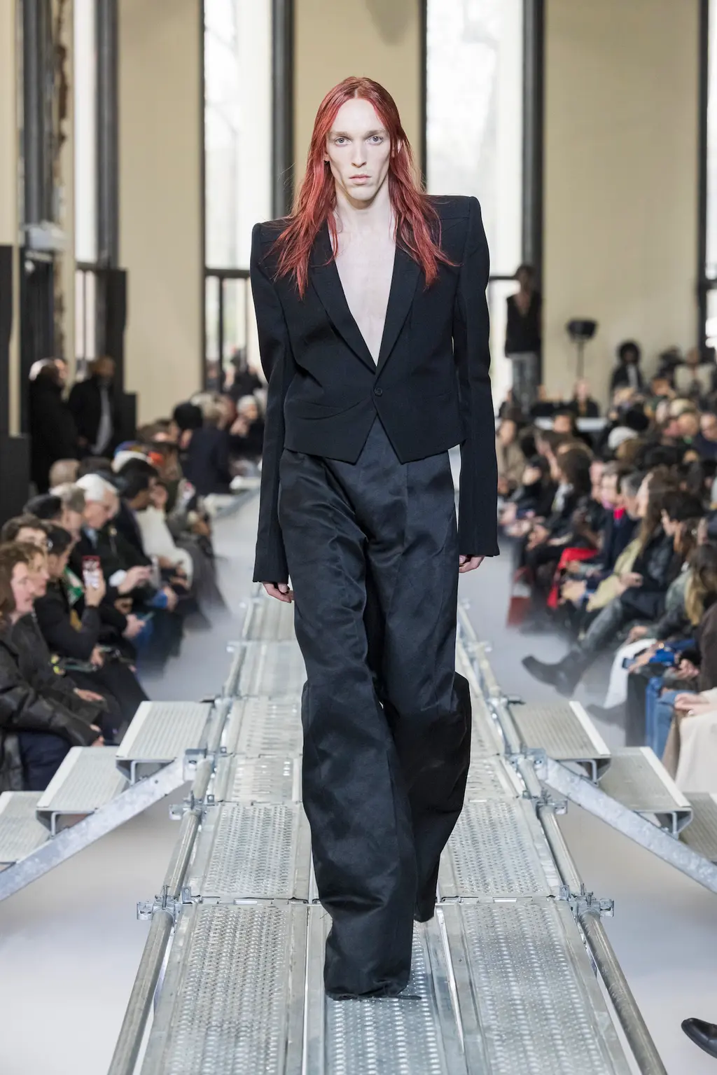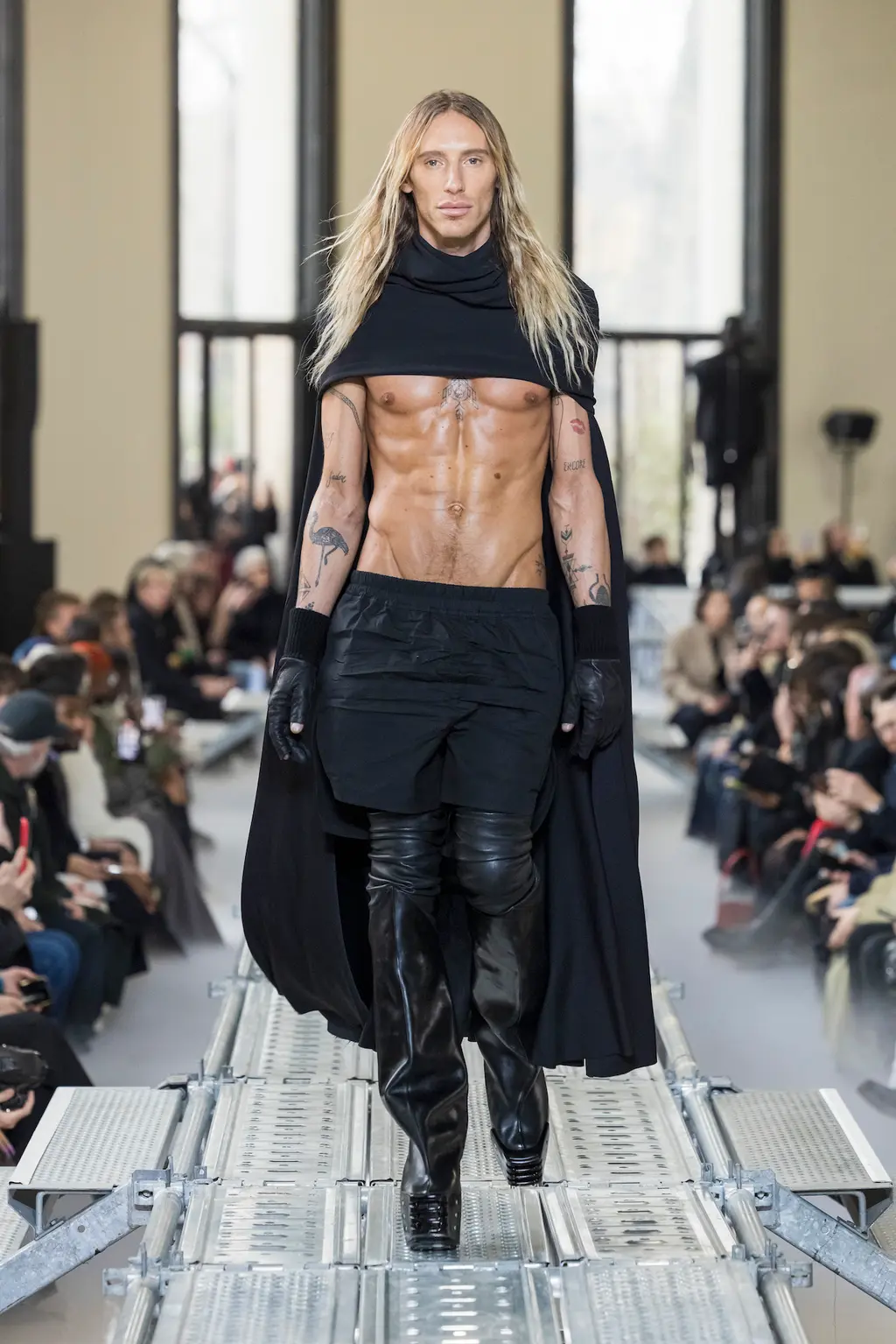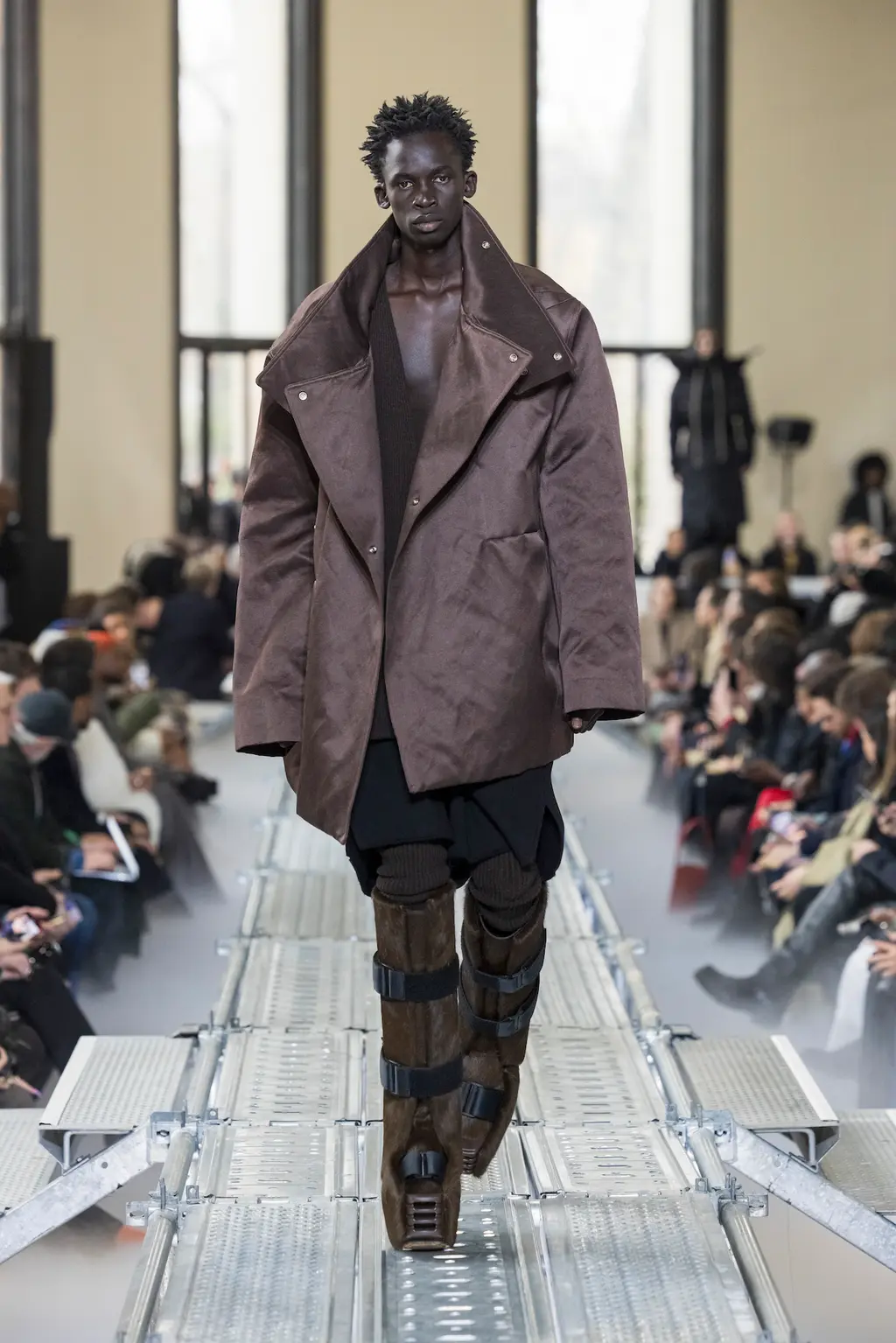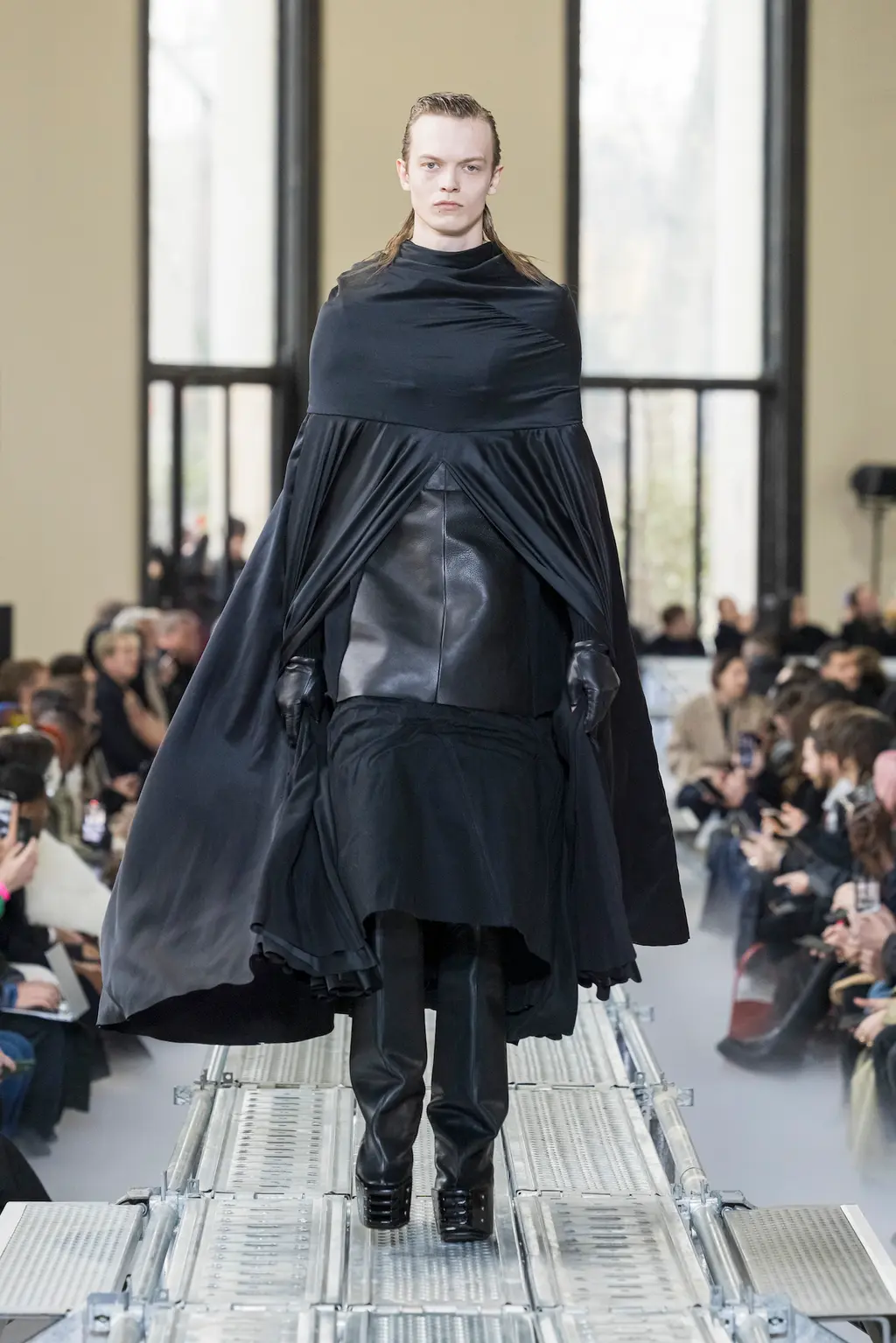 At Rick Owens’ usual venue, Palais de Tokyo, this time on a runway constructed from industrial metal scaffolding that allowed Owens’ models to tower above the audience, elevated higher still by their platform boots.