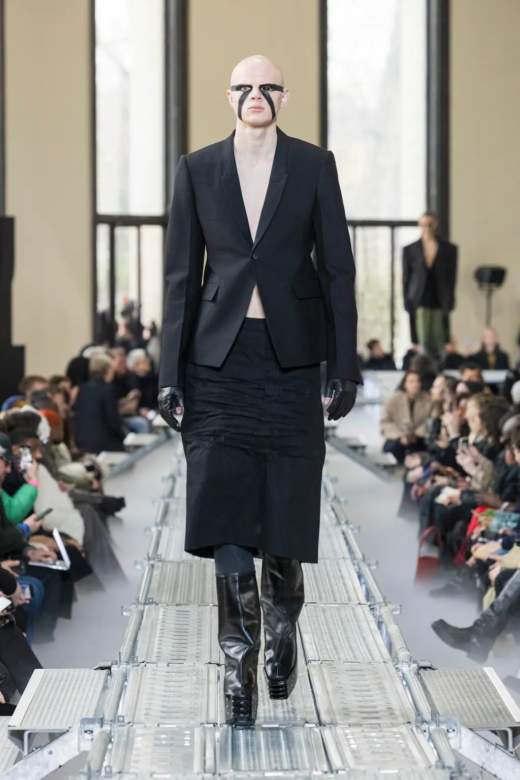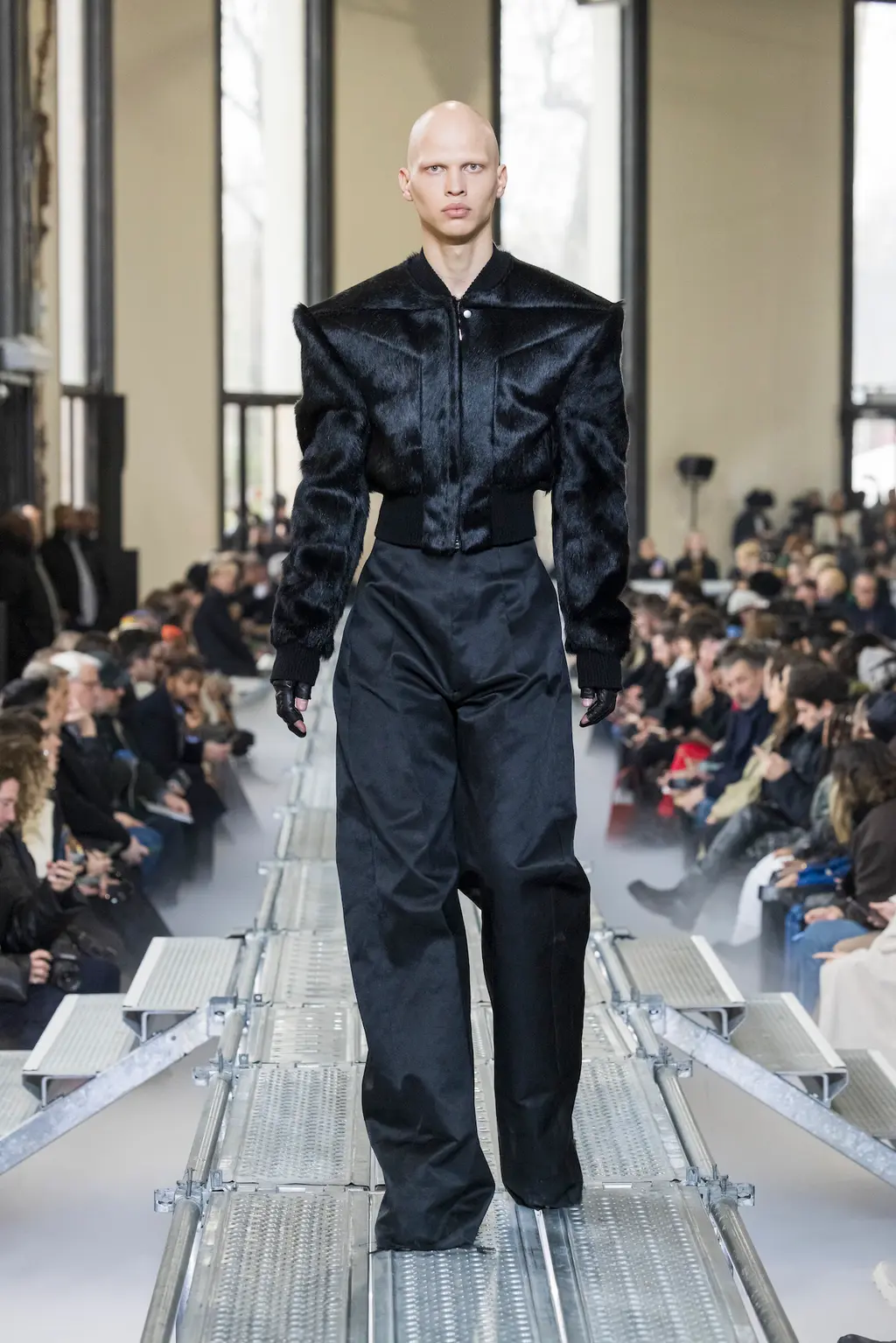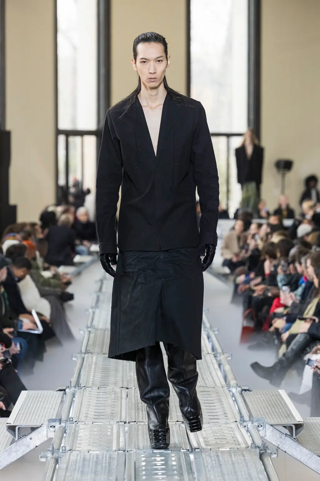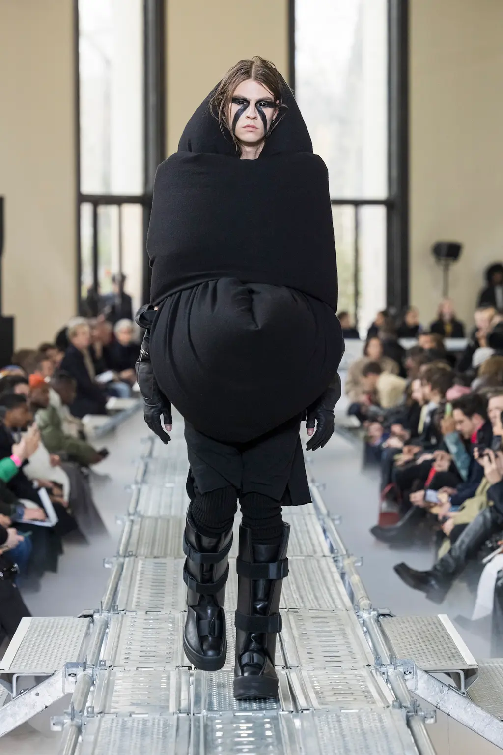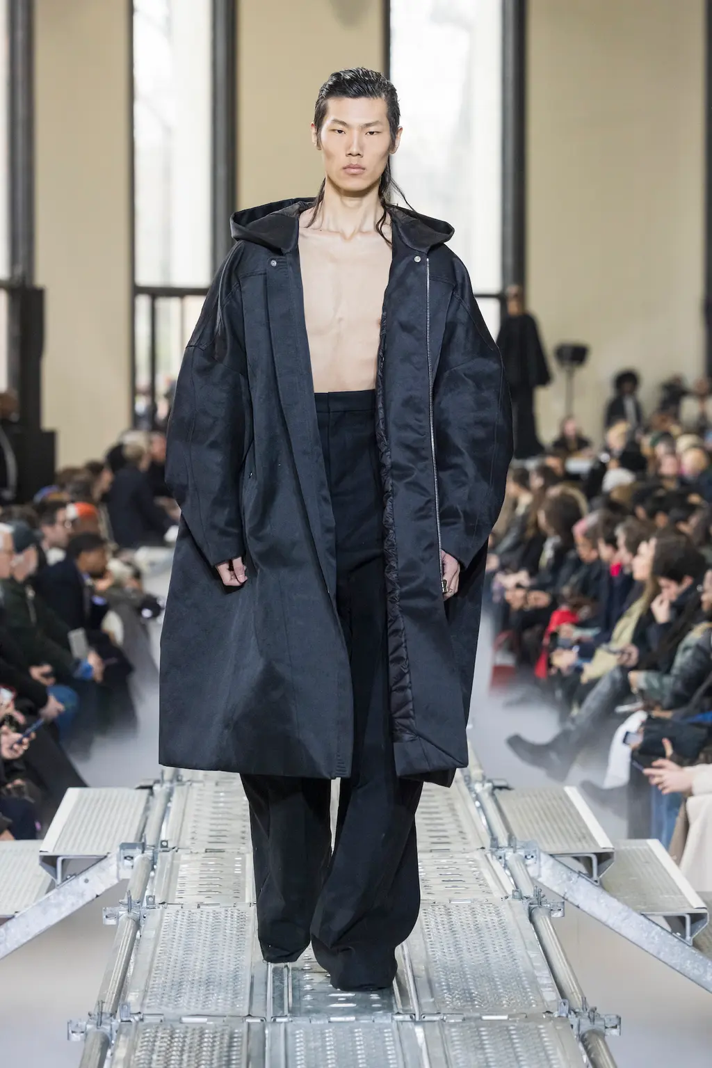 At Rick Owens’ usual venue, Palais de Tokyo, this time on a runway constructed from industrial metal scaffolding that allowed Owens’ models to tower above the audience, elevated higher still by their platform boots.