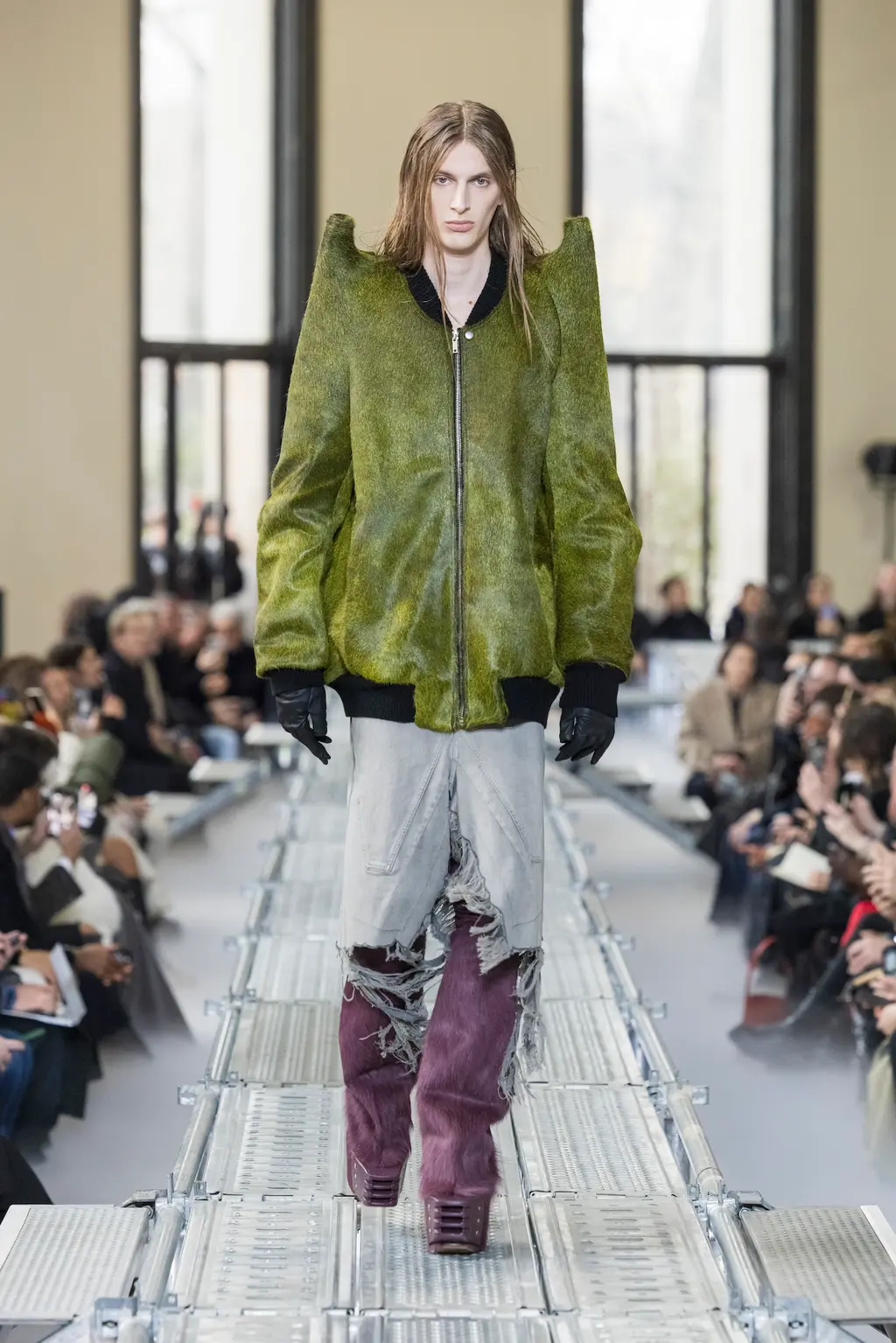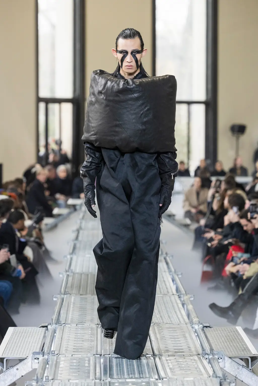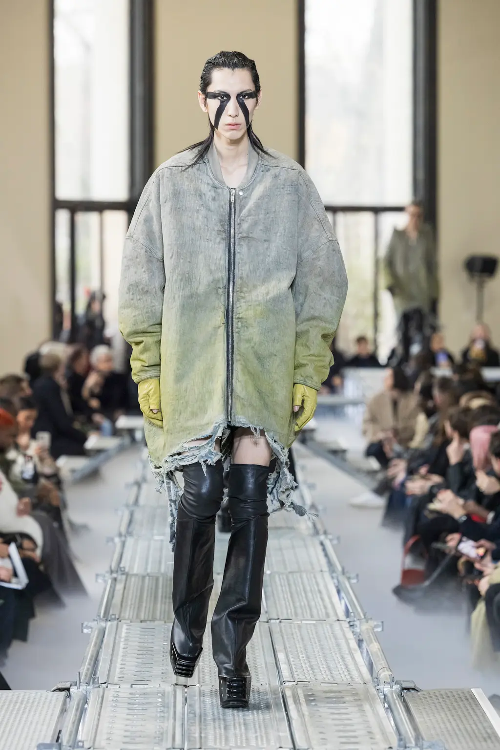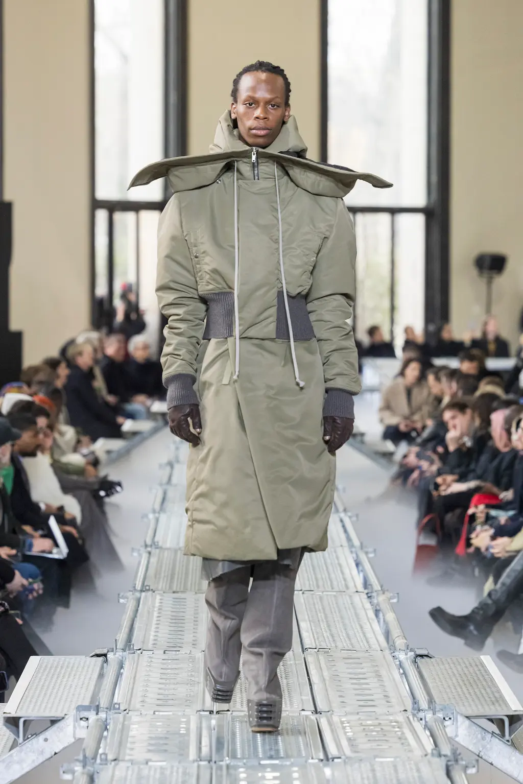 At Rick Owens’ usual venue, Palais de Tokyo, this time on a runway constructed from industrial metal scaffolding that allowed Owens’ models to tower above the audience, elevated higher still by their platform boots.