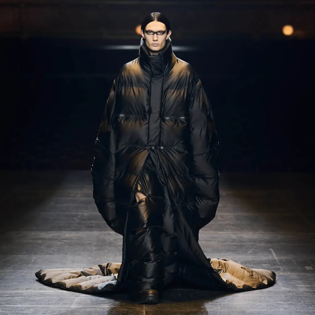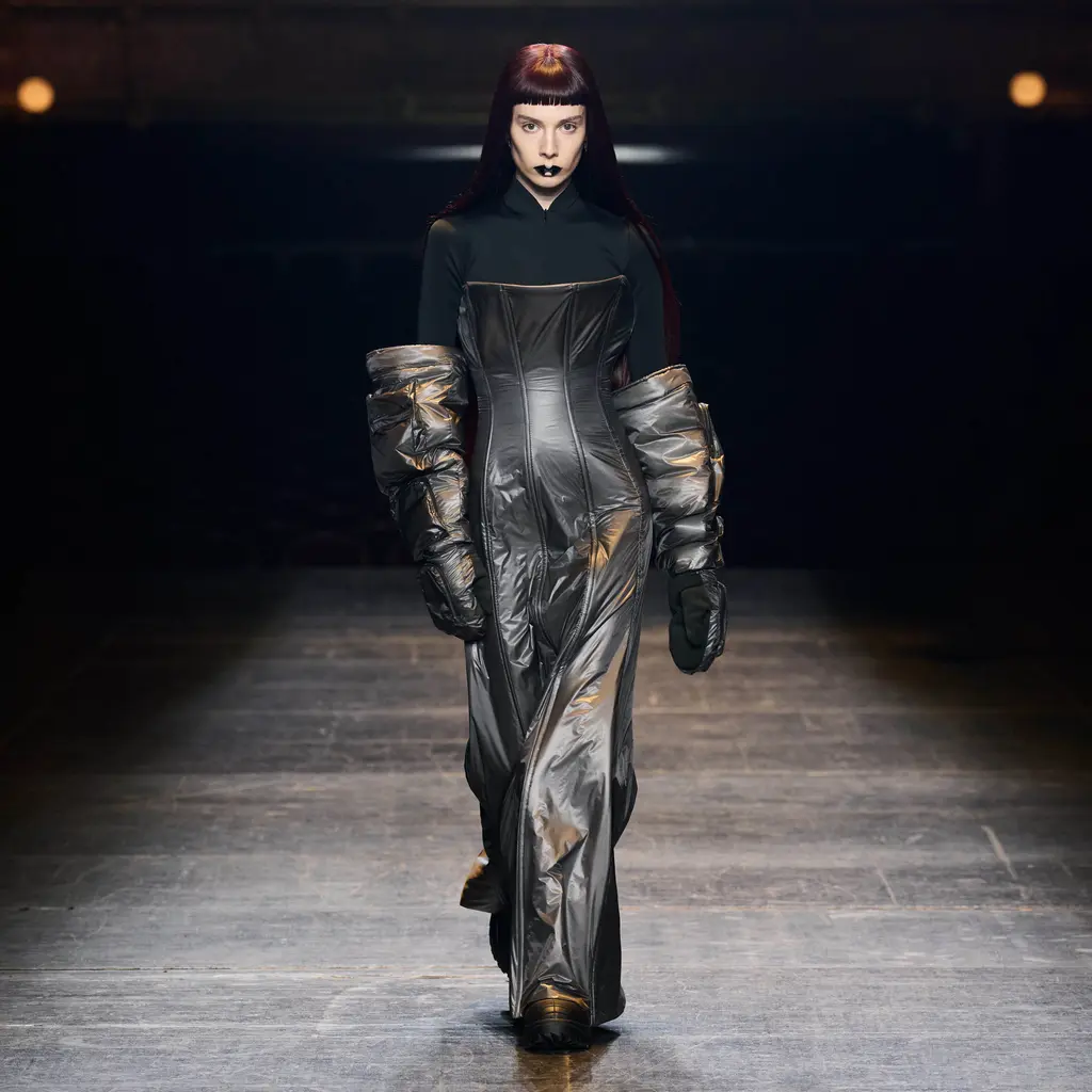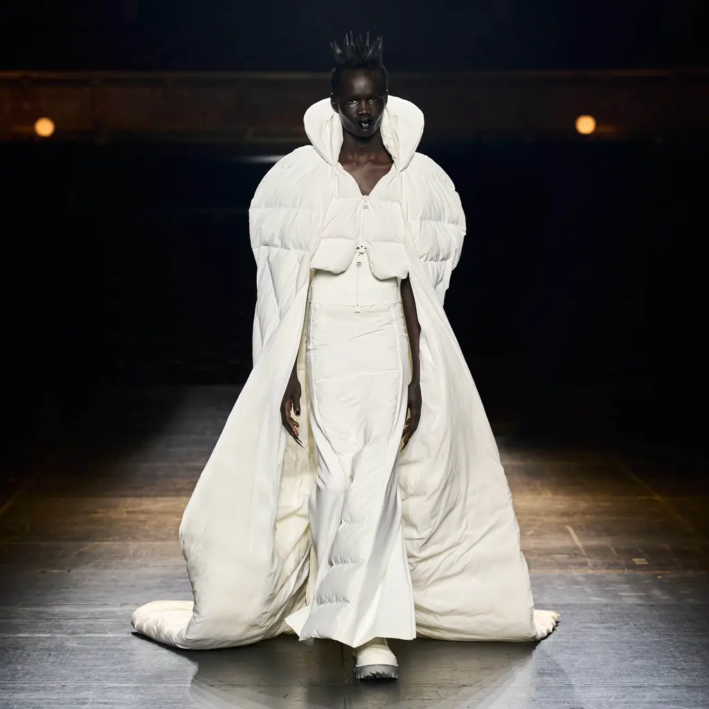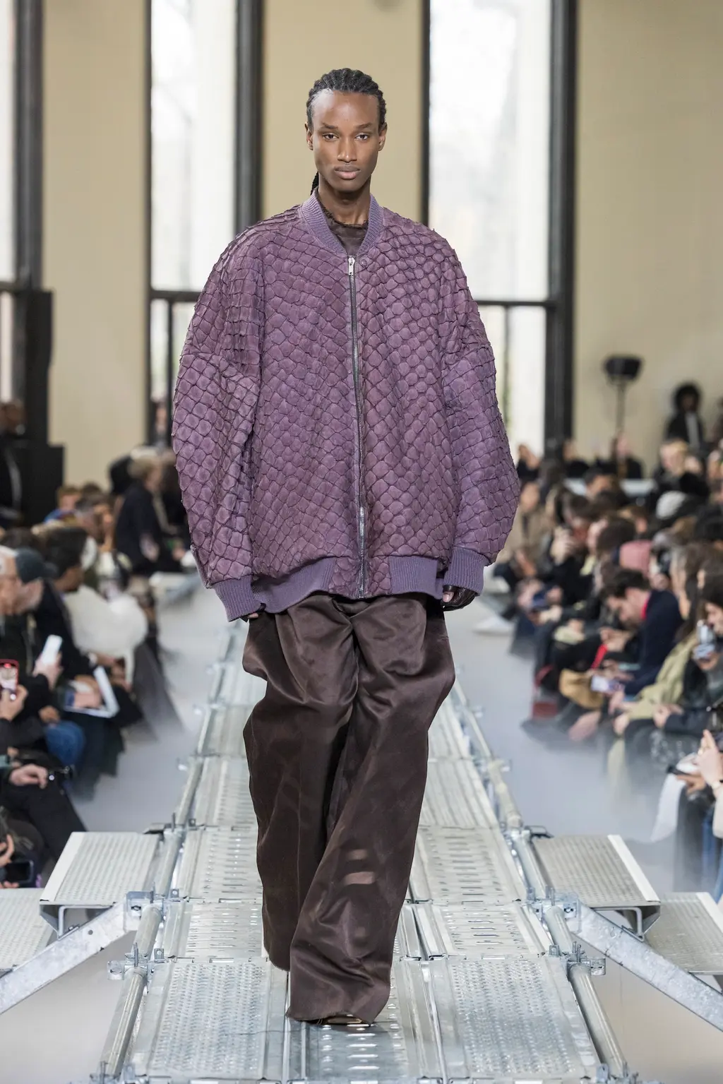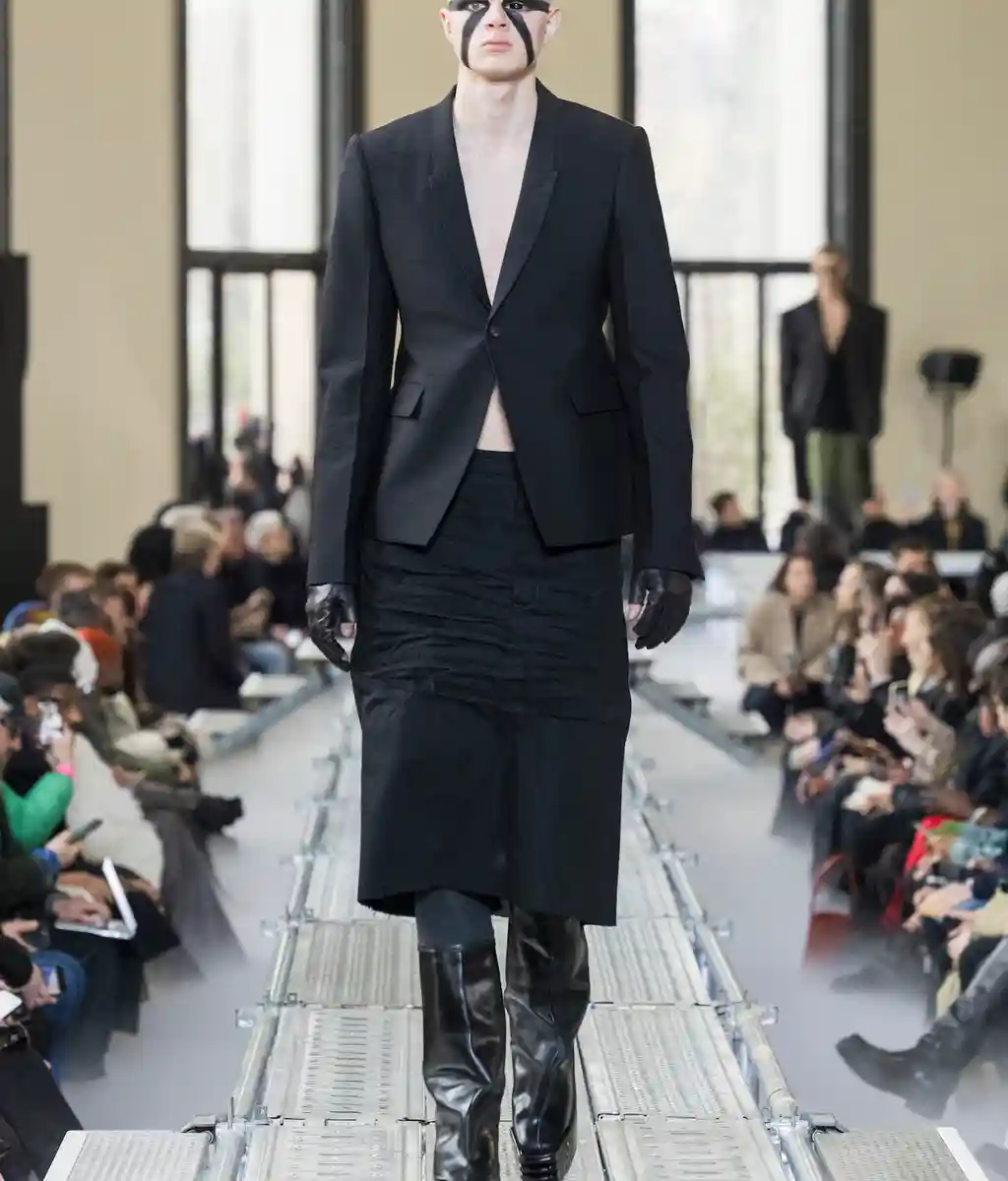 At Rick Owens’ usual venue, Palais de Tokyo, this time on a runway constructed from industrial metal scaffolding that allowed Owens’ models to tower above the audience, elevated higher still by their platform boots.