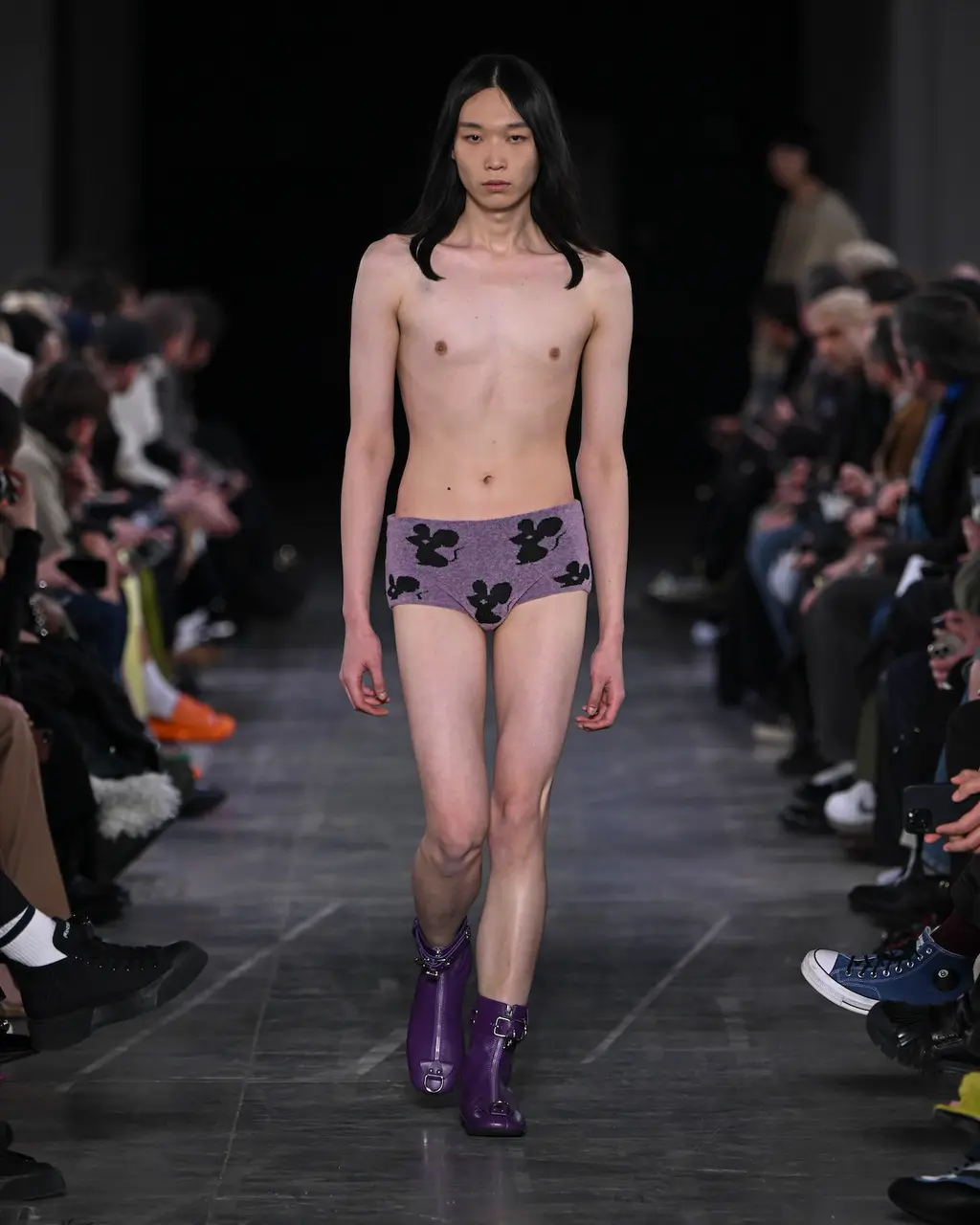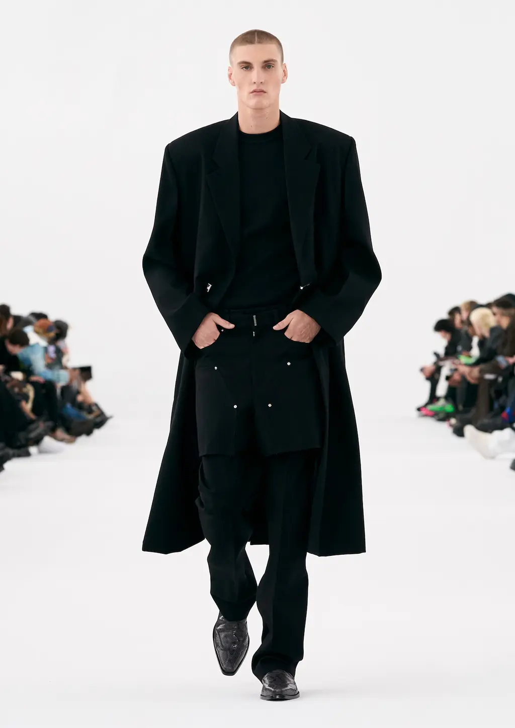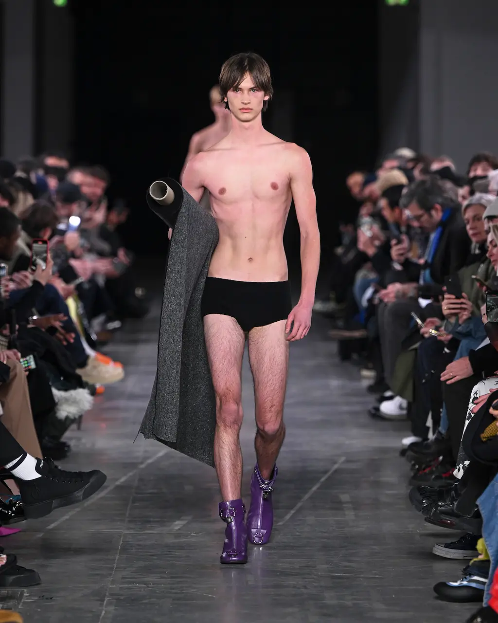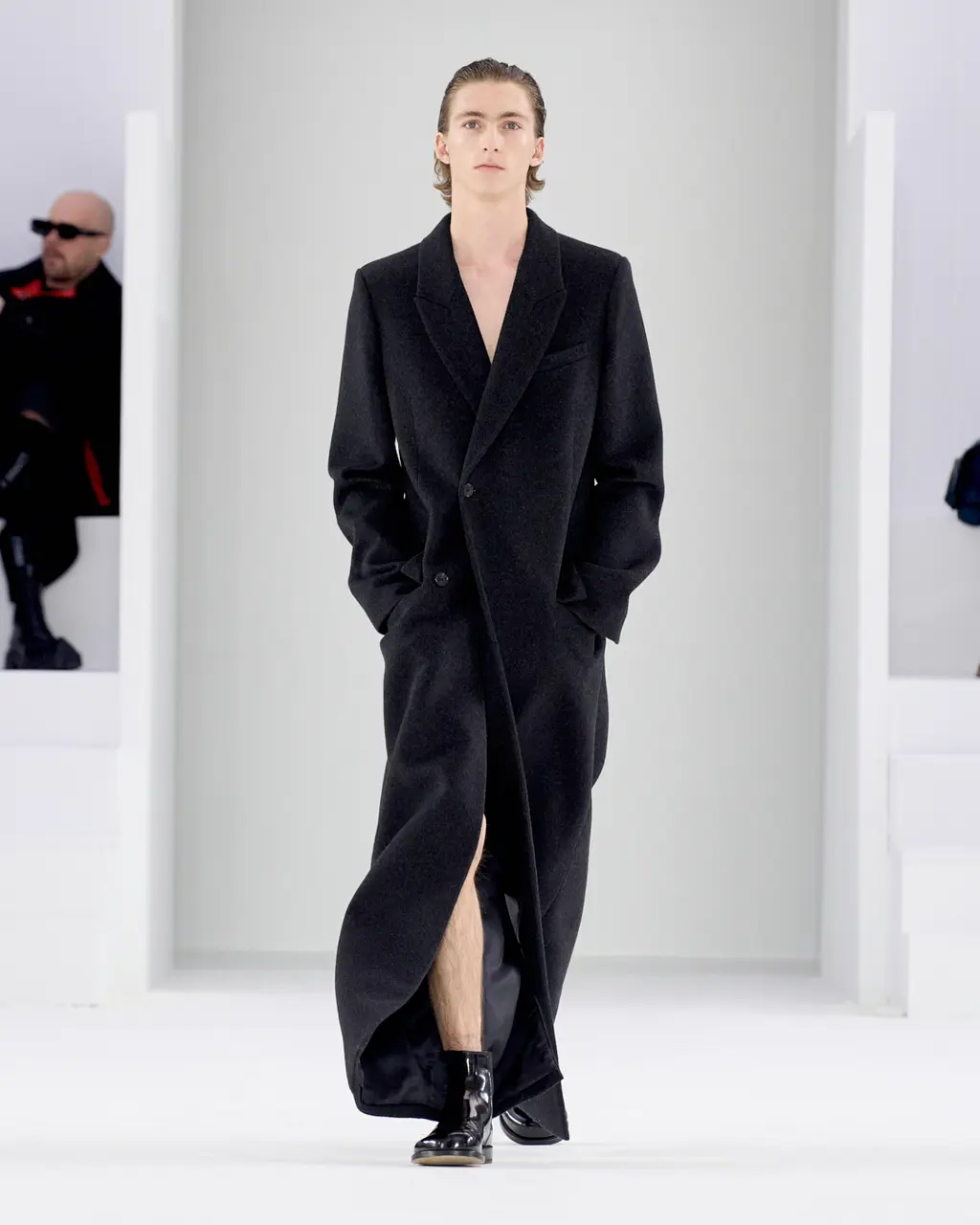 At Rick Owens’ usual venue, Palais de Tokyo, this time on a runway constructed from industrial metal scaffolding that allowed Owens’ models to tower above the audience, elevated higher still by their platform boots.