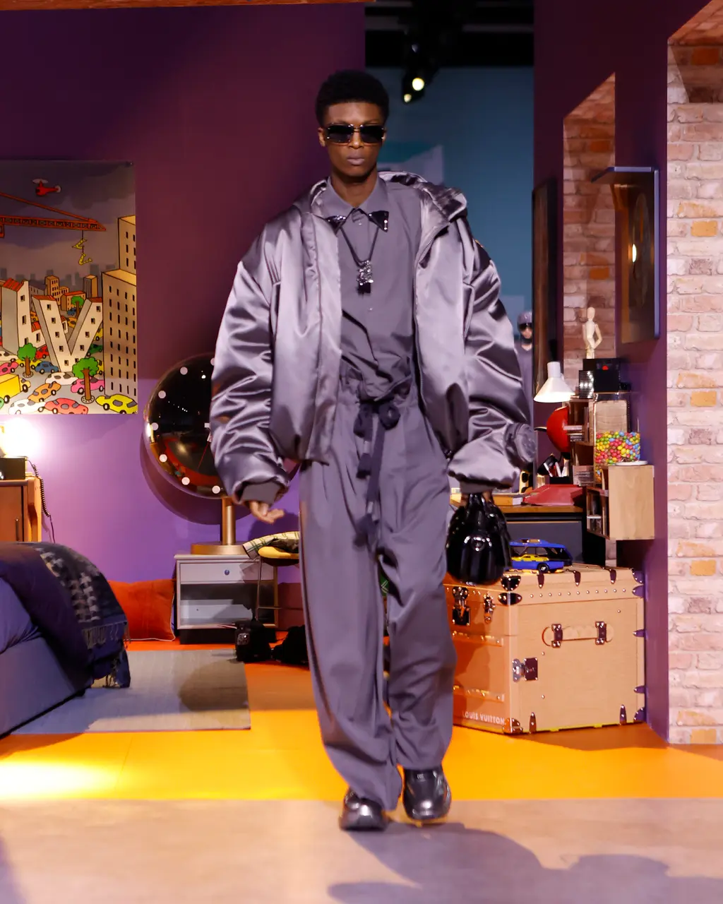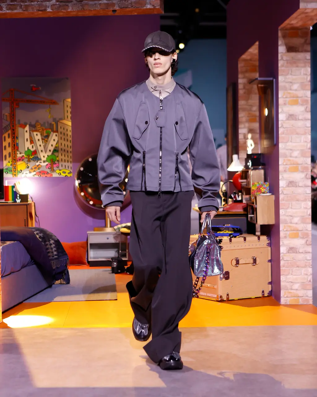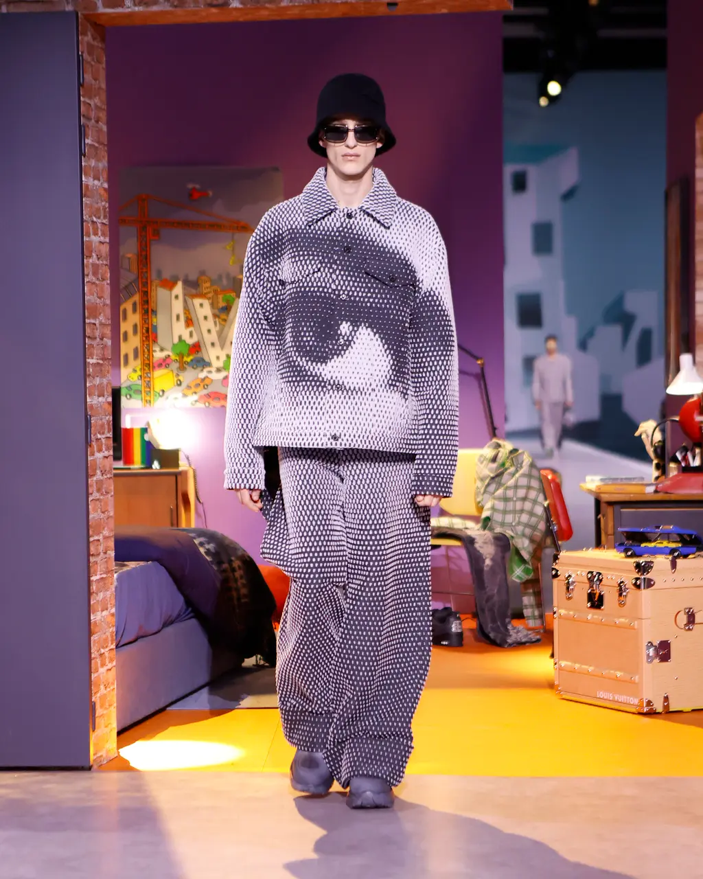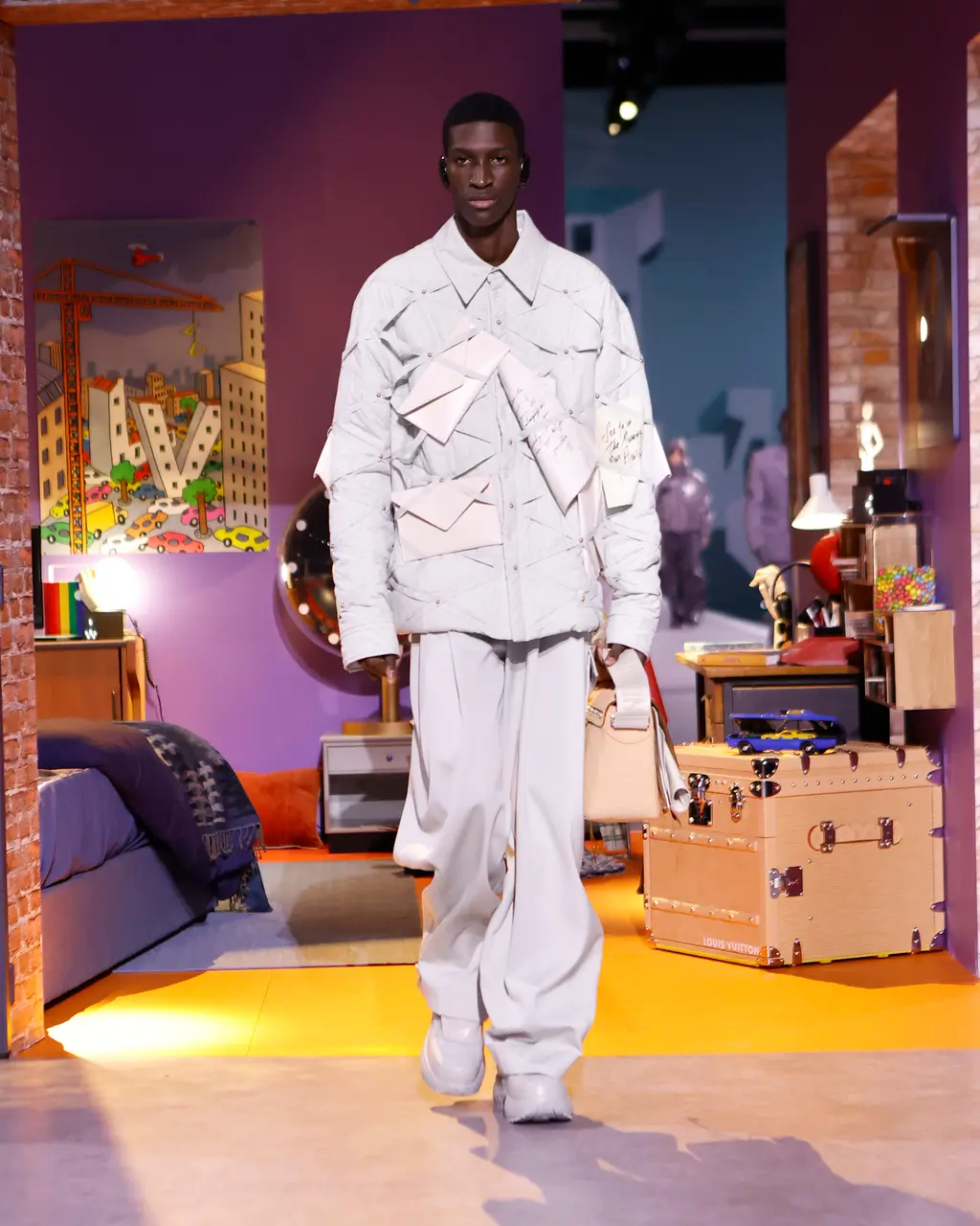 In a space erected within the grounds of the Musée du Louvre. The set design was pure teenage nostalgia: the house built by filmmakers Michel and Olivier Gondry took guests on a whistle-stop tour of the formative touchpoints of a teenage boy’s life. Think: bunk beds, books, dart boards, football-shaped nightlights, computer games, Barbie dolls, lava lamps, drum kits and guitars. There’s also something to be said about the significance of a “house”, a place where people, families, friends and co-workers come together under one roof to cohabit, connect and collaborate. Which is exactly what the Louis Vuitton studio team – all of whom stepped out onto the runway for the final bow – did today.