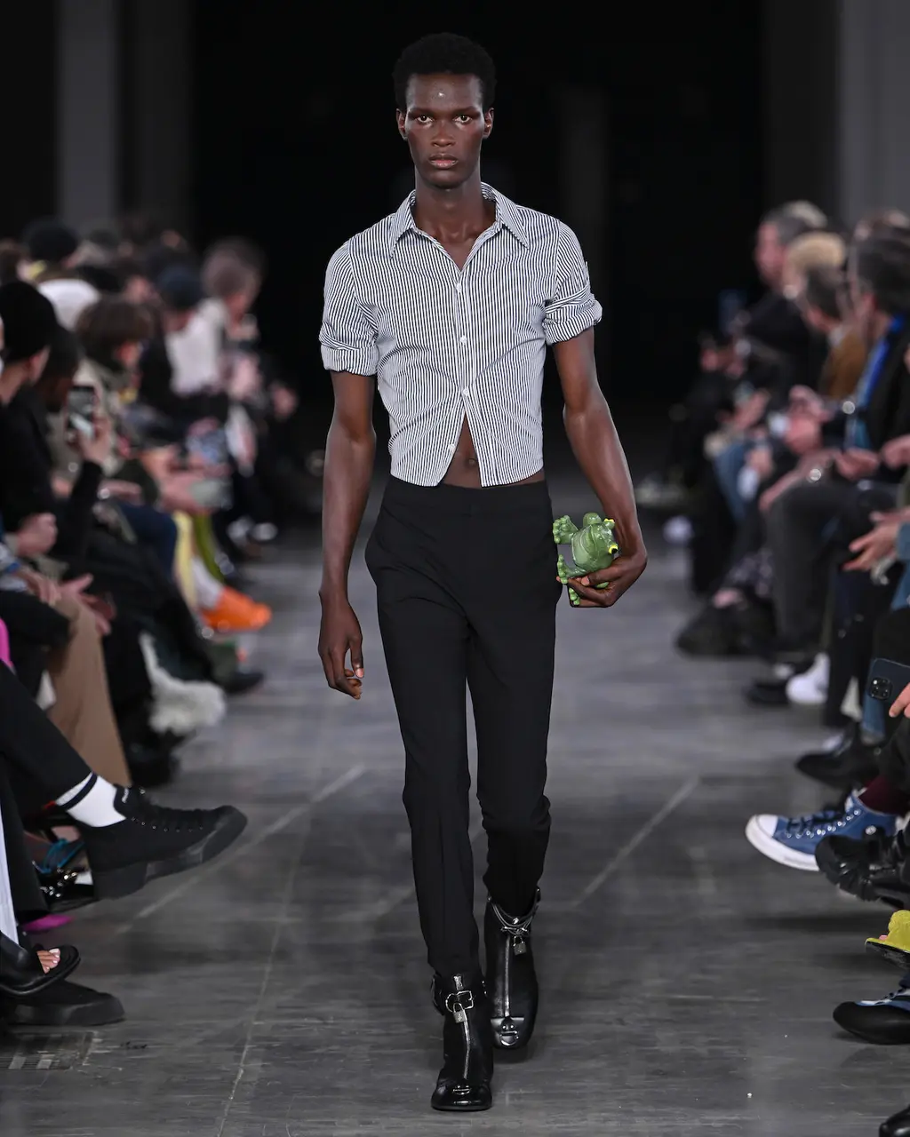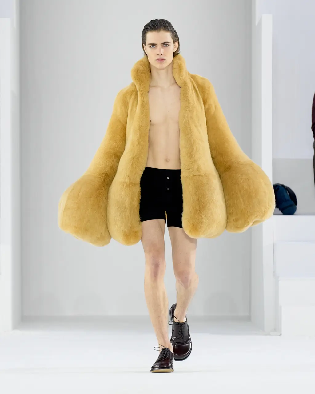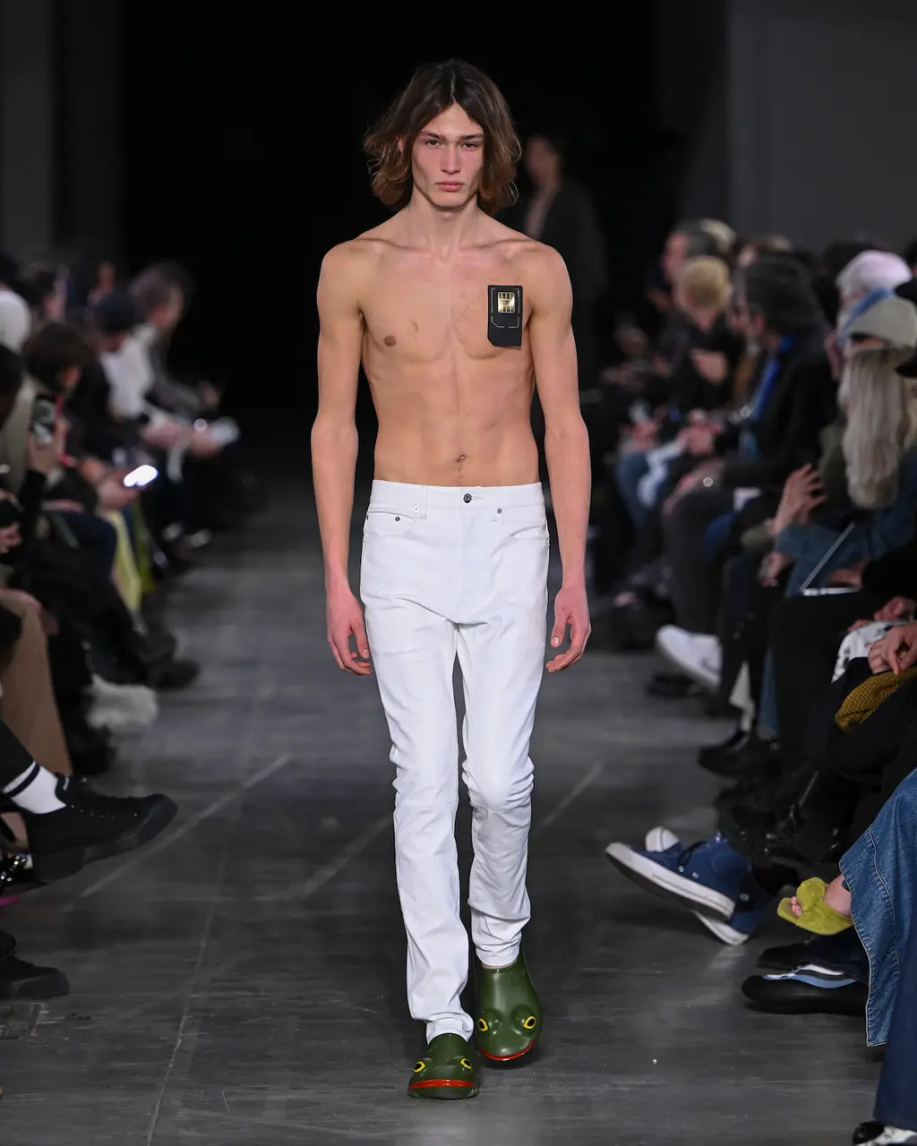 Like Prada before it, JW Anderson was all about reducing clothes to their simplest form. Backstage, Anderson talked about “starting afresh … this idea of it being something that is a raw state of mind. The sweater is a sweater. The trouser is a trouser. The jacket is a jacket. There’s no kind of over-explanation in the look.” At its most primitive form, such as the opening look, this took the shape of a barely dressed model carrying a roll of raw fabric. And at its most fantastical and headline grabbing, a return to the primal saw the designer plunder his childhood and bring back the Wellipet; a frog-like shoe worn by Anderson (and Prince Harry) in his youth. They “took a bit of time and persuading,” by all accounts. Next season: open-toad.