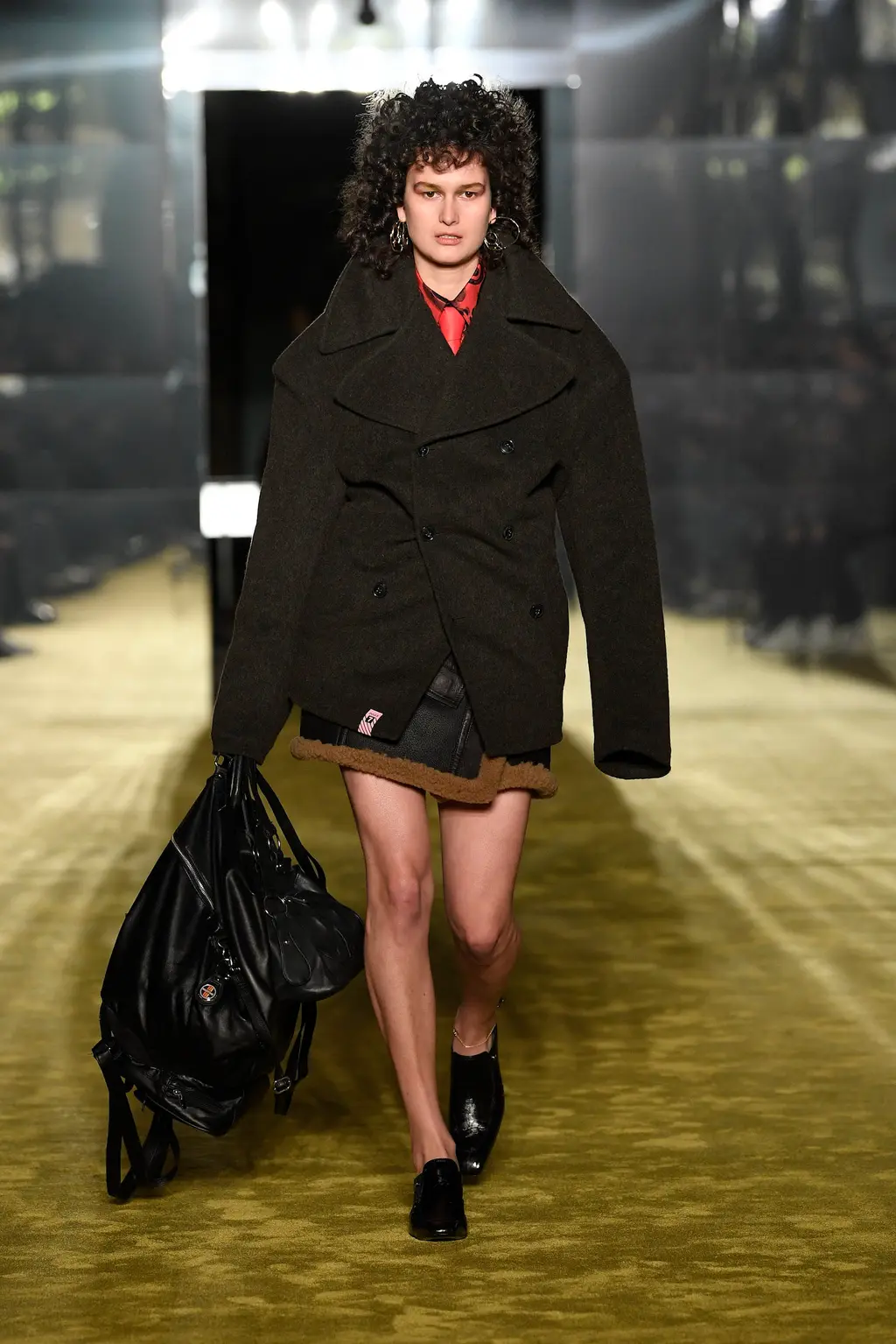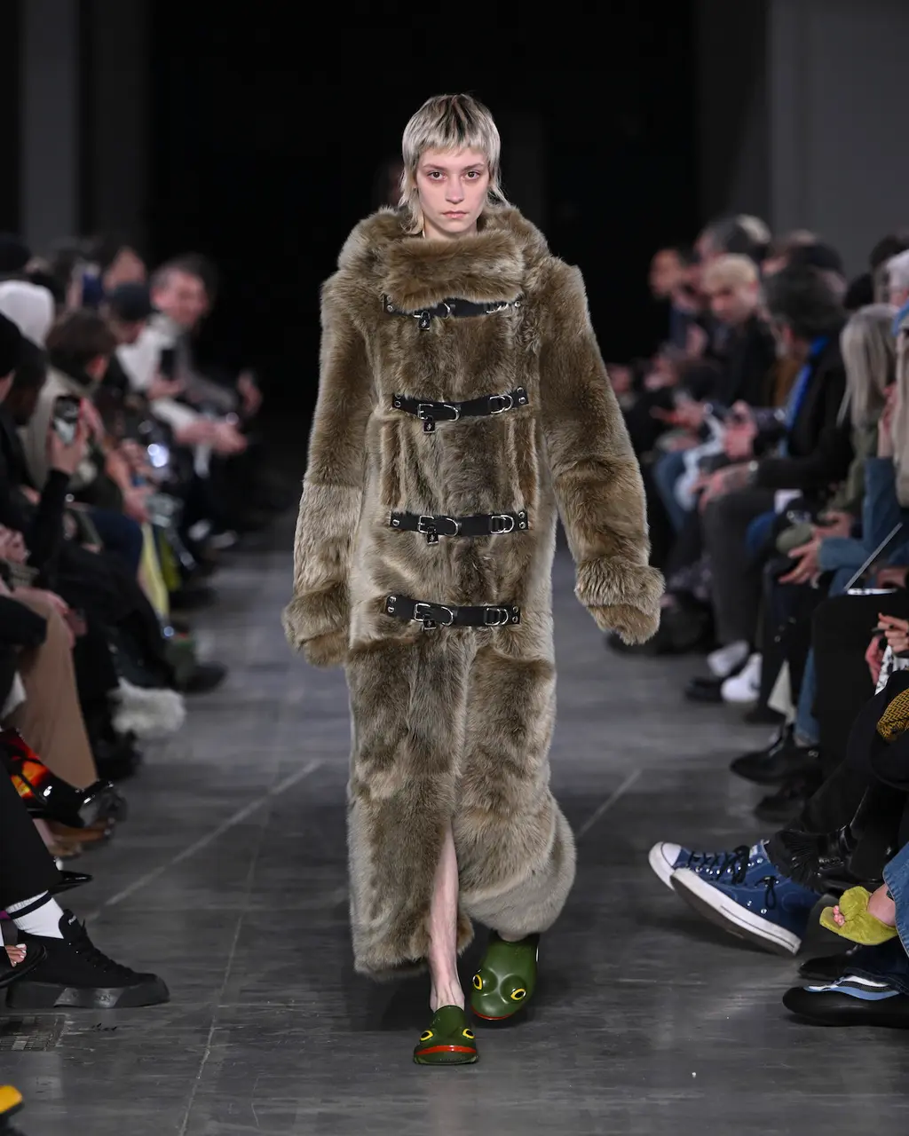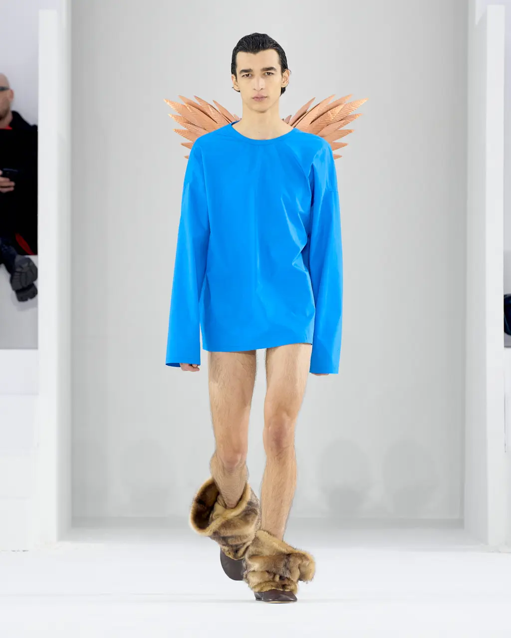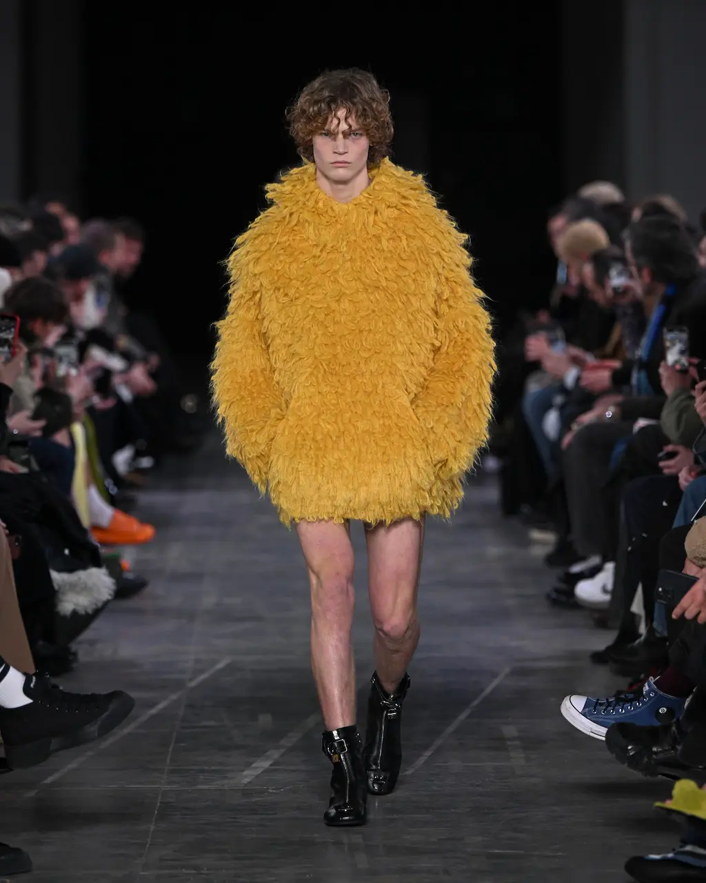Like Prada before it, JW Anderson was all about reducing clothes to their simplest form. Backstage, Anderson talked about “starting afresh … this idea of it being something that is a raw state of mind. The sweater is a sweater. The trouser is a trouser. The jacket is a jacket. There’s no kind of over-explanation in the look.” At its most primitive form, such as the opening look, this took the shape of a barely dressed model carrying a roll of raw fabric. And at its most fantastical and headline grabbing, a return to the primal saw the designer plunder his childhood and bring back the Wellipet; a frog-like shoe worn by Anderson (and Prince Harry) in his youth. They “took a bit of time and persuading,” by all accounts. Next season: open-toad.