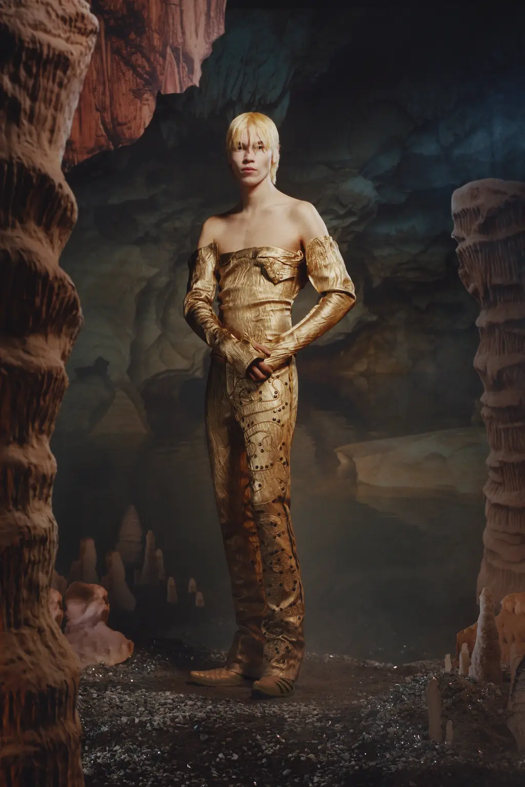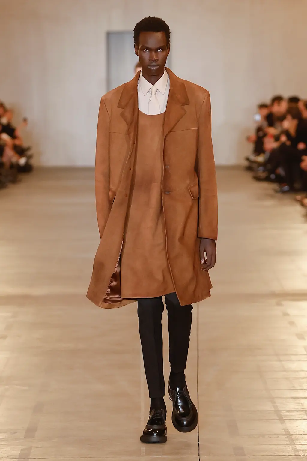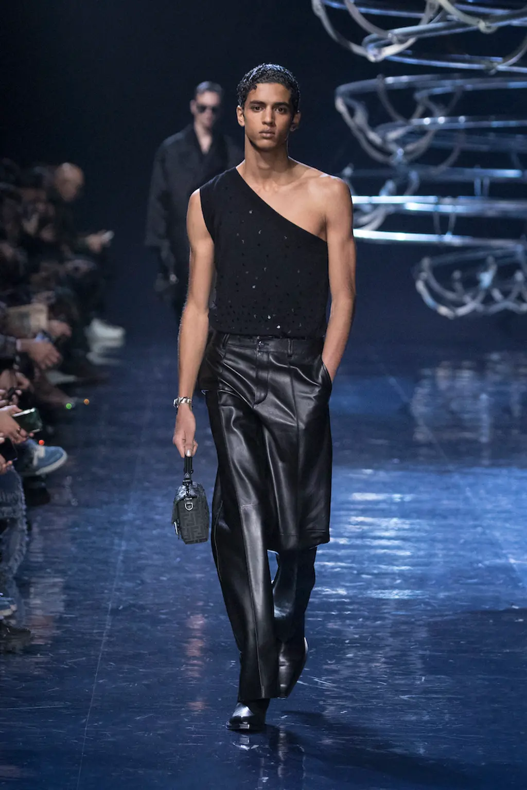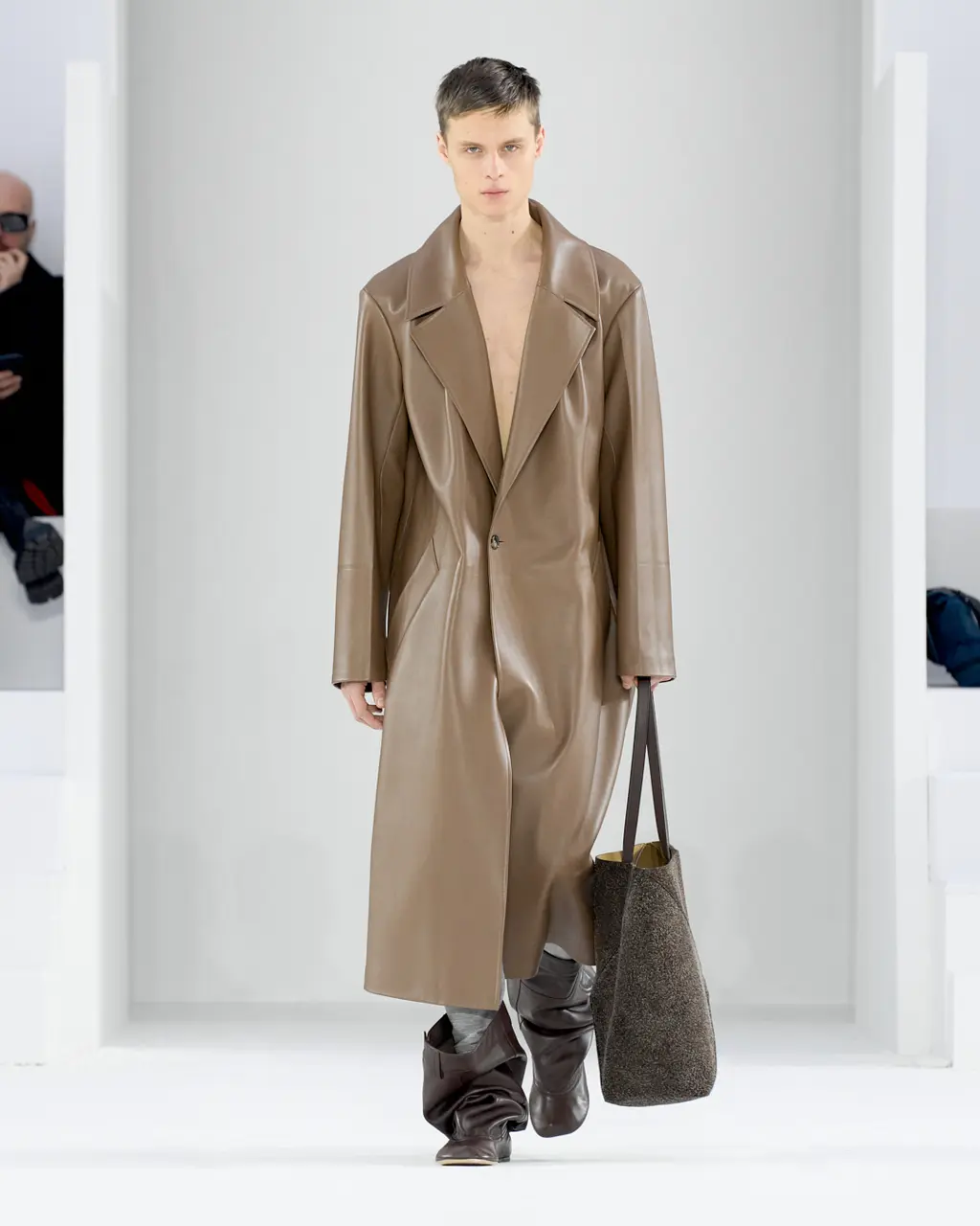 You know what they say: three is a trend. Like Prada and Jonathan Anderson’s namesake label, this Loewe collection also favoured a new found simplicity. Anderson spoke of challenging the idea of menswear and its subtlety and using fabrics that don’t exist post-show, specifically a silver top that was given its shape via the use of sand, metal jackets crafted from copper, puter and vellum (“I liked the idea of freezing a garment in time”) and a full leather look (“it forces you to have attitude”).