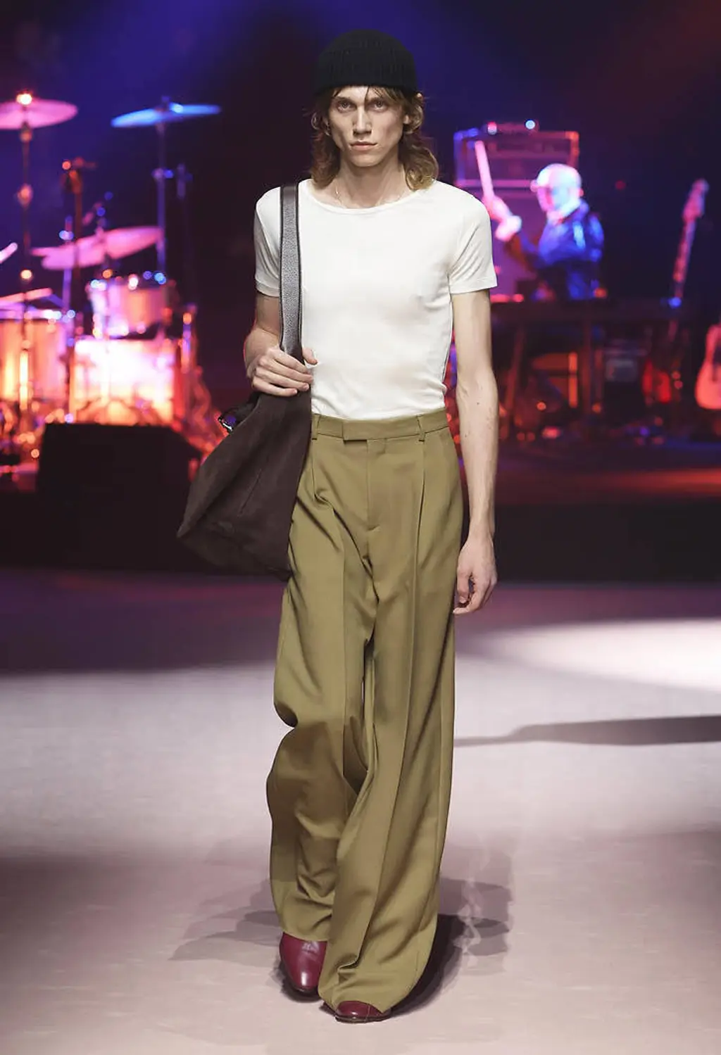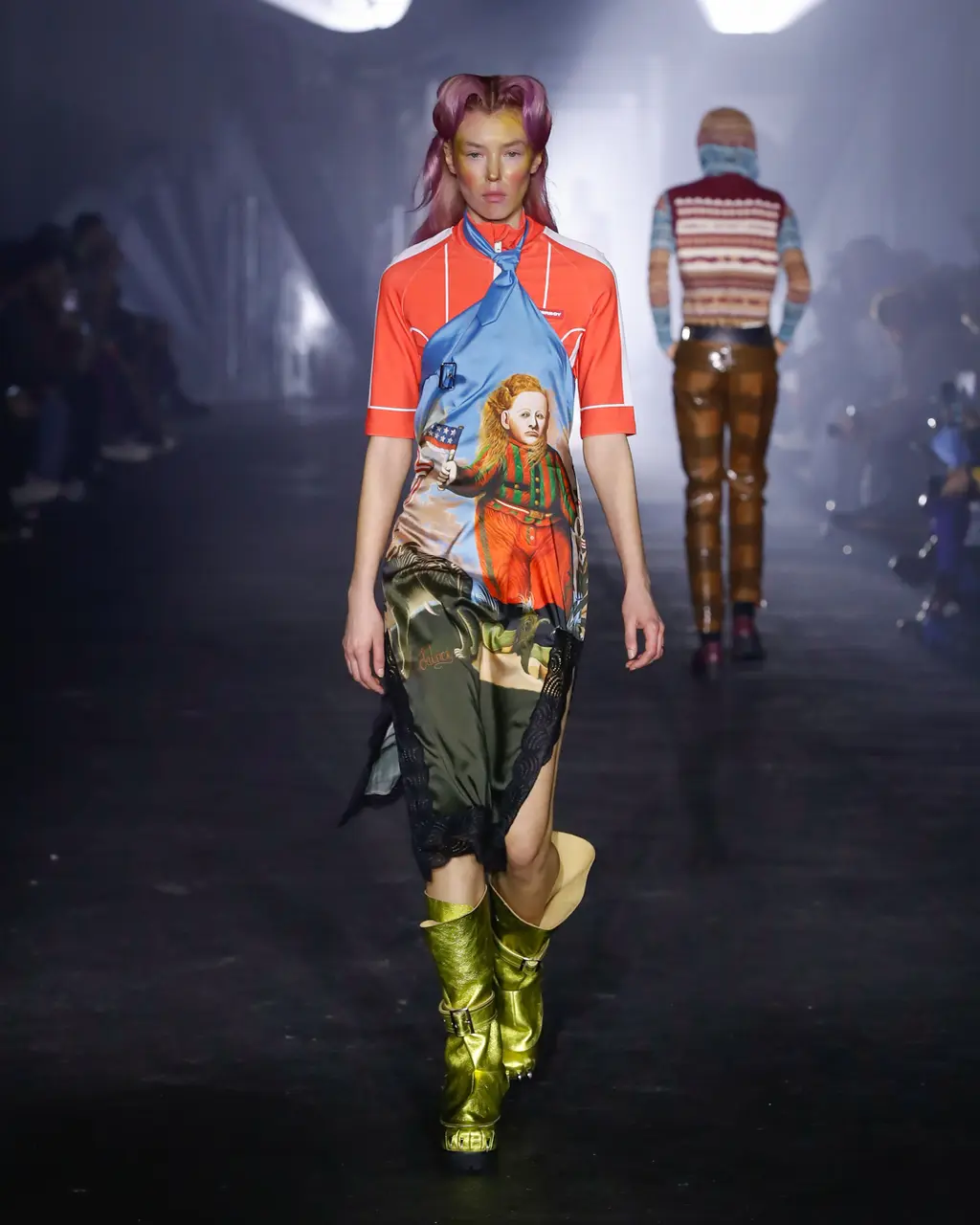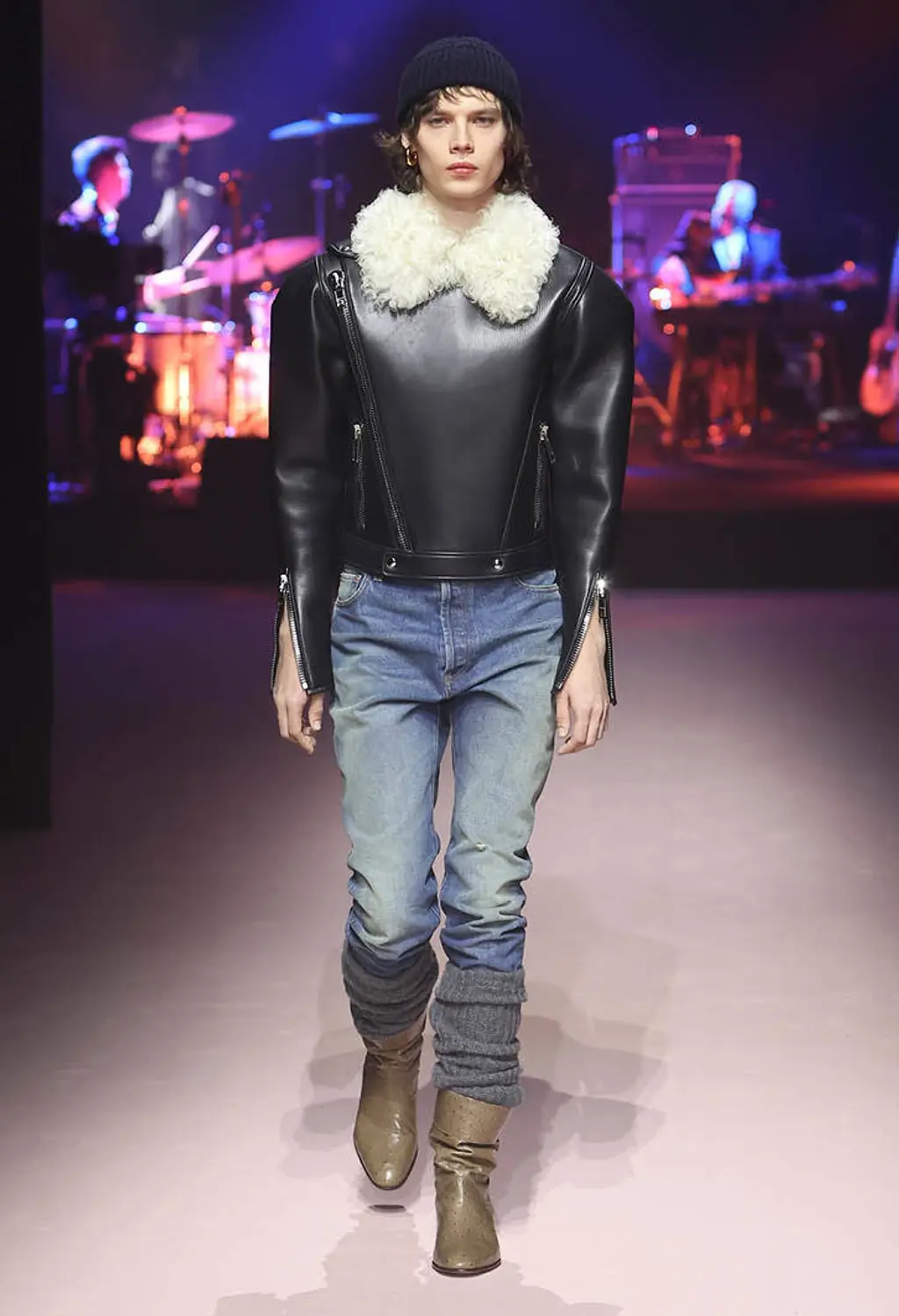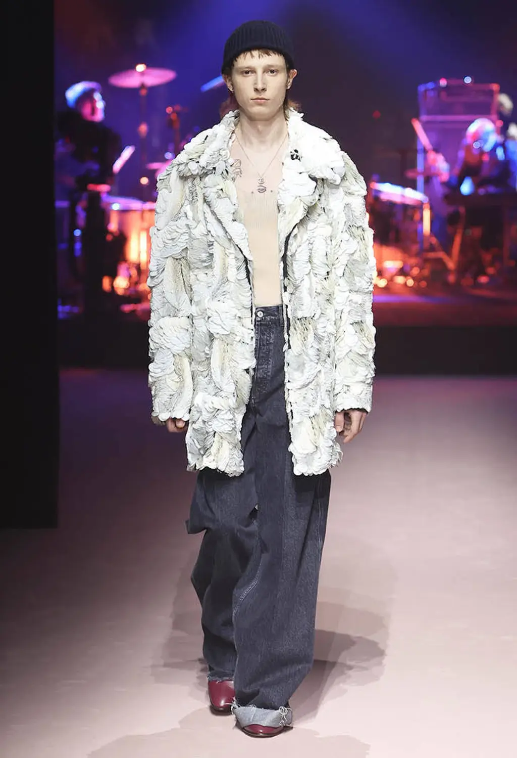 God knows, some big room somewhere. It was quite dark inside until the lights came on and illuminated a teenage bedroom, filled with Pac-Man paraphernalia, at the end of the runway. “Junior?” yelled a voice off-stage as a floppy-haired model pulled on a pair of pink cowboy boots and fringed jacket. “Get out of that bed if you ever want to be somebody!” Then, for some reason, the Grease soundtrack came on and– oh, who cares, it’s so much fun.